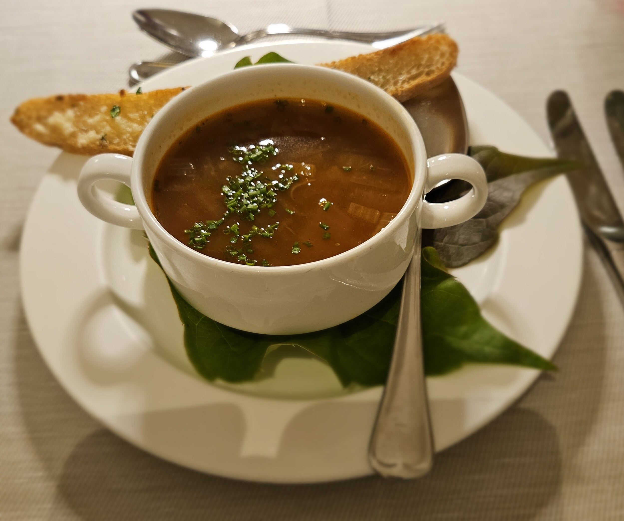 Nach dem obligatorischen Salat ging es weiter mit einer klassischen Zwiebelsuppe mit Kräuter-Paarl-Stick.