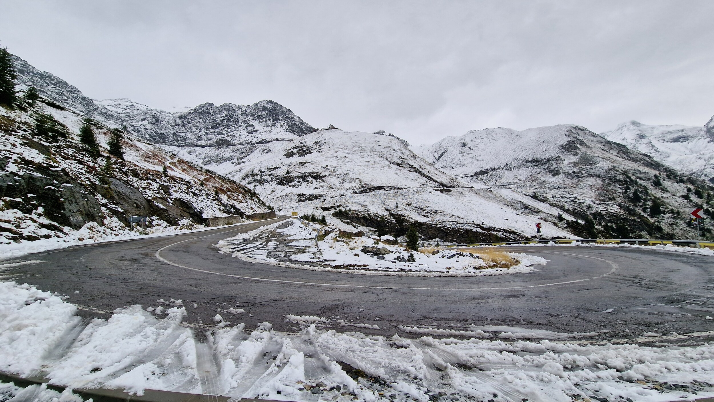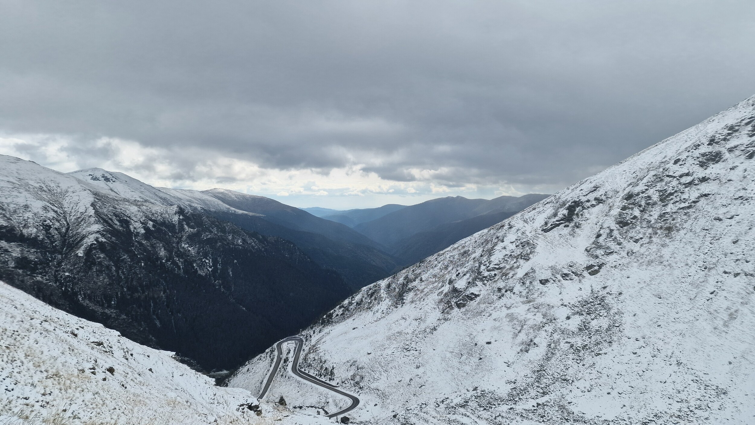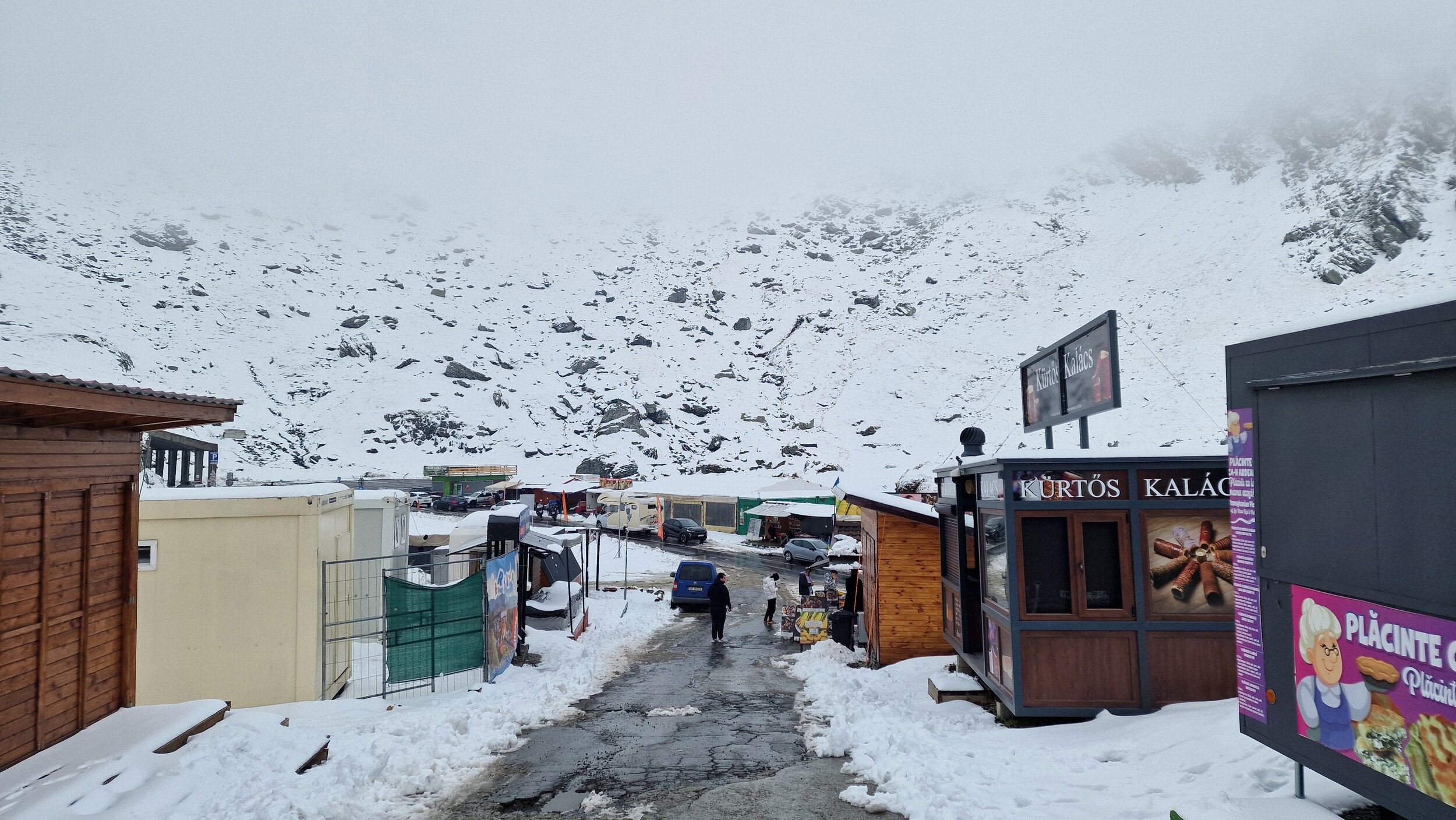 Die weitere Fahrt und der weitere Urlaub waren dann Ursi frei und so schlängelten wir uns langsam, aber sicher der Schneefallgrenze und der Passhöhe entgegen. Auf der Passhöhe werden Nord und Südseite per Tunnel verbunden. Nach einer langen und beeindruckenden Fahrt haben wir nun also die Passhöhe erreicht. Oben lagen 15-20 Zentimeter Schnee auf den Parkplätzen doch zu unserem Glück wurde die Straße geräumt. Da die Parkplätze nicht geräumt werden, mussten wir uns dann einfach irgendwo hinstellen, aber da es jedem so ging war das kein Problem. Oben schneite es ab und zu nochmal leicht und es war recht nebelig aber dennoch deutlich besser als wir es vor einigen Stunden noch erwartet hatten. Wir aßen noch einen Mais, was in Rumänien einfach dazugehört, schlugen uns durch die Weihnachtsmarktartigen Touriläden und machten einige Bilder. Dann ging es für uns schon wieder nach unten in Richtung Sibiu. Die Rückfahrt war bis auf das spektakuläre Panorama recht ereignislos, also keine Ursi-Sichtung mehr.