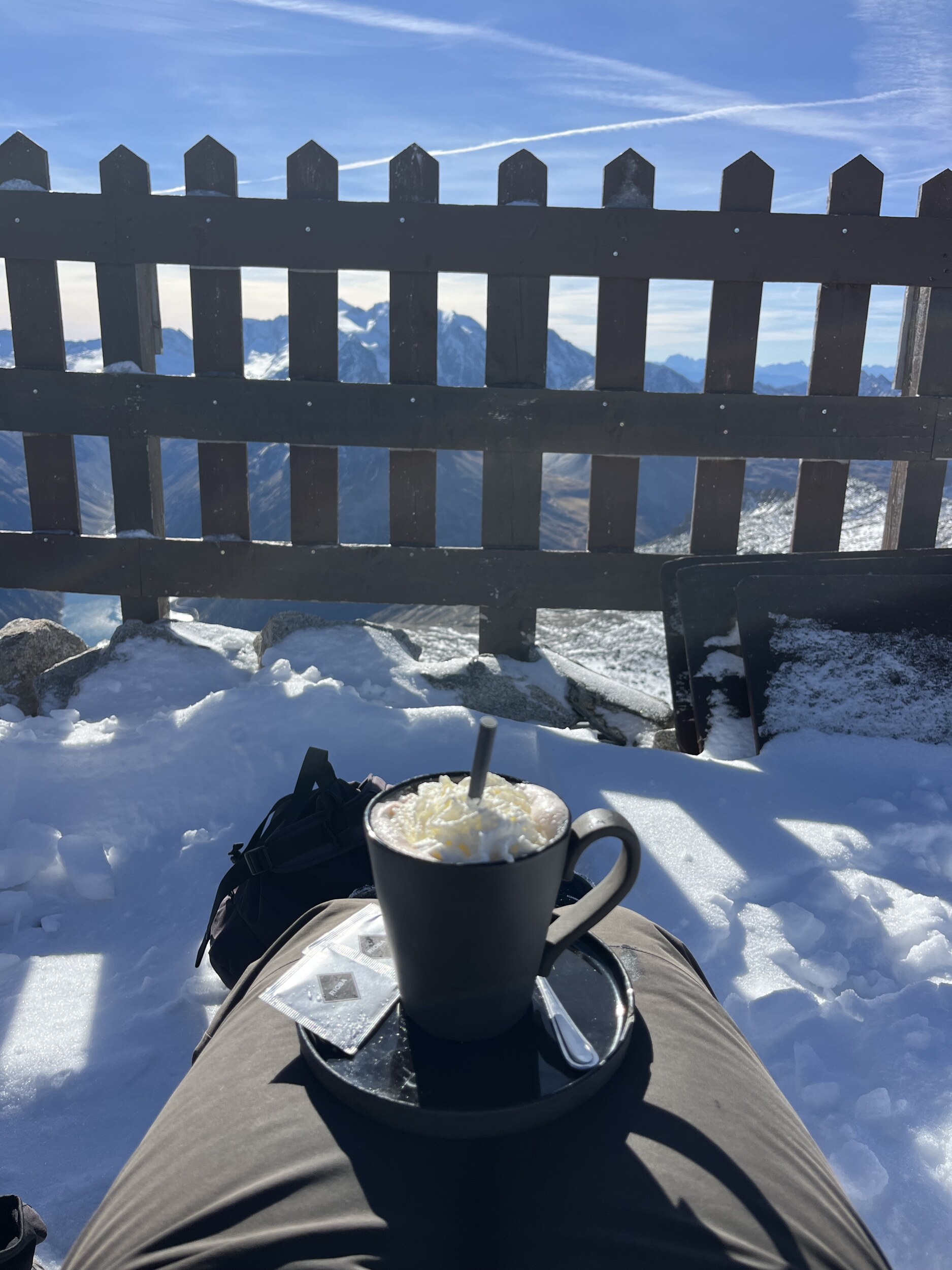 Immer wenn ich freiwillig in eine Beiz gehe, ist irgendwas nicht gut… so auch heute. Und erst noch mit dem kräfteraubenden Aufstieg zur Gletscherhütte. Mit Blick zum Sassolungo: Edit 13.30 Uhr: