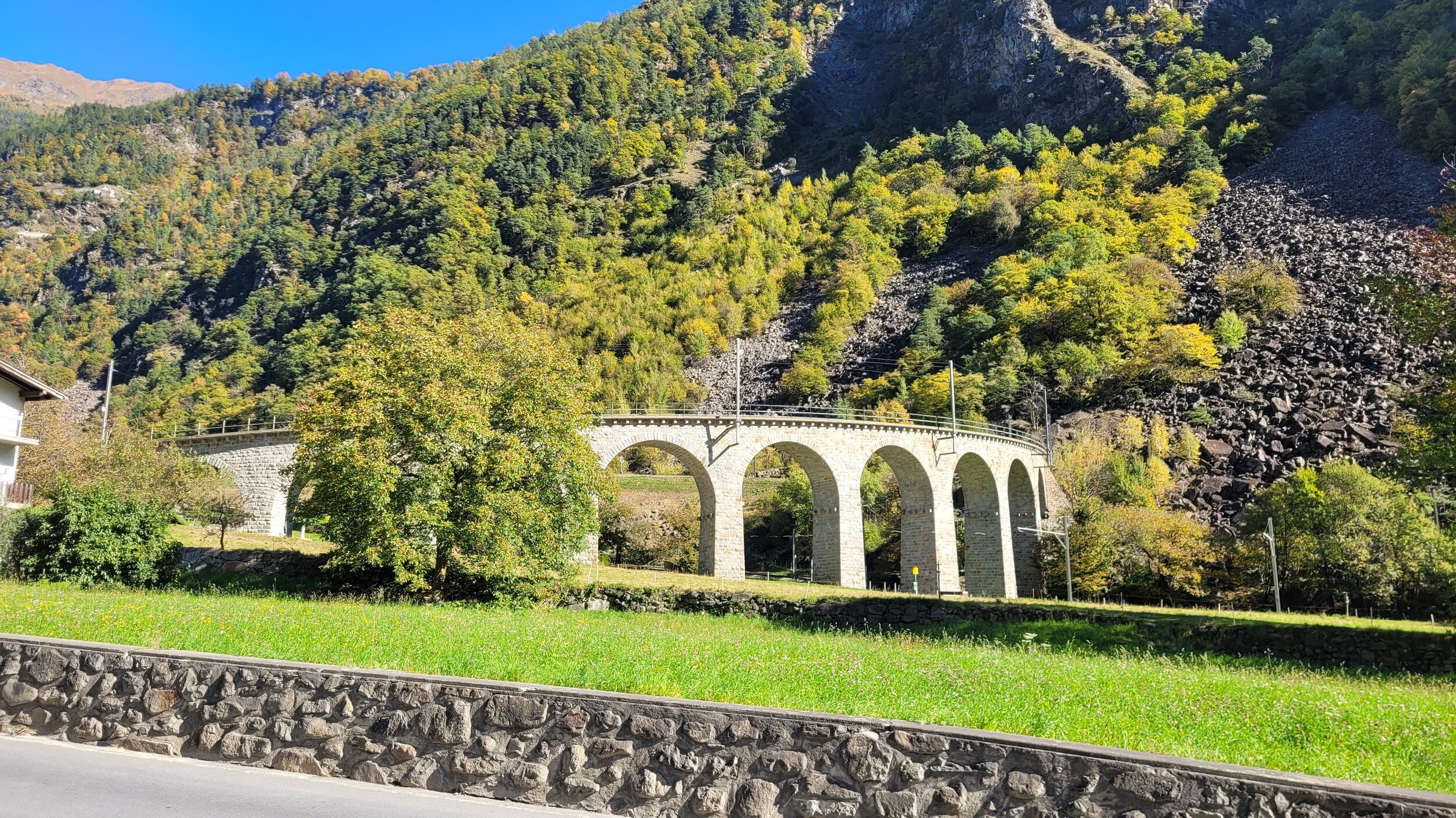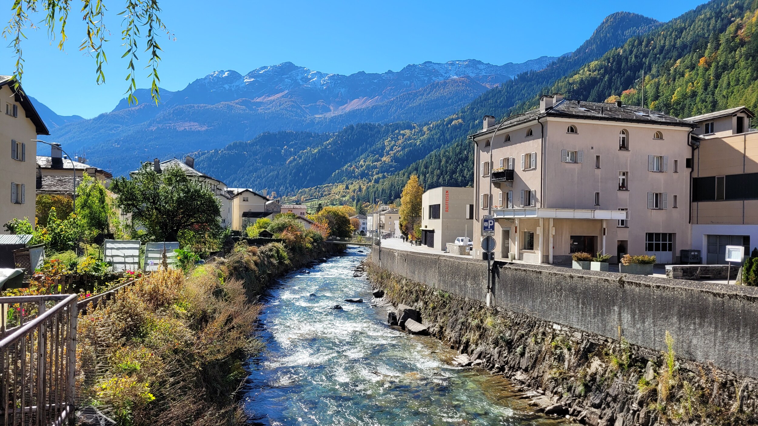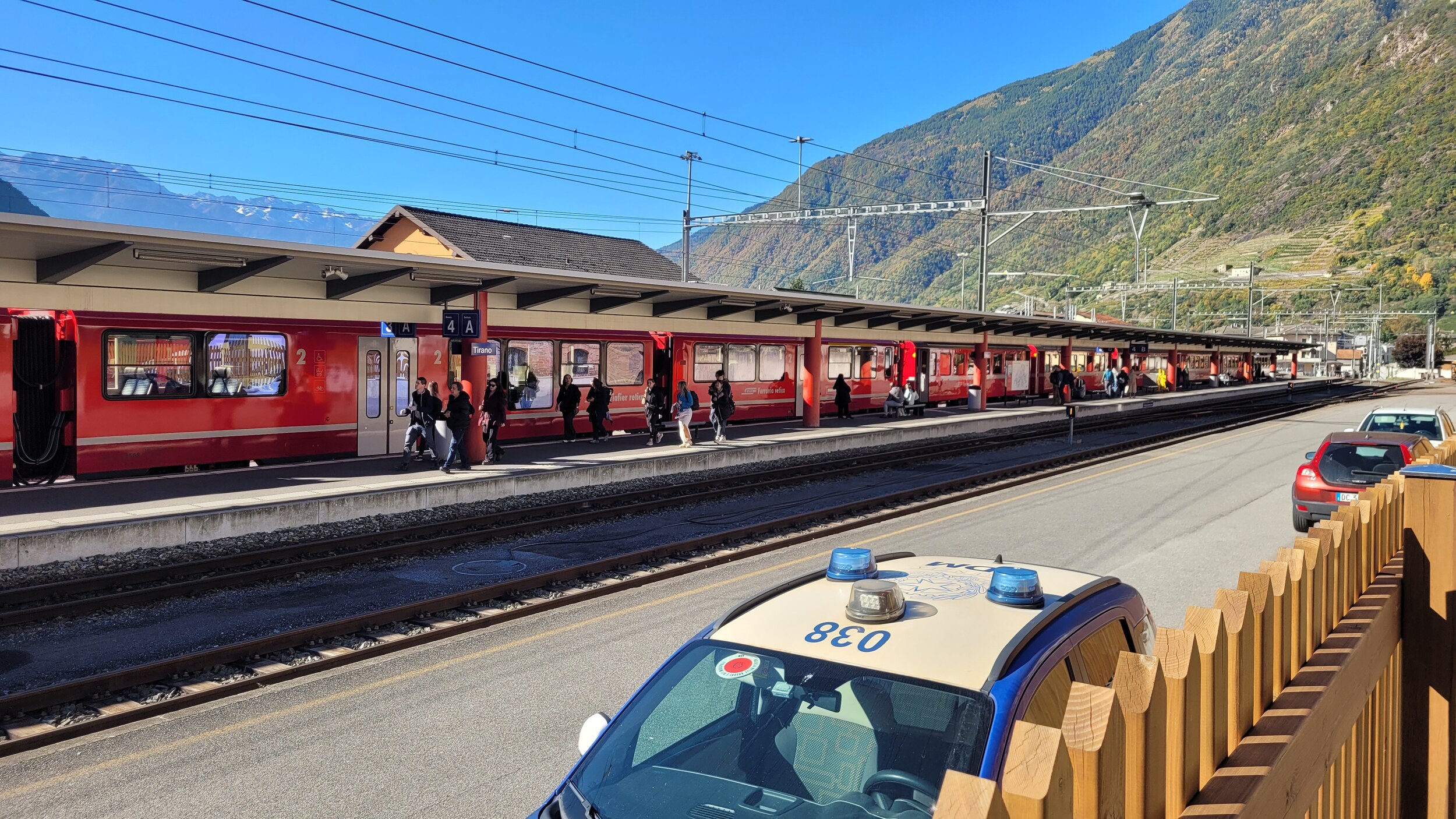 Tirano war etwas einladender mit breiten Alleen .. .. und sonntags geöffneten Supermärkten. Am Bahnhof gibt es eine Mini-ZTL, ist allerdings mehr eine Fussgängerzone. Die Rhätische Bahn hat einen eigenen Bahnhof: Danach ging es weiter über die Grenze ins Puschlav, vorbei an dem berühmten 360°-Viadukt in Brusio .. .. zum Lago di Poschiavo.. .. und dem Ort Poschiavo, der ziemlich ruhig war. Zentraler Platz in der Altstadt, es waren auch genügend Cafés und Restaurants offen. Falls sich jemand die Frage stellt..