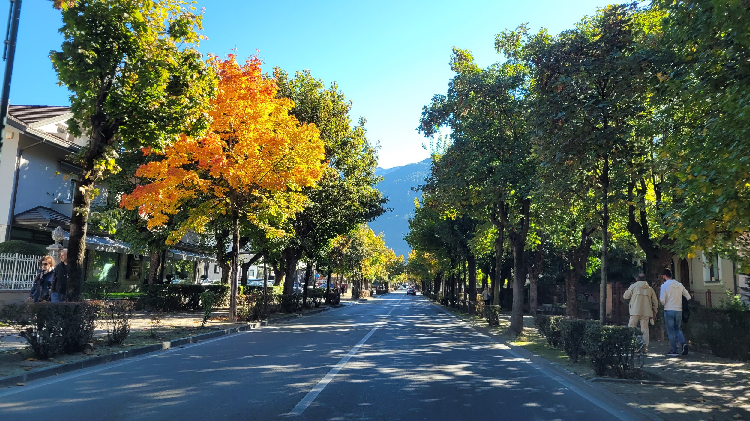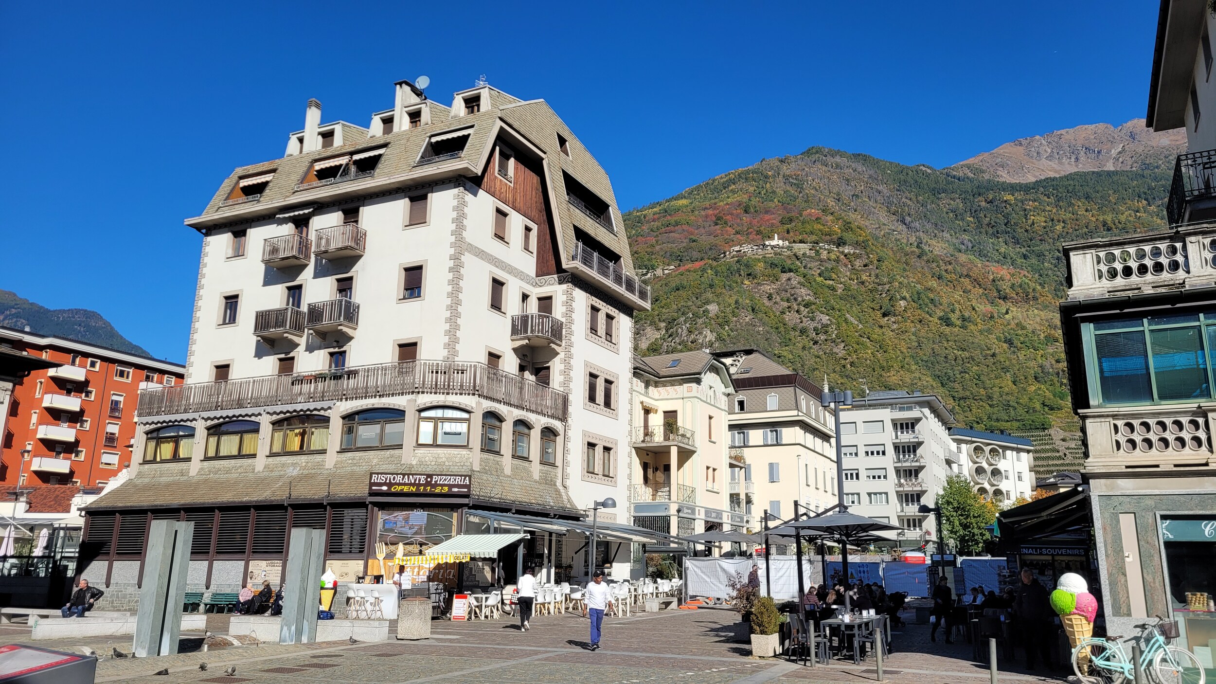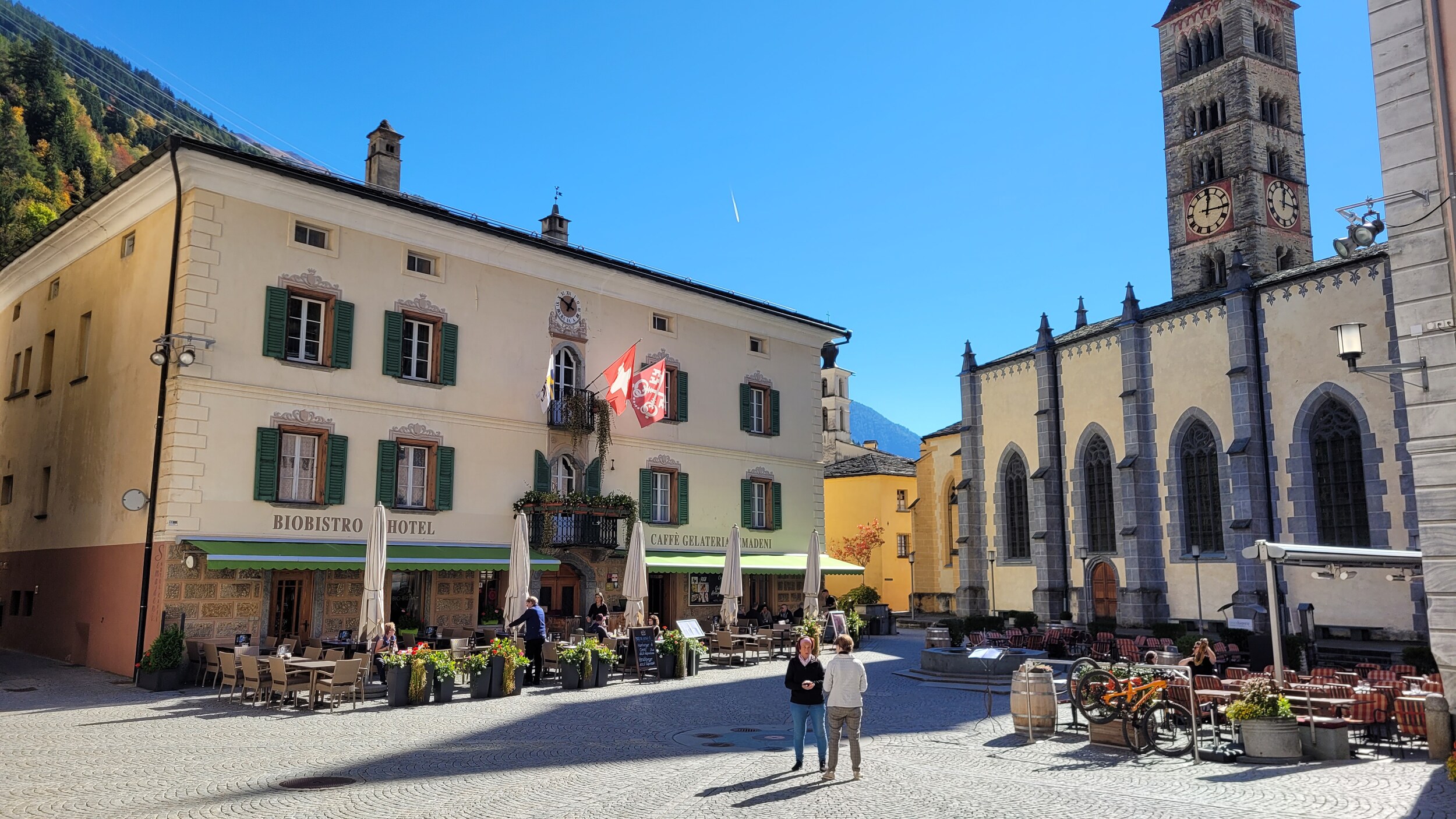 Tirano war etwas einladender mit breiten Alleen .. .. und sonntags geöffneten Supermärkten. Am Bahnhof gibt es eine Mini-ZTL, ist allerdings mehr eine Fussgängerzone. Die Rhätische Bahn hat einen eigenen Bahnhof: Danach ging es weiter über die Grenze ins Puschlav, vorbei an dem berühmten 360°-Viadukt in Brusio .. .. zum Lago di Poschiavo.. .. und dem Ort Poschiavo, der ziemlich ruhig war. Zentraler Platz in der Altstadt, es waren auch genügend Cafés und Restaurants offen. Falls sich jemand die Frage stellt..