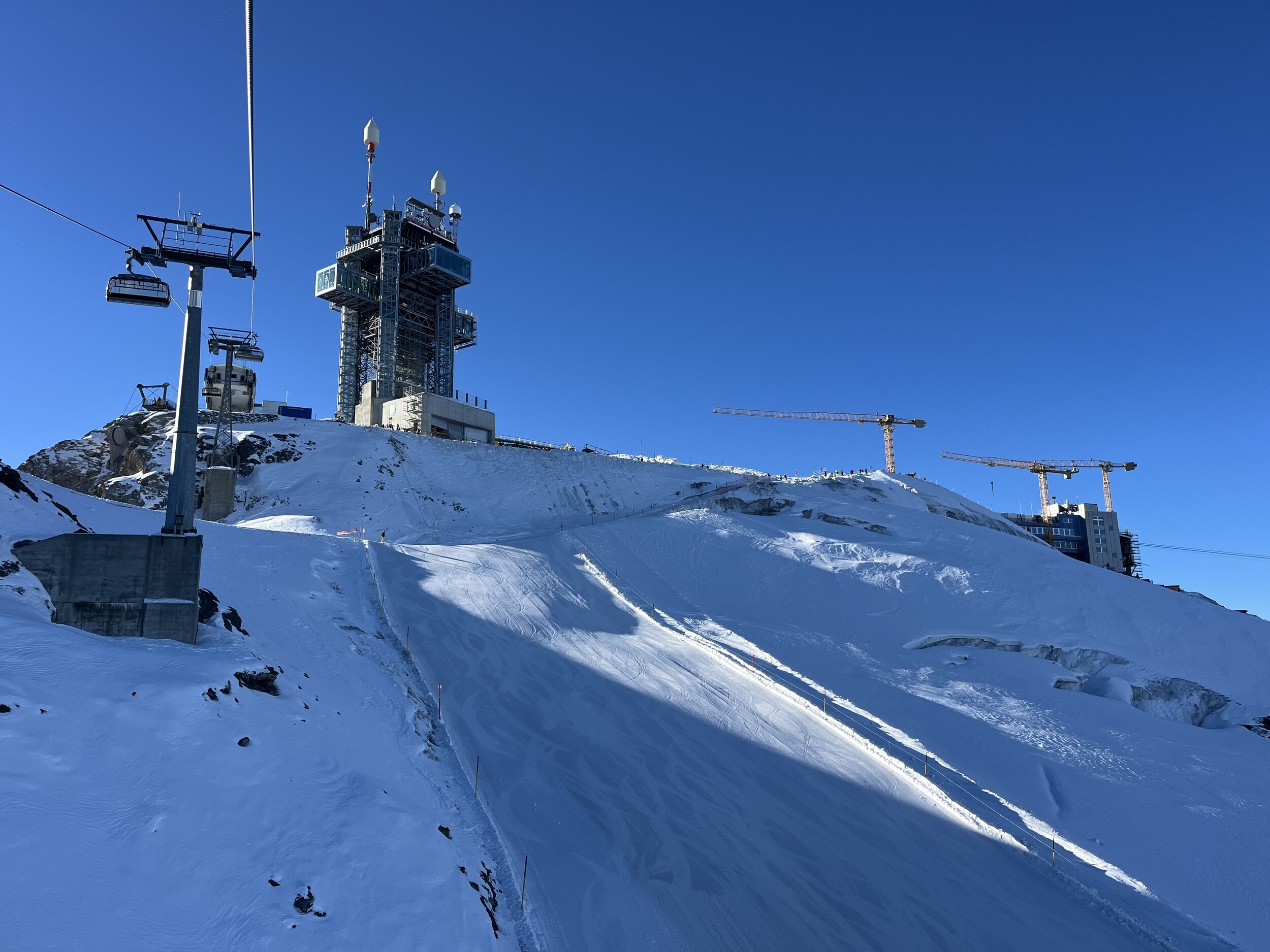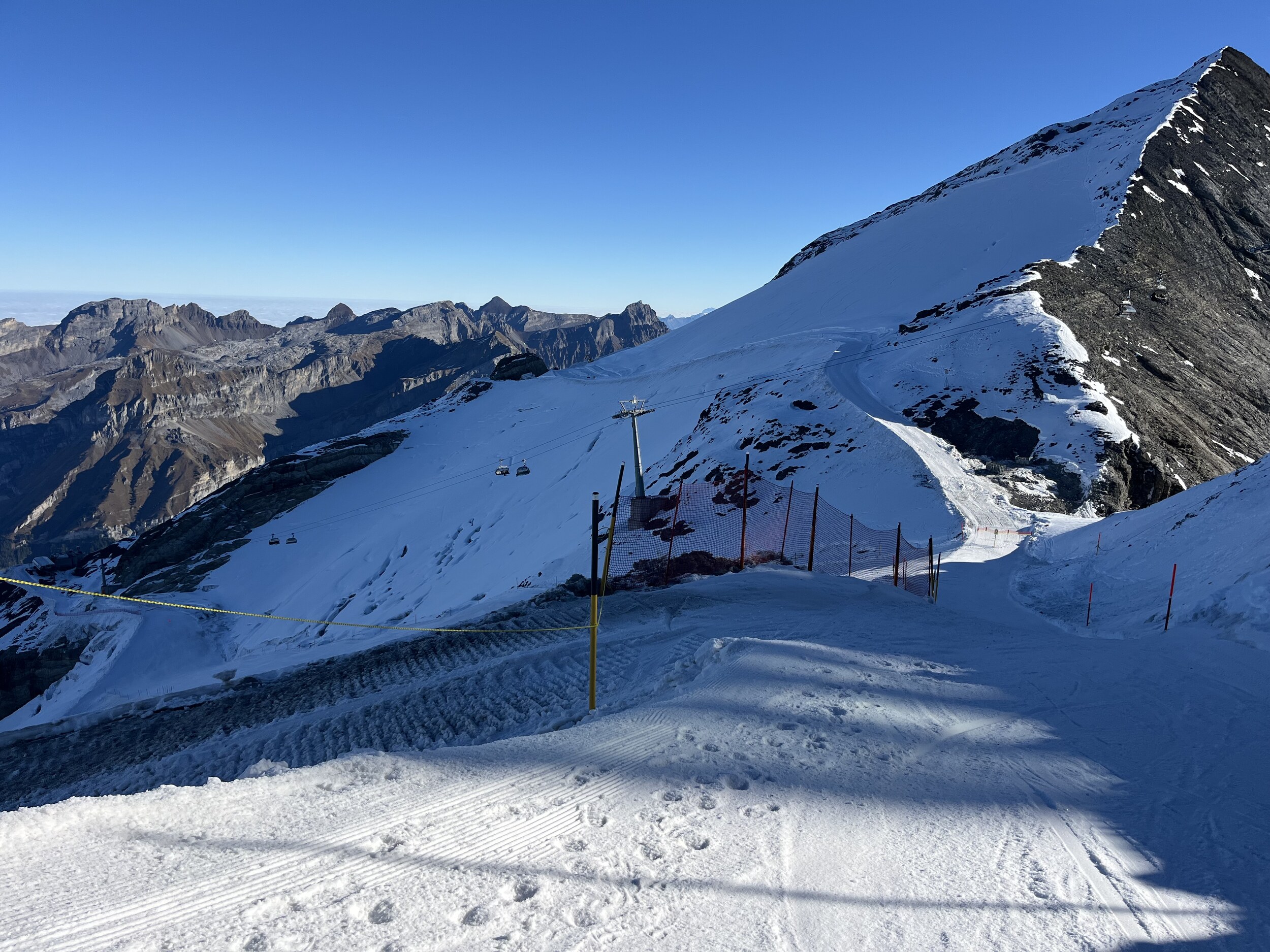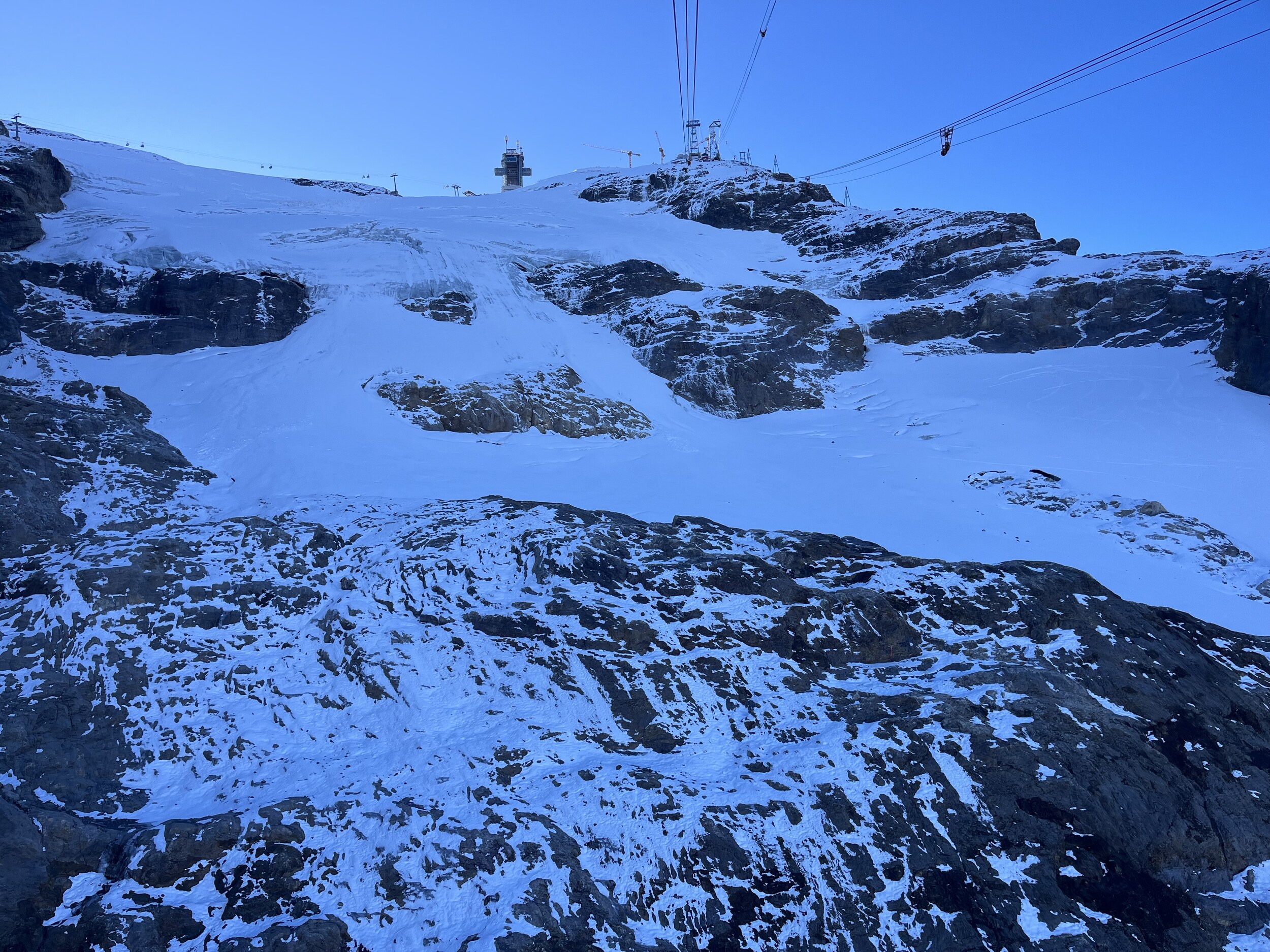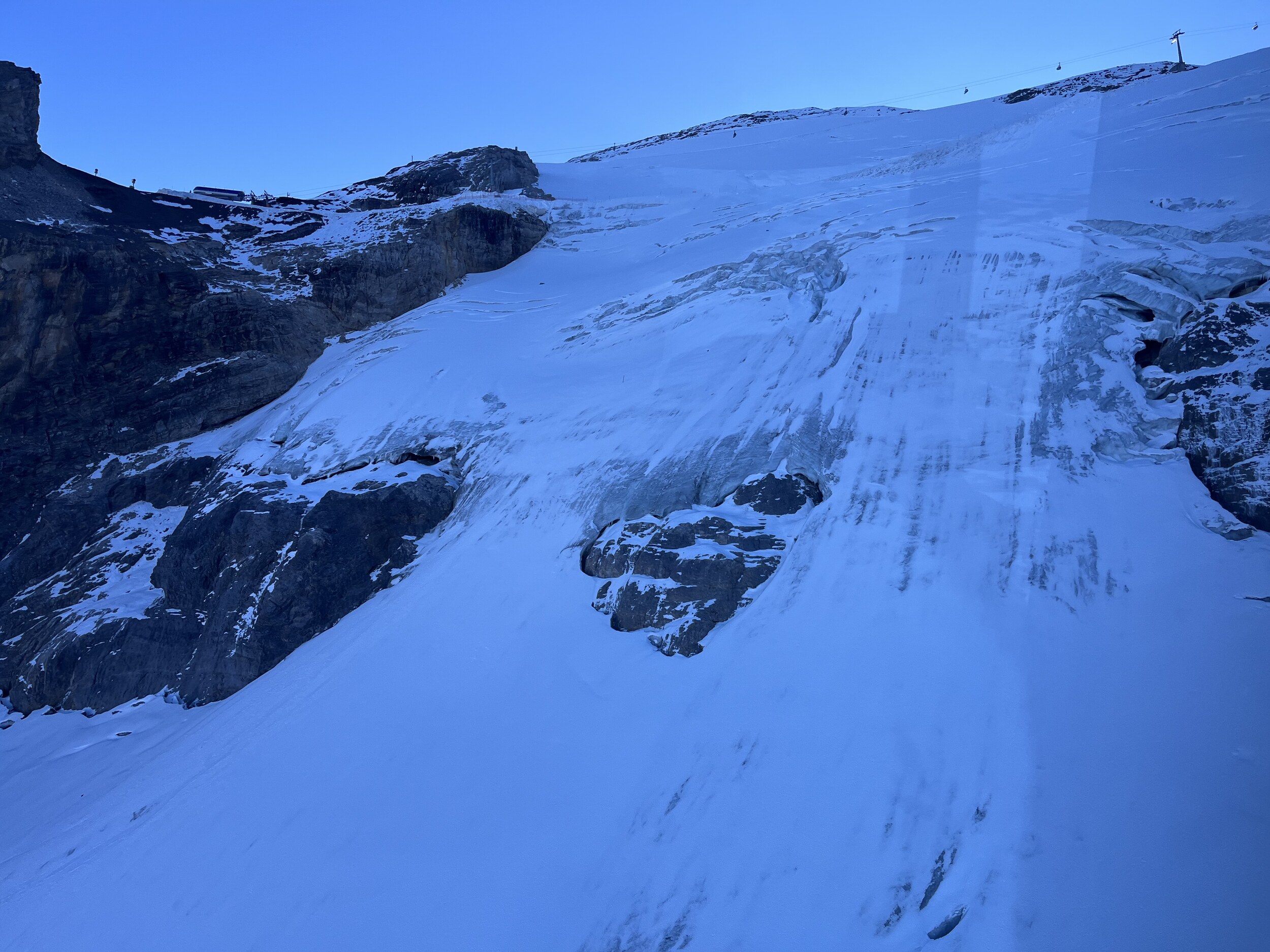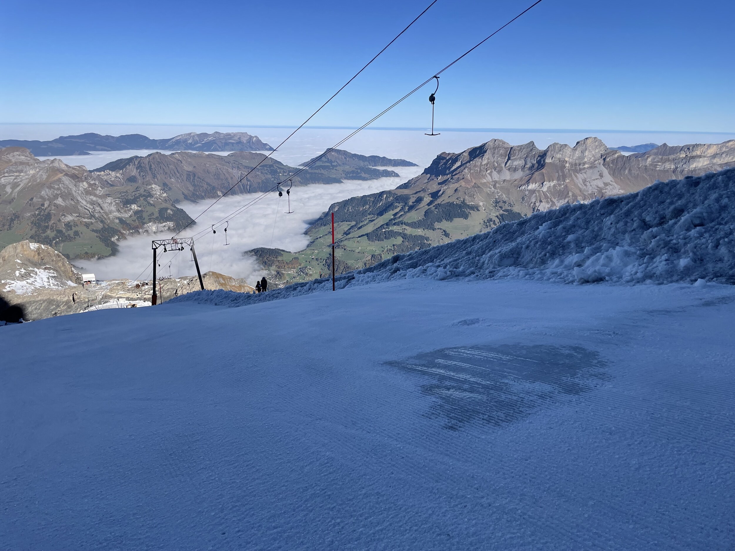 Die neue Bahn sehe ich zum ersten Mal: Brutal, wie der Gletscher abgeschmolzen ist. Die Spuren am westlichen Rand sind mir rätselhaft. Die Abfahrt müsste aber noch gehen, wenn wieder genügend Schnee liegt. Nebelmeer: Bergstation: Auf der Einfahrt liegen sehr viele kleine Steine. Umfahren geht nicht. Gut habe ich ältere Ski dabei. Auch auf der Piste hat es einige kleine Steinchen, aber die stören nur mässig. Und es wurde für den Titlis unüblich gut präpariert! Insgesamt macht die Iceflyer-Piste viel mehr Spass als alles in Tux. Total griffig! Extrem, wie sich das Gelände verändert hat. Work in progress: Cool, dass man an der Bergstation nicht mehr hochschieben muss. Edit 10.45 Uhr: