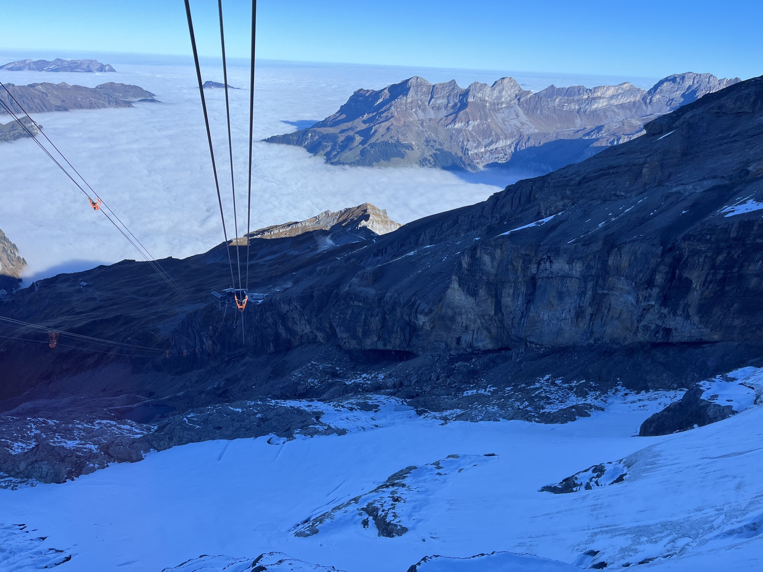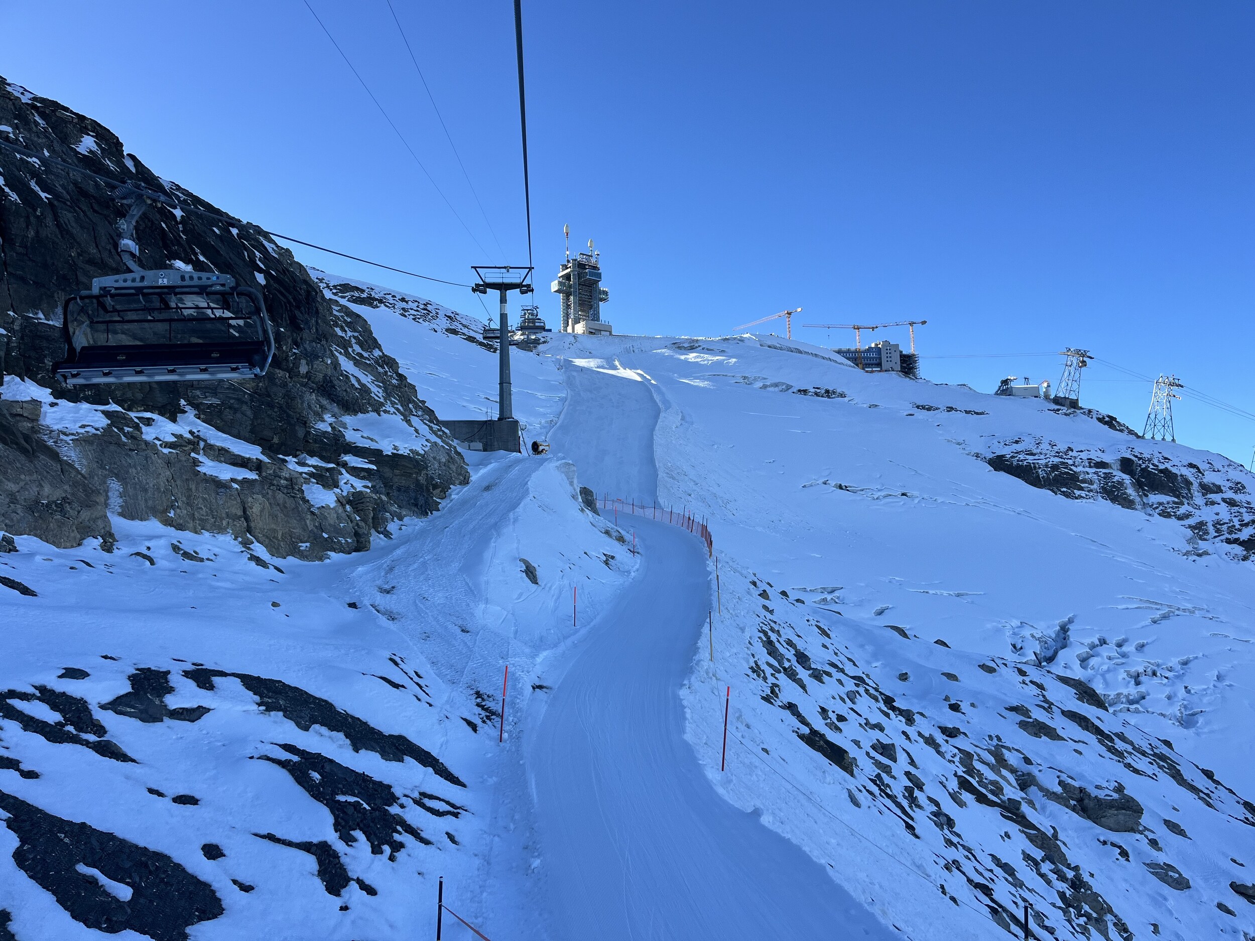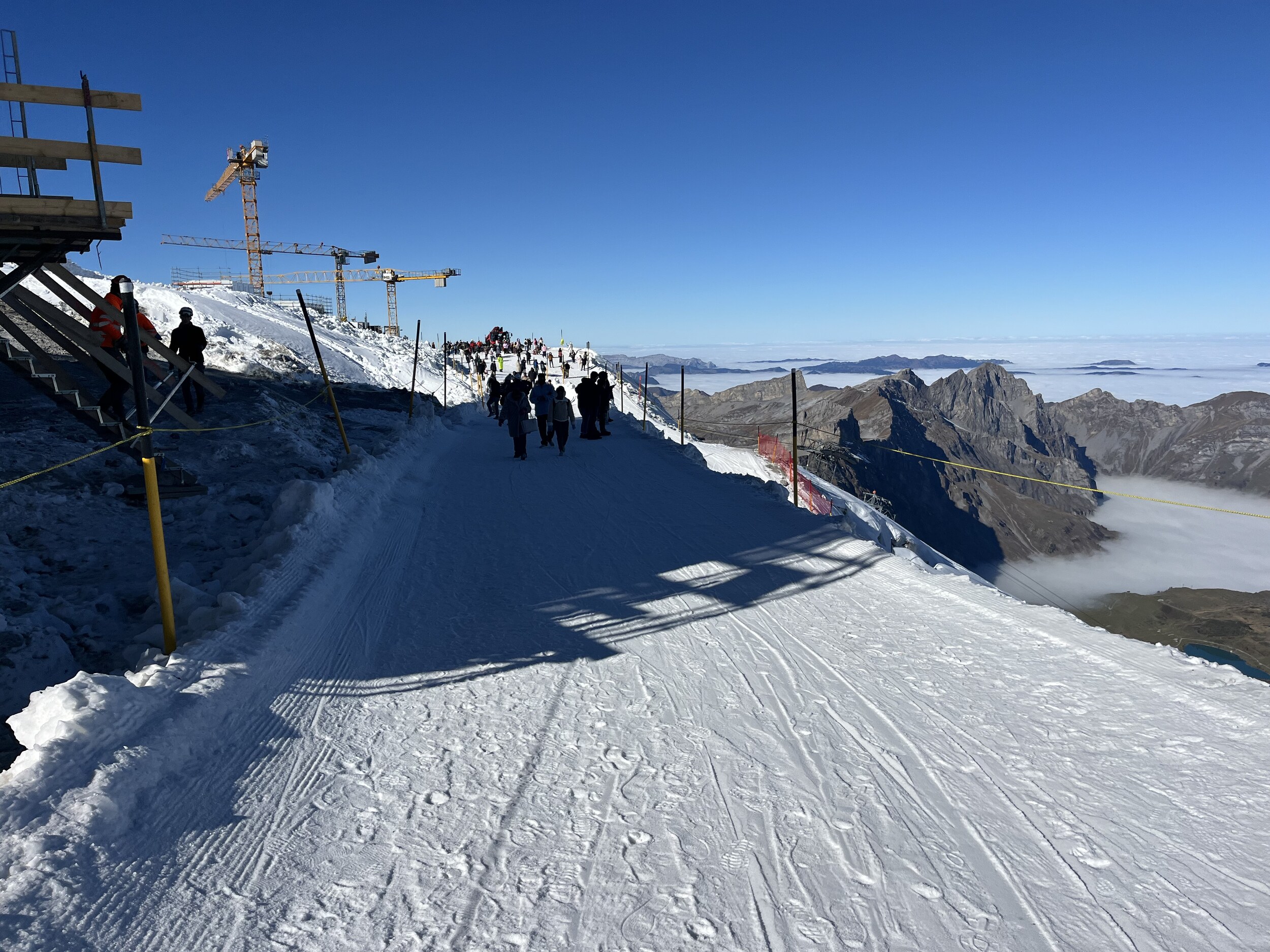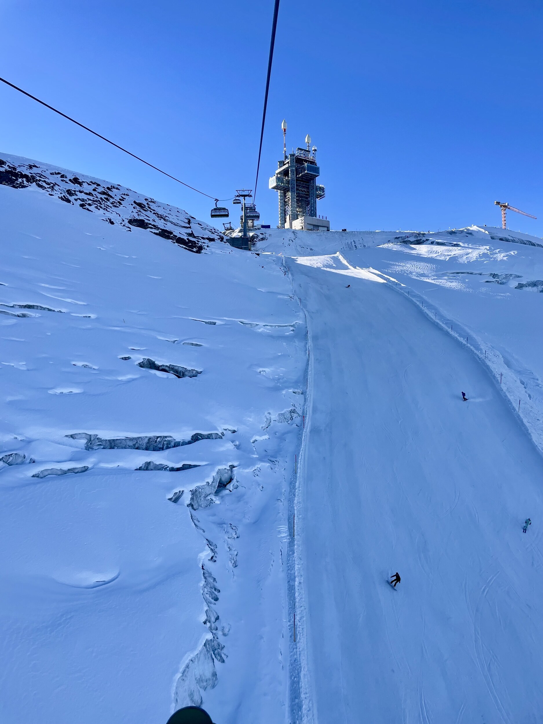 Die neue Bahn sehe ich zum ersten Mal: Brutal, wie der Gletscher abgeschmolzen ist. Die Spuren am westlichen Rand sind mir rätselhaft. Die Abfahrt müsste aber noch gehen, wenn wieder genügend Schnee liegt. Nebelmeer: Bergstation: Auf der Einfahrt liegen sehr viele kleine Steine. Umfahren geht nicht. Gut habe ich ältere Ski dabei. Auch auf der Piste hat es einige kleine Steinchen, aber die stören nur mässig. Und es wurde für den Titlis unüblich gut präpariert! Insgesamt macht die Iceflyer-Piste viel mehr Spass als alles in Tux. Total griffig! Extrem, wie sich das Gelände verändert hat. Work in progress: Cool, dass man an der Bergstation nicht mehr hochschieben muss. Edit 10.45 Uhr: