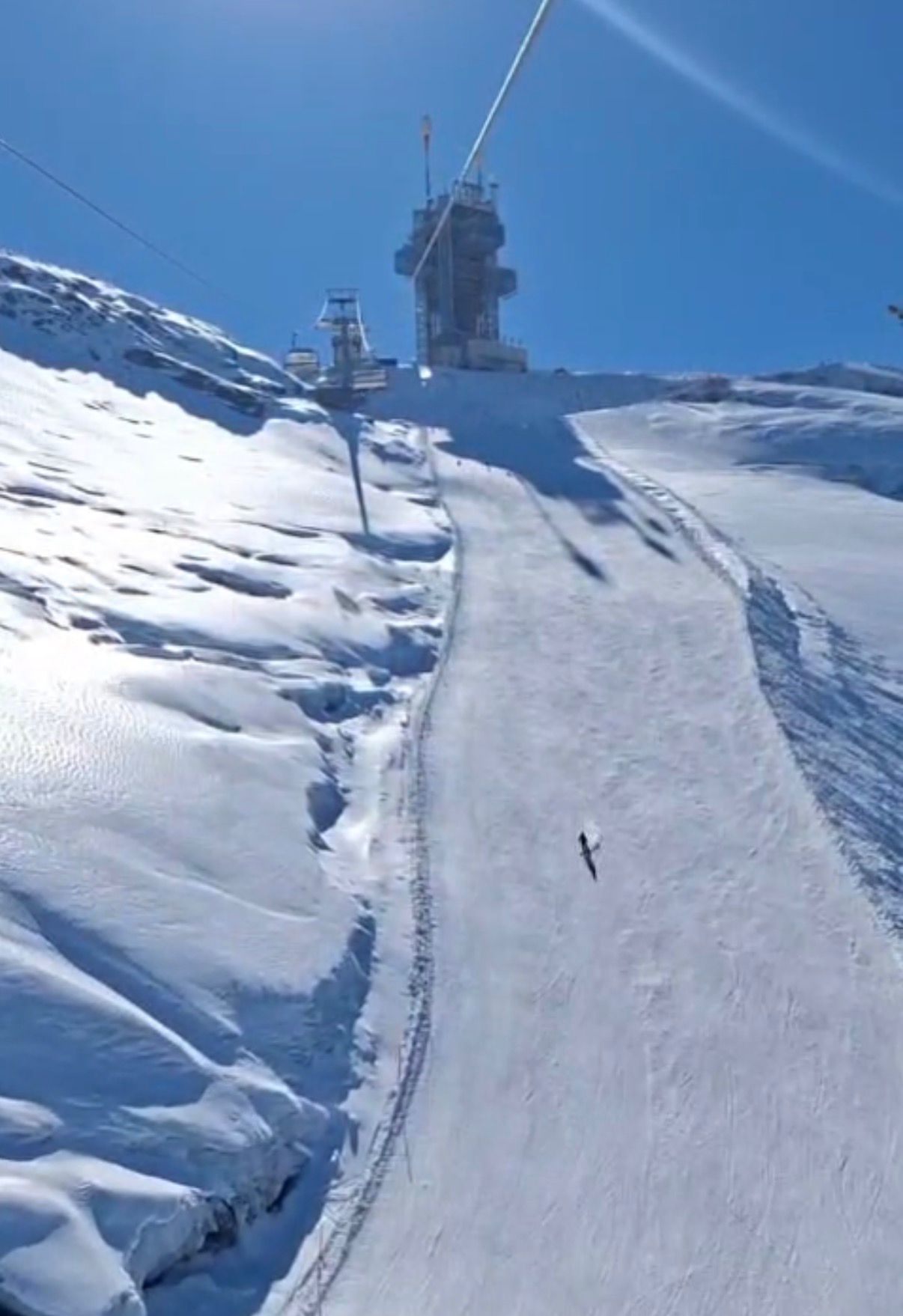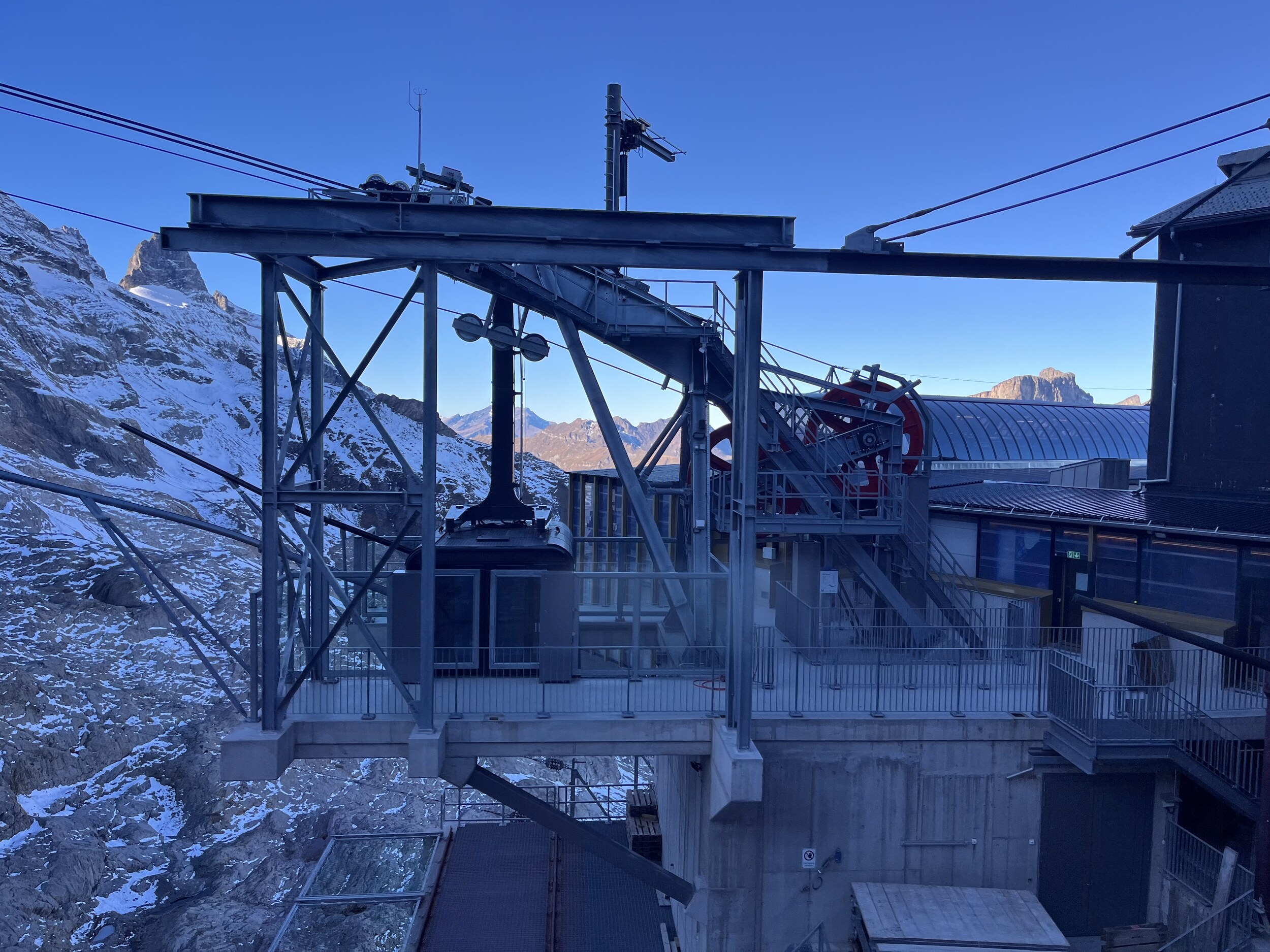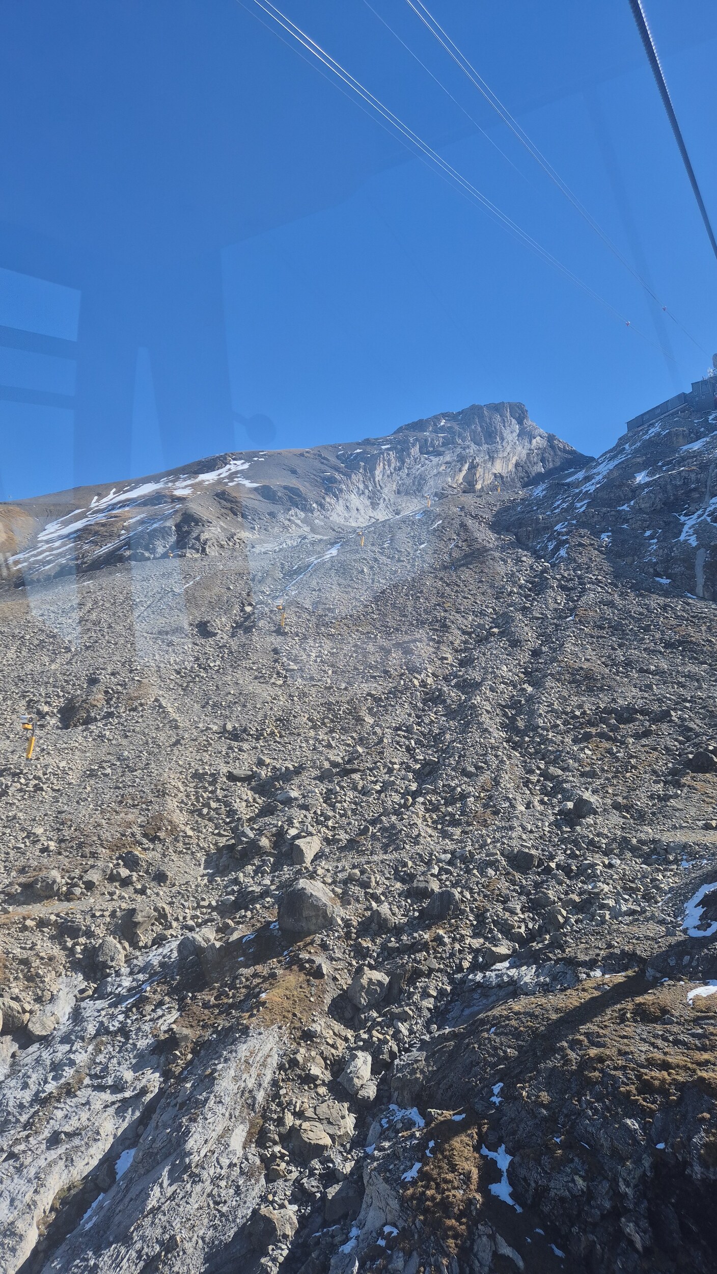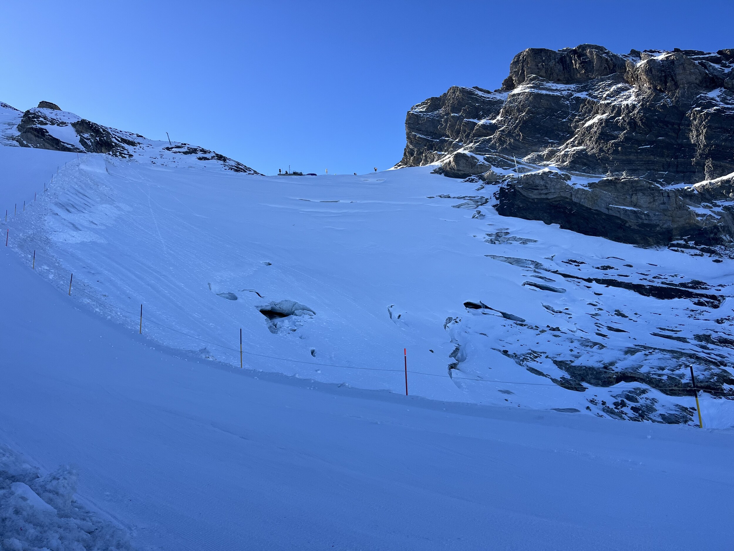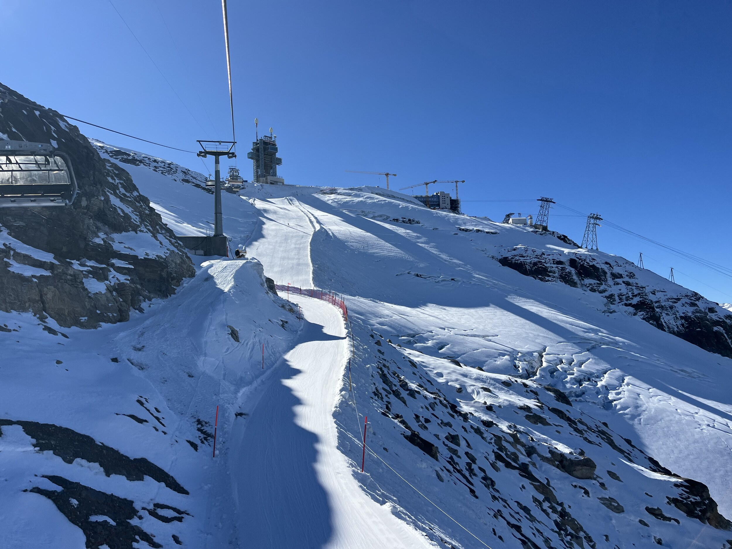 Die neue Bahn sehe ich zum ersten Mal: Brutal, wie der Gletscher abgeschmolzen ist. Die Spuren am westlichen Rand sind mir rätselhaft. Die Abfahrt müsste aber noch gehen, wenn wieder genügend Schnee liegt. Nebelmeer: Bergstation: Auf der Einfahrt liegen sehr viele kleine Steine. Umfahren geht nicht. Gut habe ich ältere Ski dabei. Auch auf der Piste hat es einige kleine Steinchen, aber die stören nur mässig. Und es wurde für den Titlis unüblich gut präpariert! Insgesamt macht die Iceflyer-Piste viel mehr Spass als alles in Tux. Total griffig! Extrem, wie sich das Gelände verändert hat. Work in progress: Cool, dass man an der Bergstation nicht mehr hochschieben muss. Edit 10.45 Uhr: