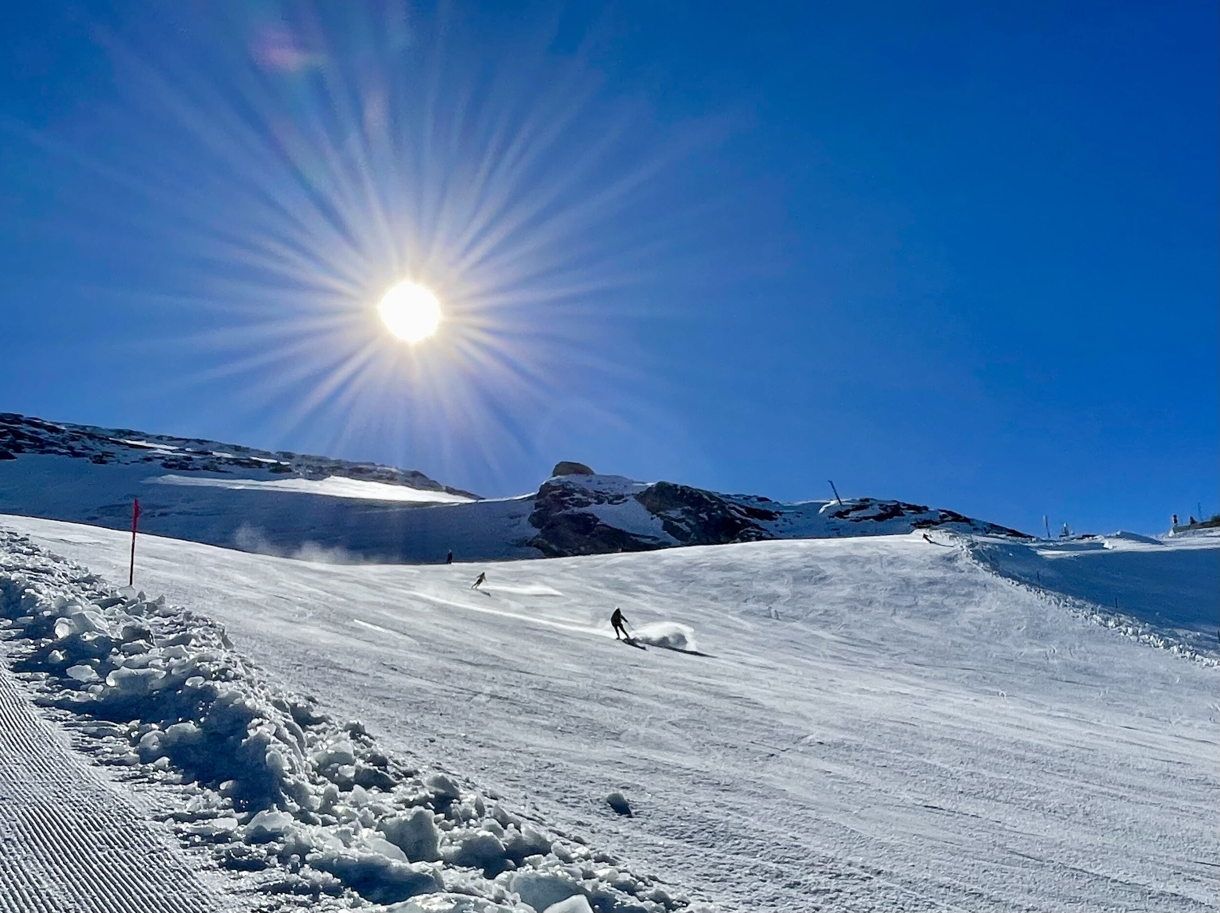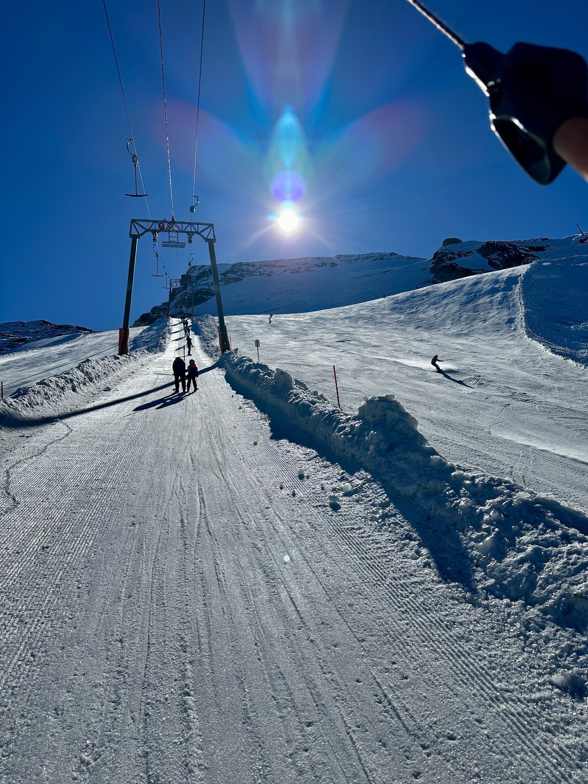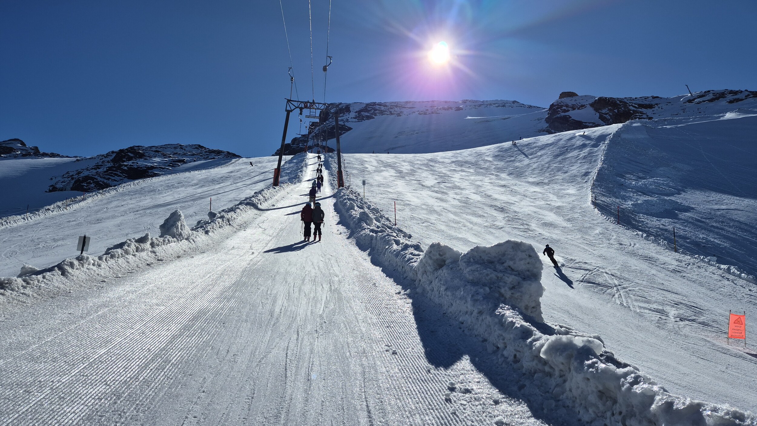 Es ist so wenig los, dass es auch um diese Zeit noch Rillen gibt. Ich hätte nicht gedacht, dass ich hier so viele Fahrten mache. Macht viel mehr Spass als die letzten vier Tage in Tirol! Mittlerweile ist die ganze Iceflyerpiste in der Sonne: