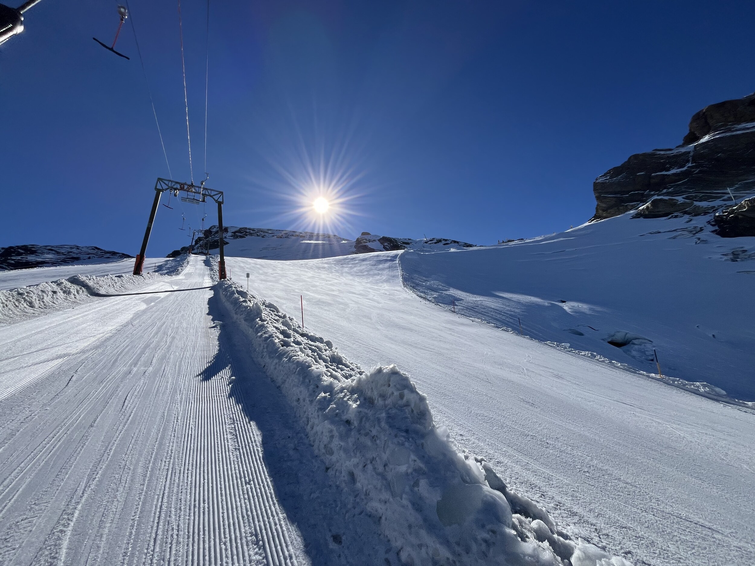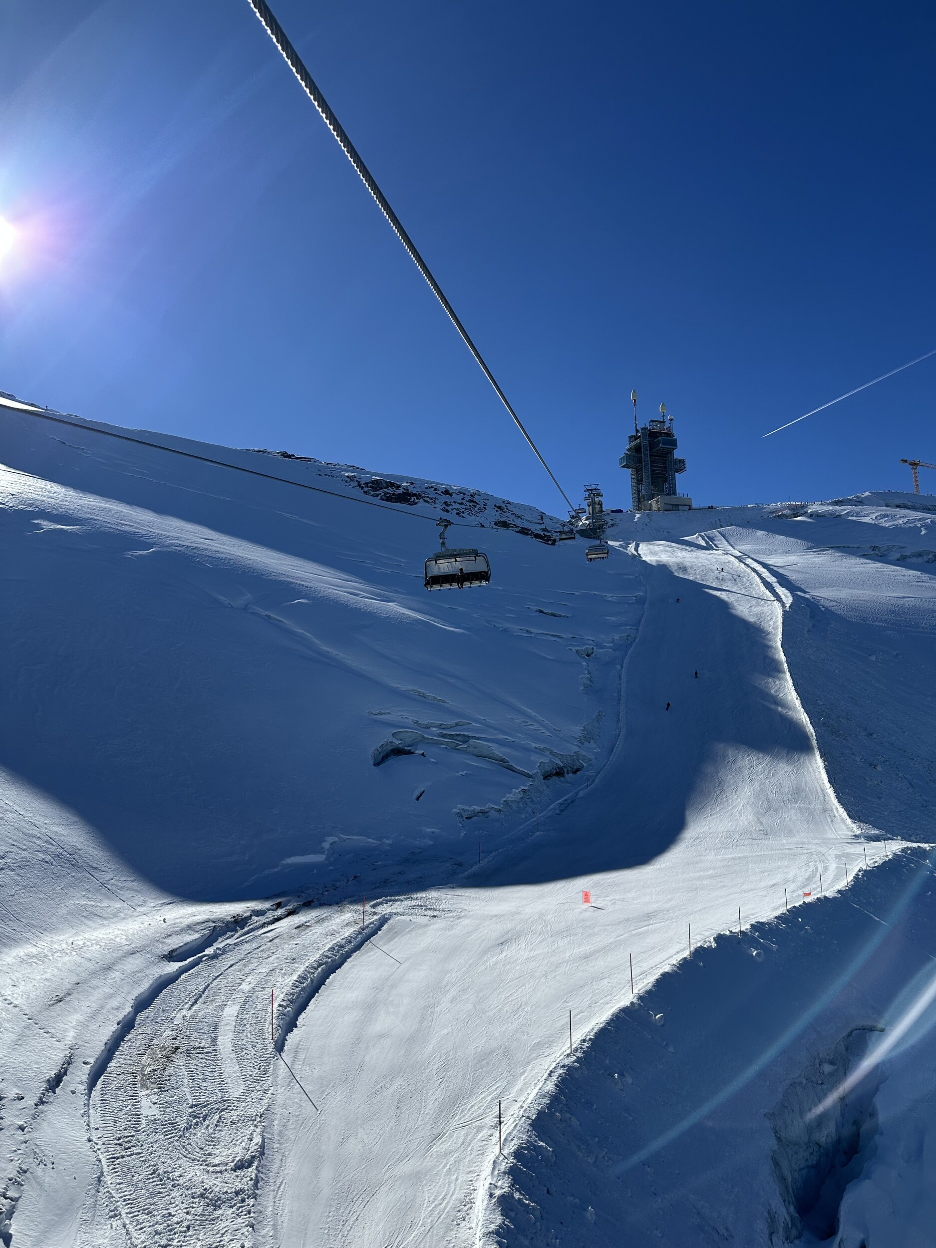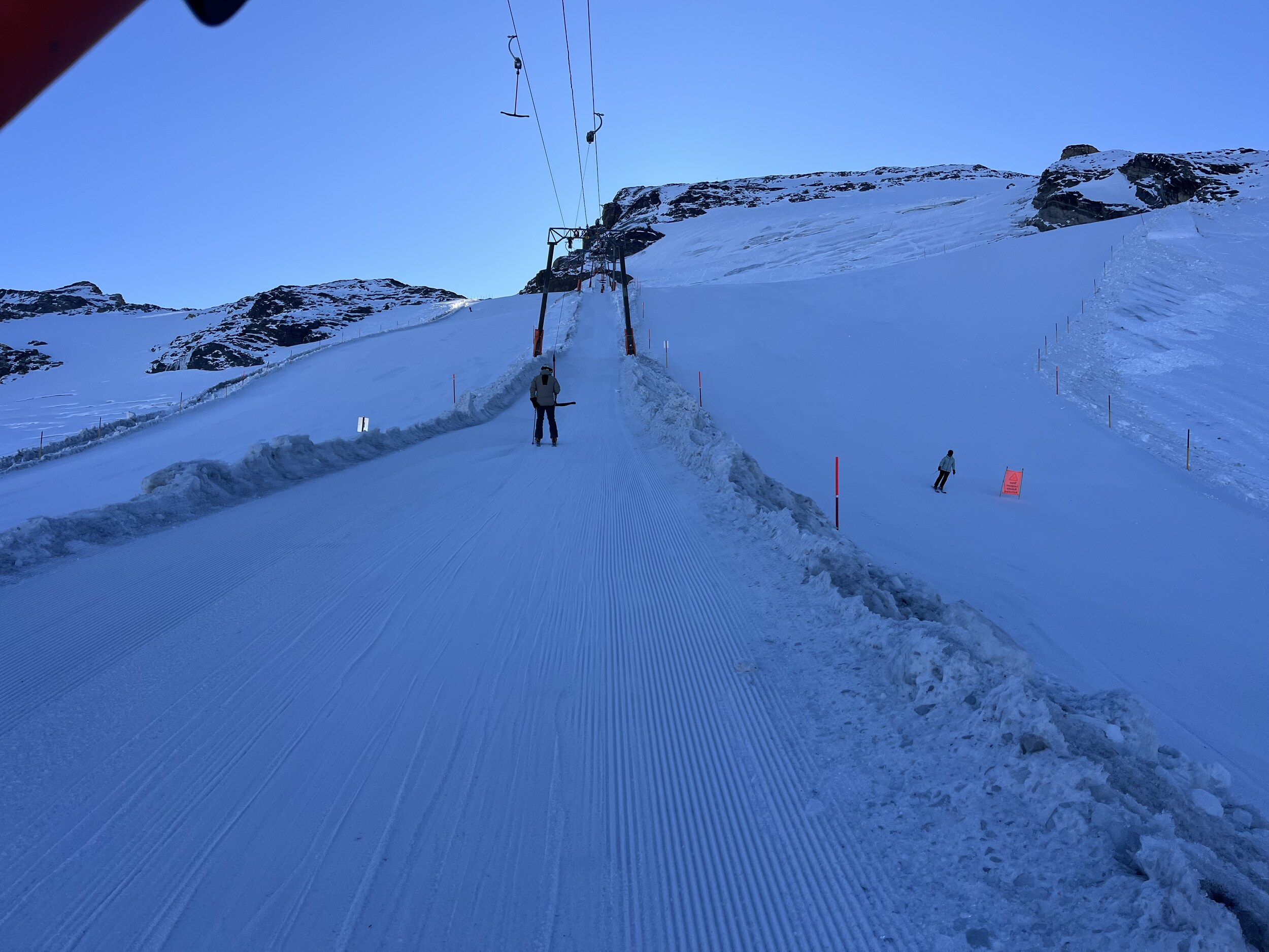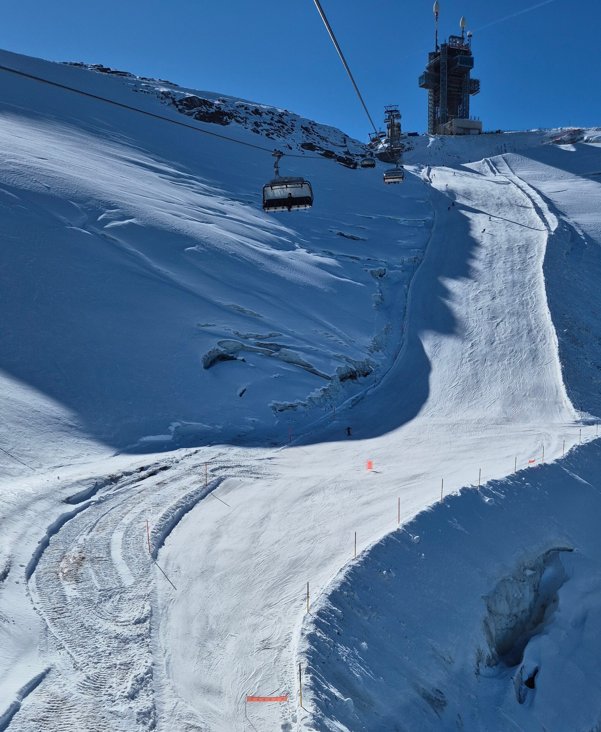 Der „Granulat“-Schnee ist wie beschrieben eine Mischung aus Depot-Schnee, 15cm neuer Pulver und geschredderter Gletscher. Allerdings deutlich besser zu fahren als gedacht, Piste am Ice-Flyer ist am besten ganz feiner Granulat und die linke Piste am Skilift am grobsten.