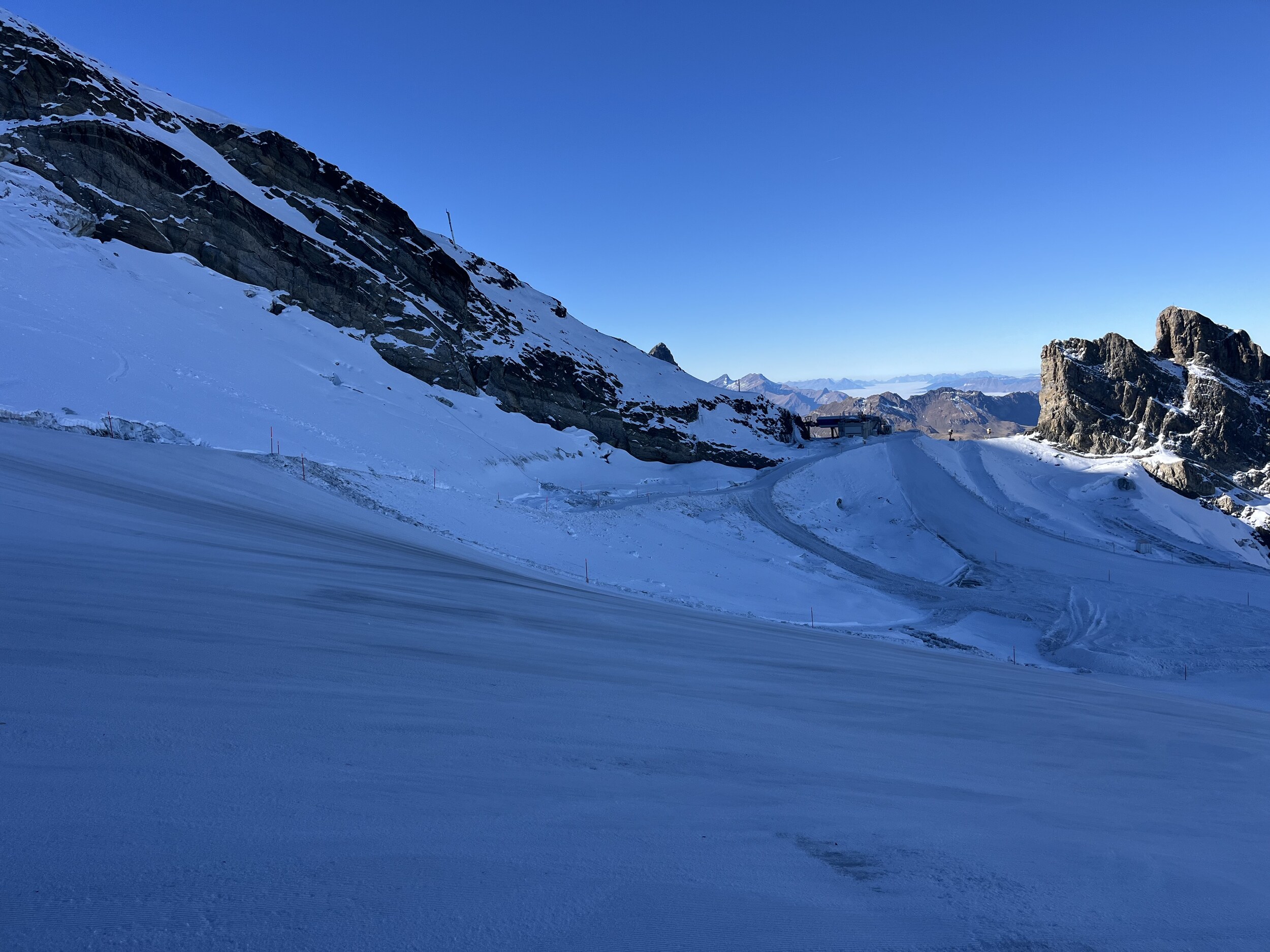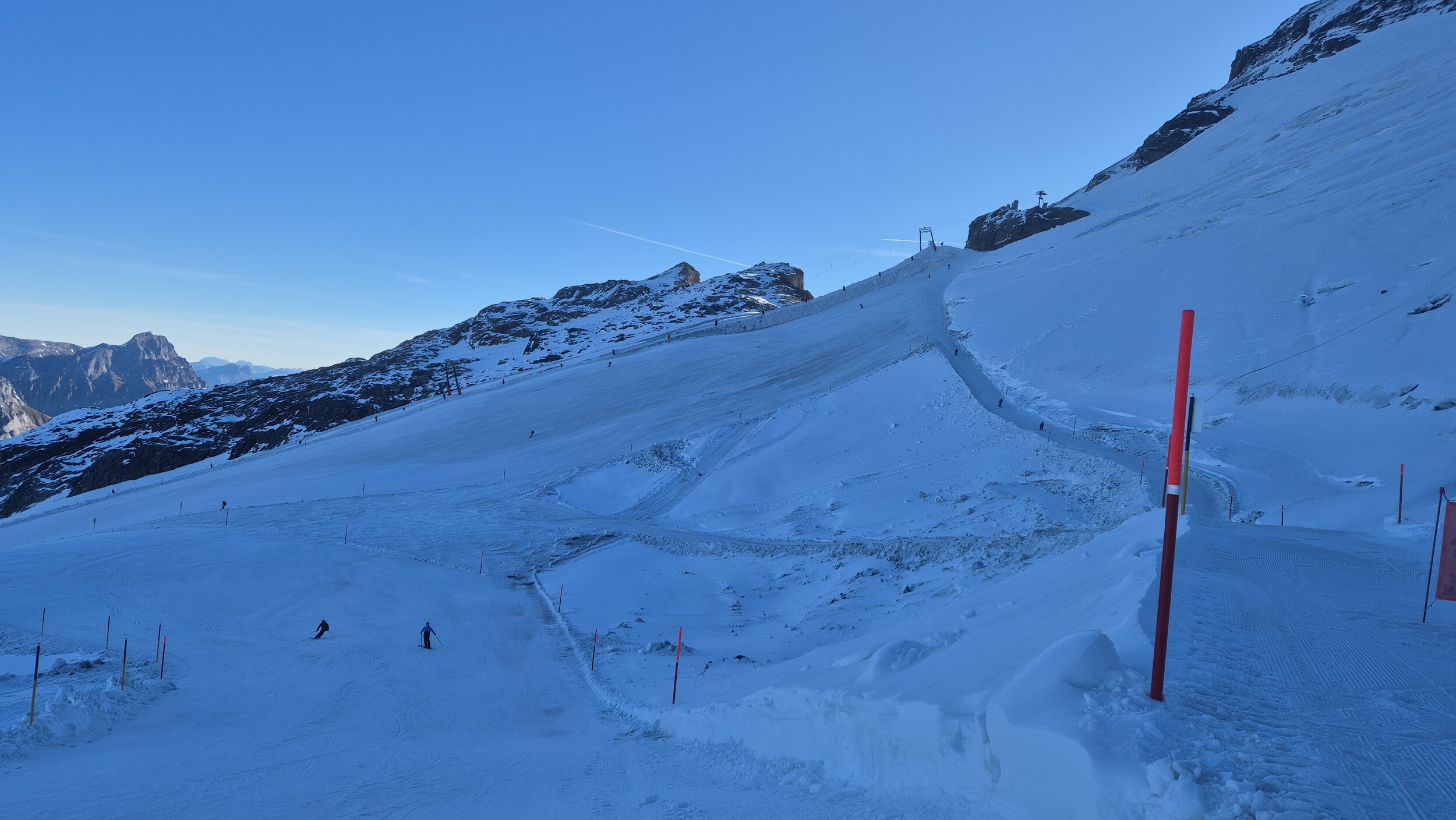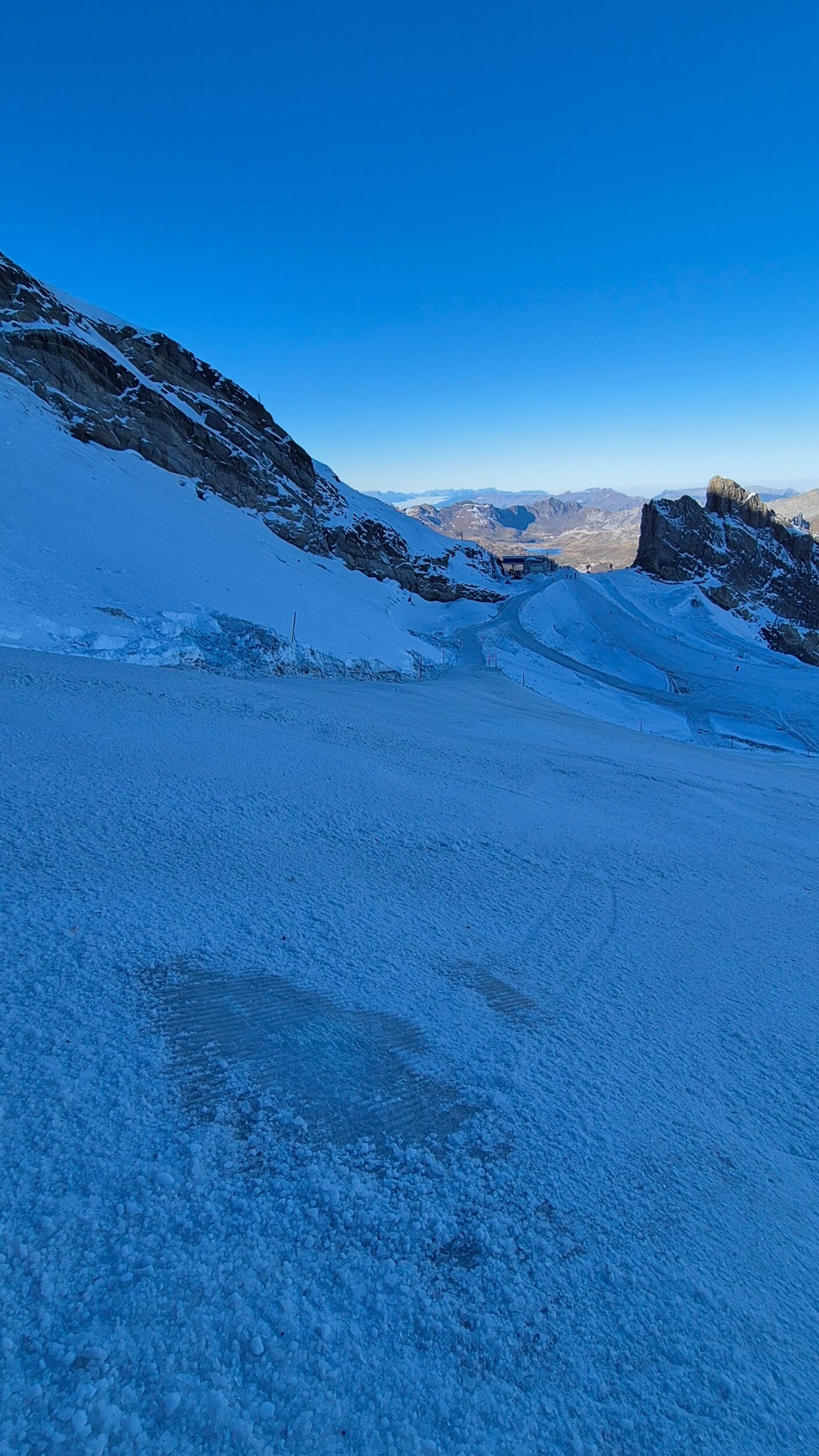 Habe ein kurzes Video vom Titlis erhalten, es sei eisig (Korrektur: wohl eher hart gemeint) und hat nur wenige Leute heute beim Saisonstart.