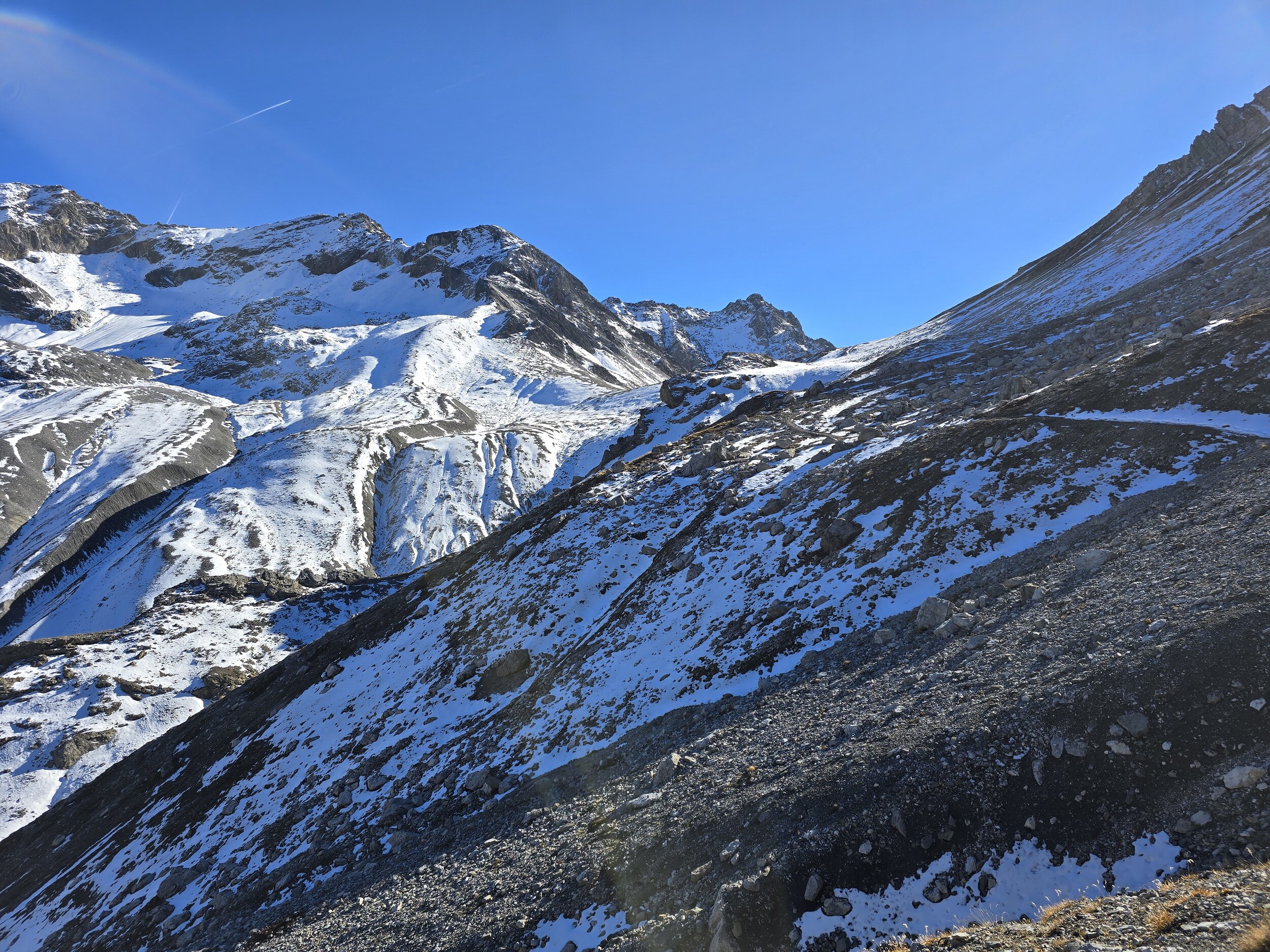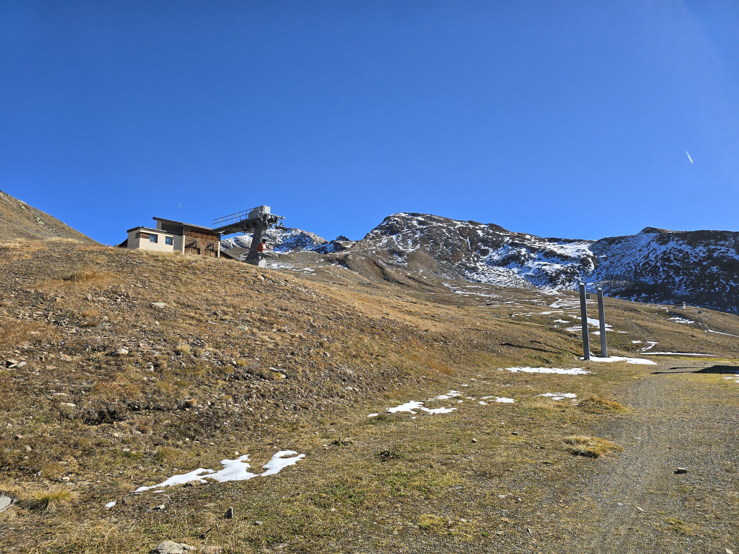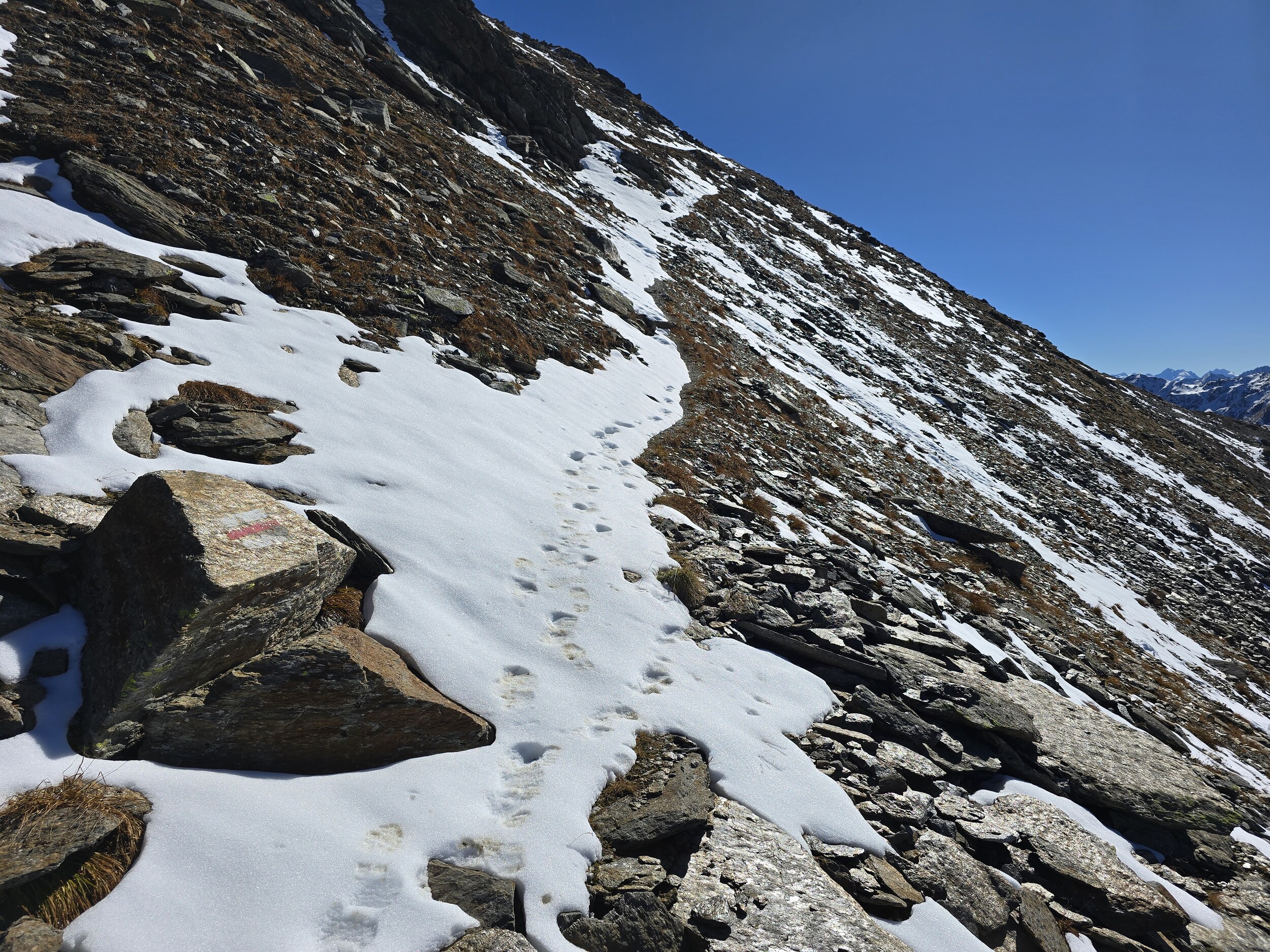 Nachdem ich die Aussicht ausgiebig genossen habe, geht es wieder runter zur Bergstation. Ich hatte kurz überlegt über die Rückseite via Pischasee abzusteigen. An diesem nördlich ausgerichteten Hang liegt aber ordentlich Schnee, sodass ich darauf verzichte und stattdessen über den Aufstiegsweg absteige. Trotz den Schneefeldern ist der Abstieg hier dann einfacher als gedacht.