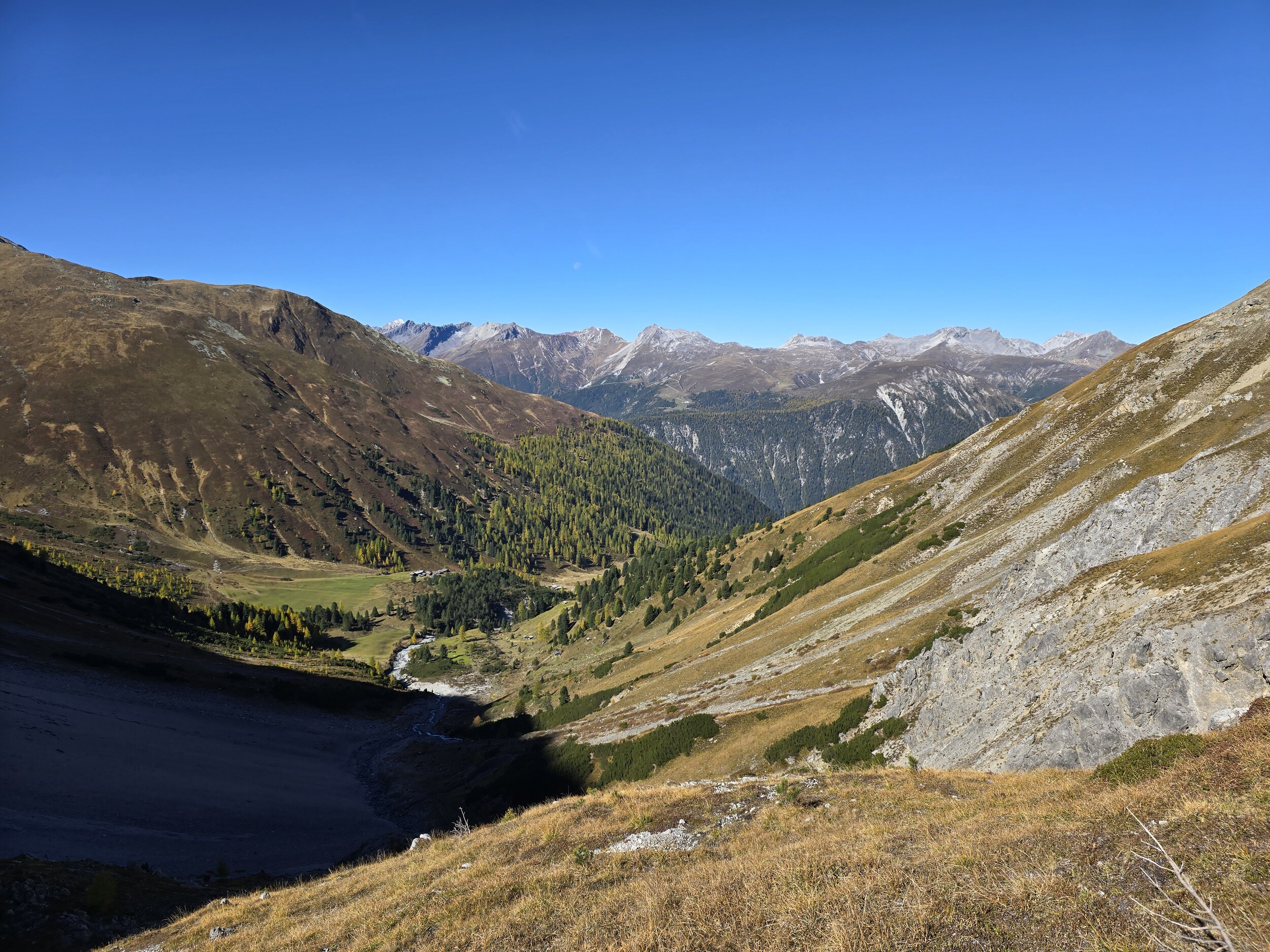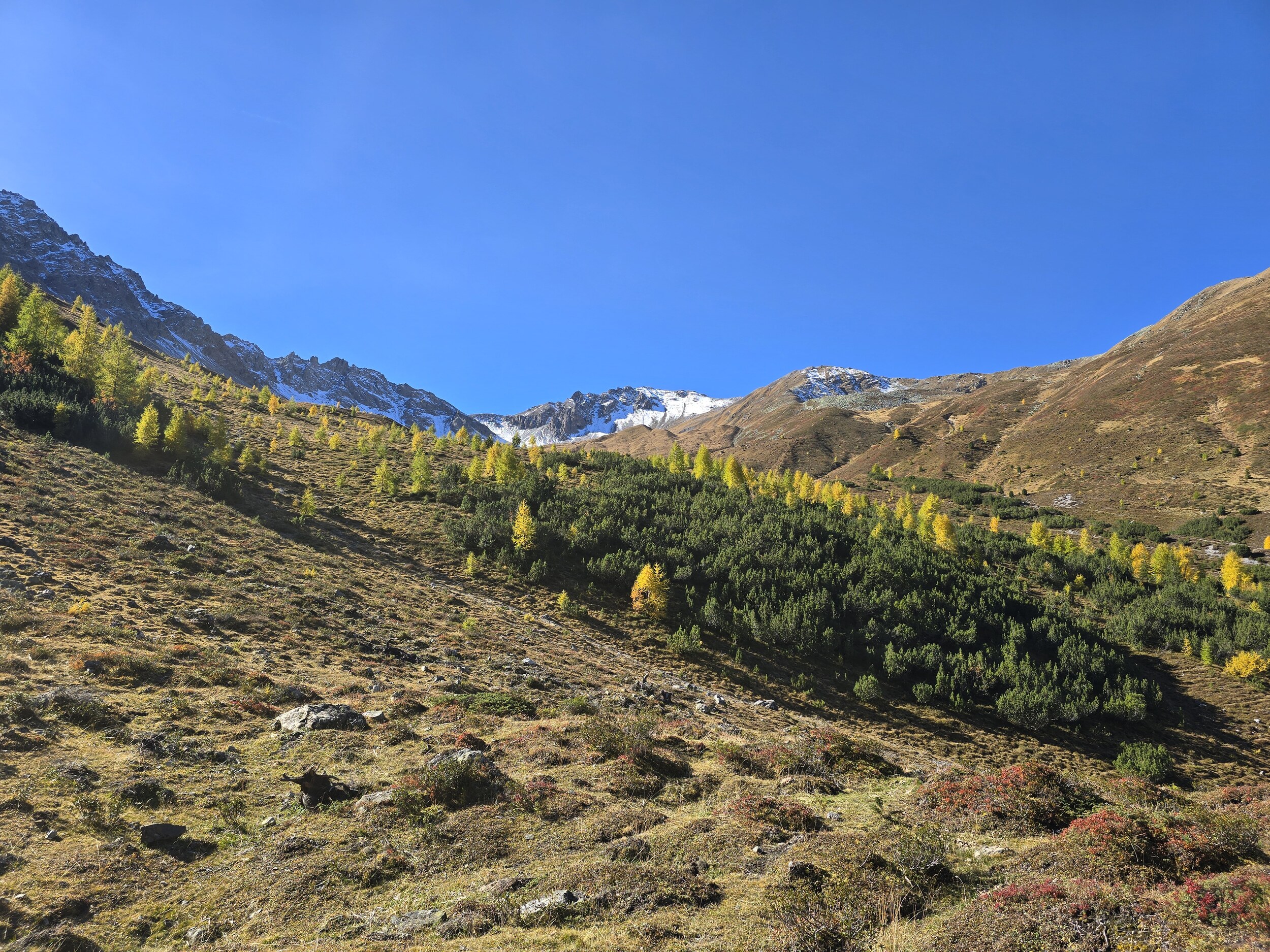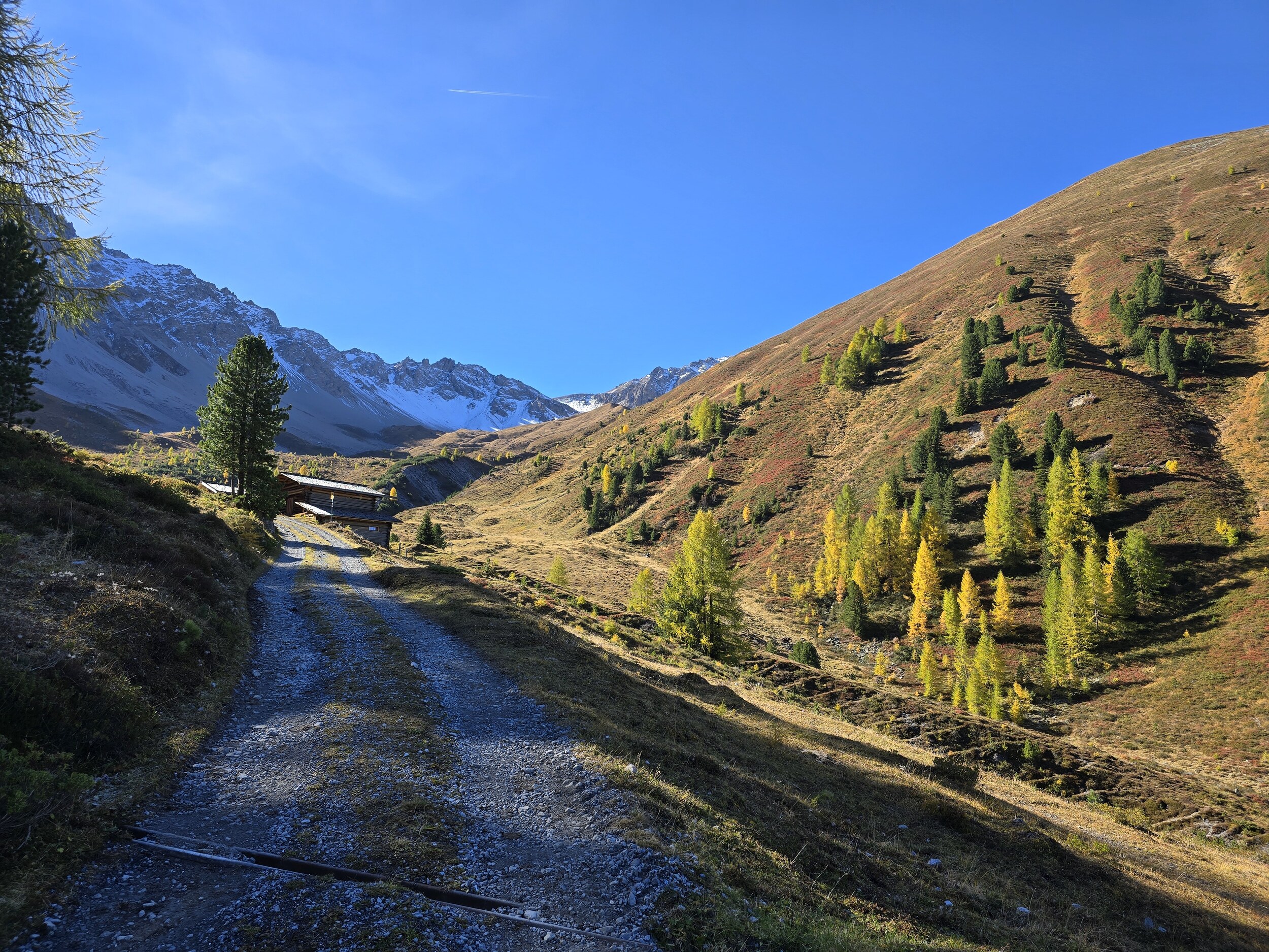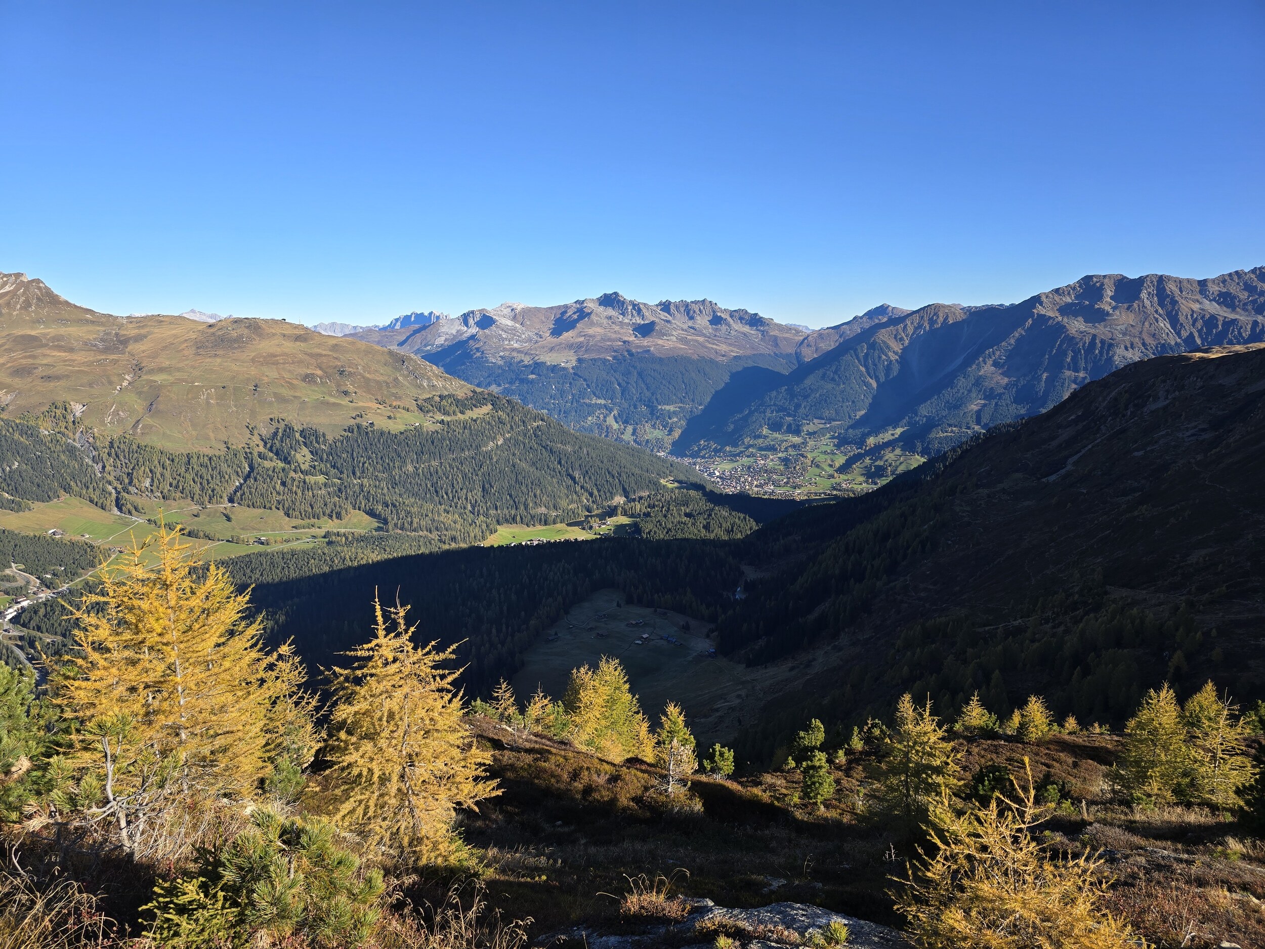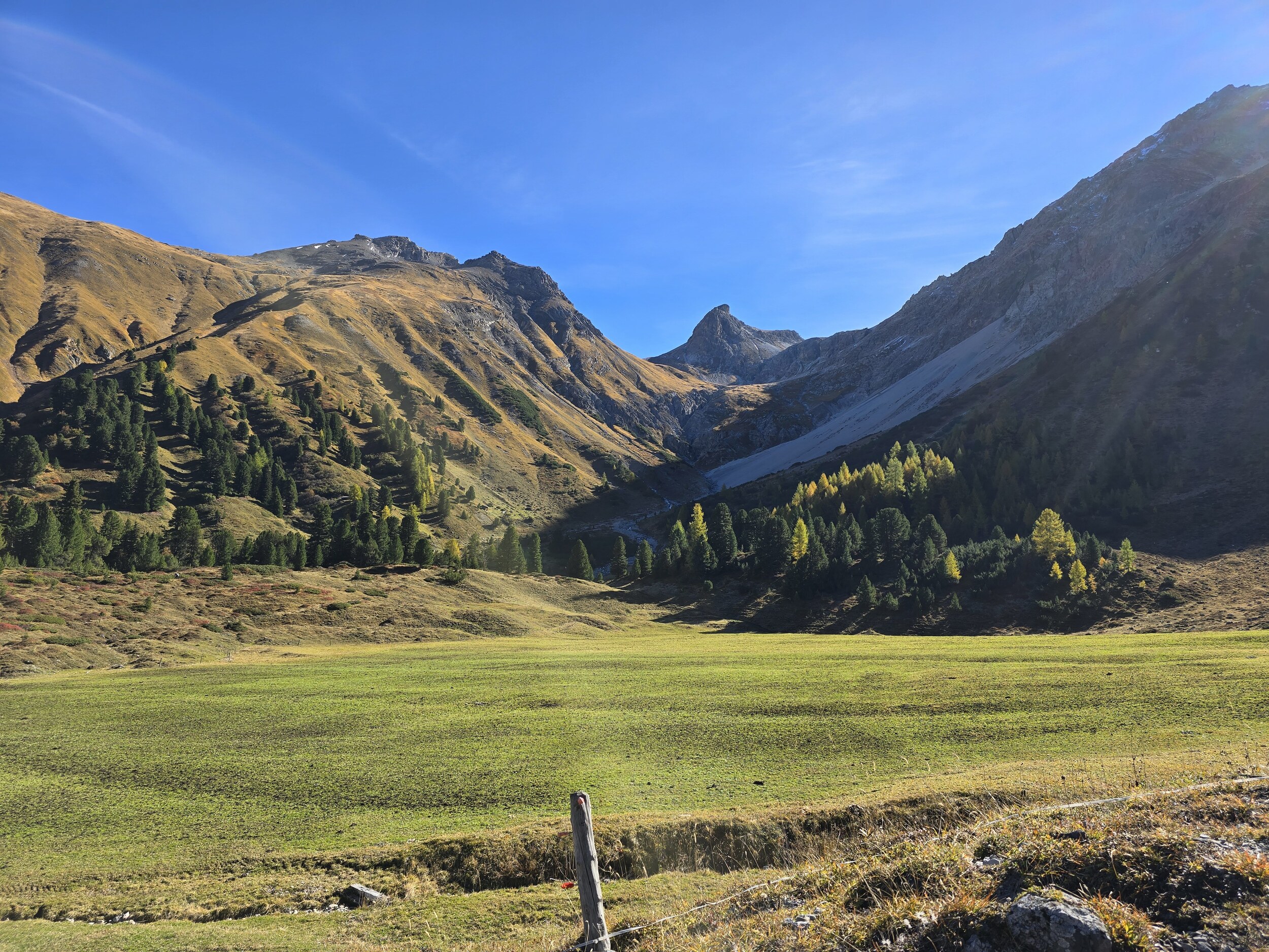 Als wir aus dem Dukantal kommen, werden wir von eine wunderschöne herbstlichen Färbung der Lärchen in Sertig überrascht. Das hätte ich so nicht erwartet, sind doch die meisten Lärchen in dieser Höhenlage noch deutlich grüner. Leider liegt das Tal bereits im Schatten, die gelben Lärchen sind aber dennoch sehr schön.