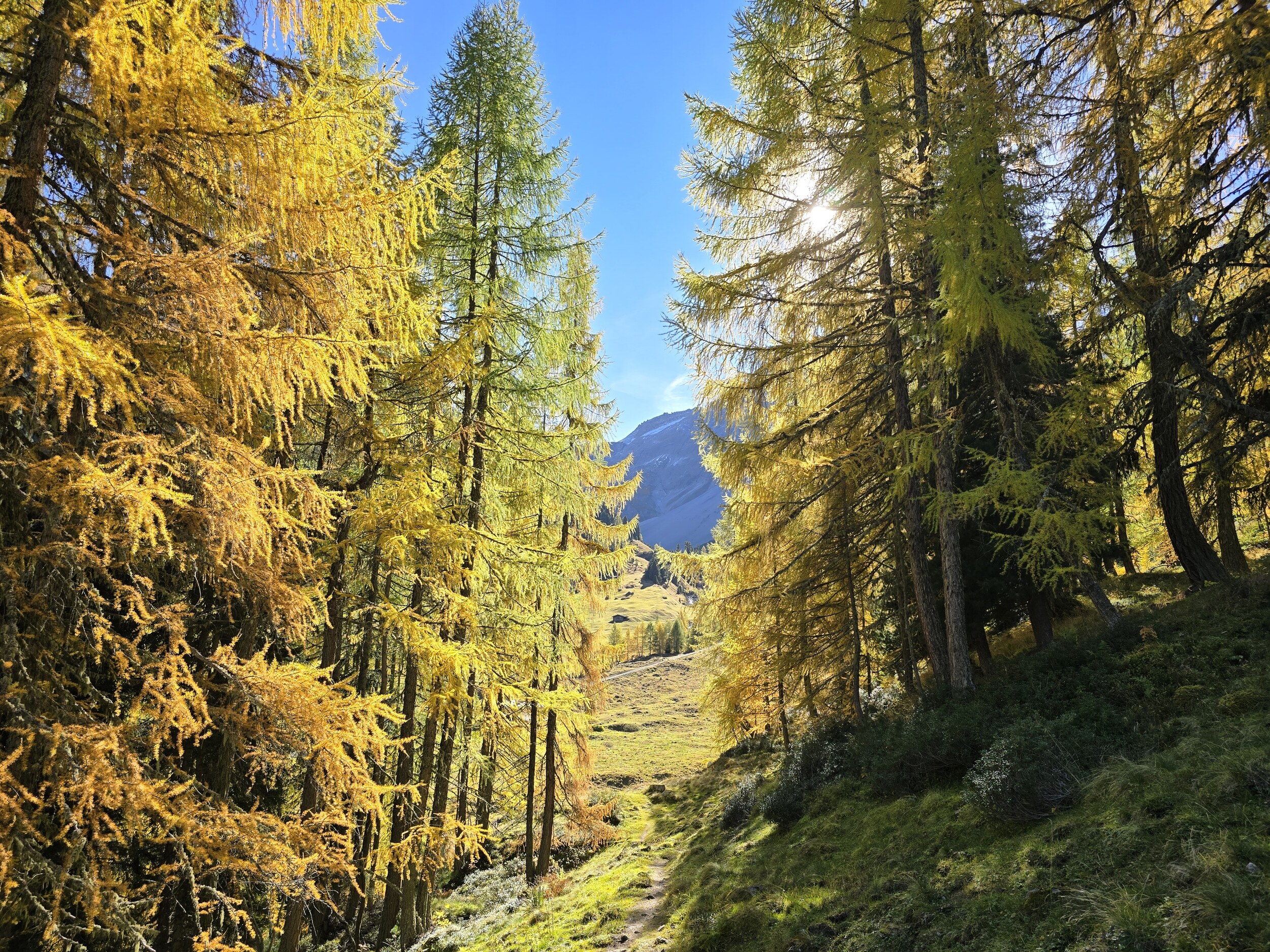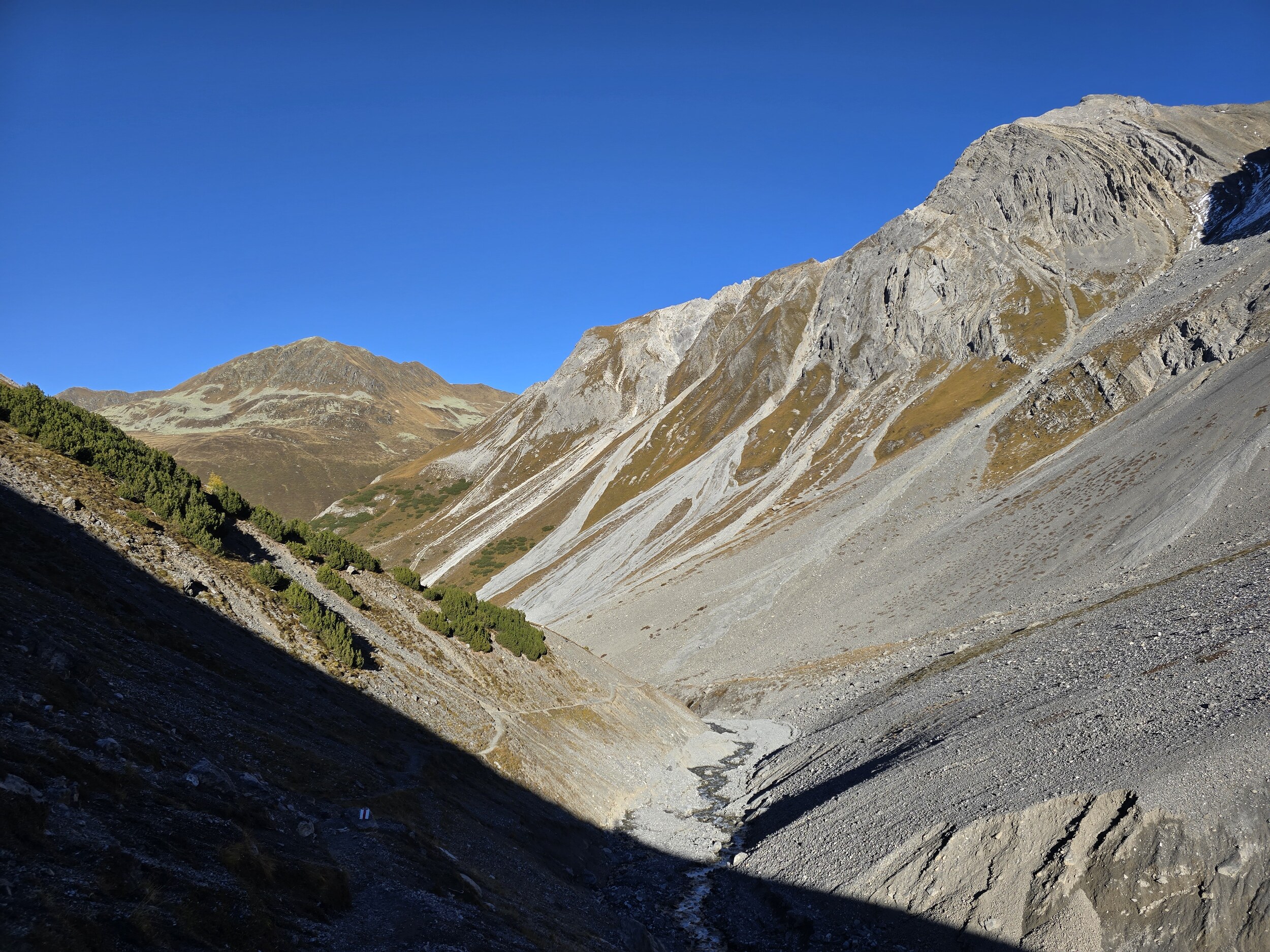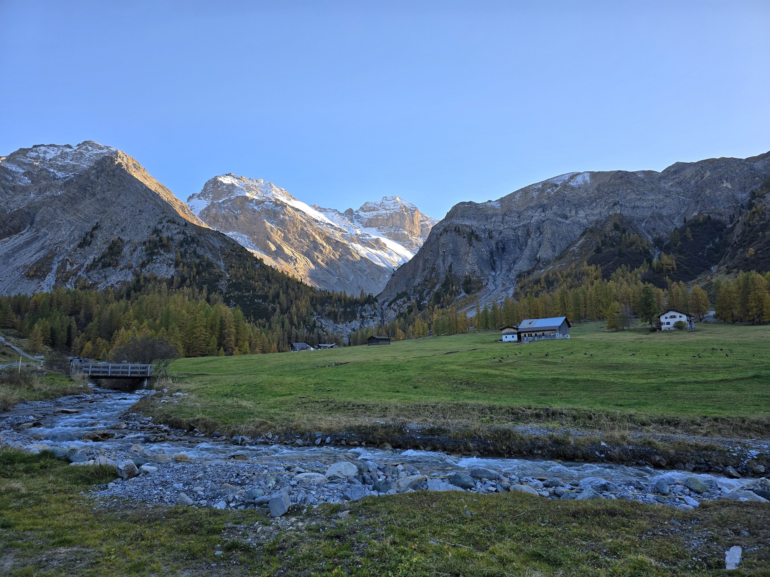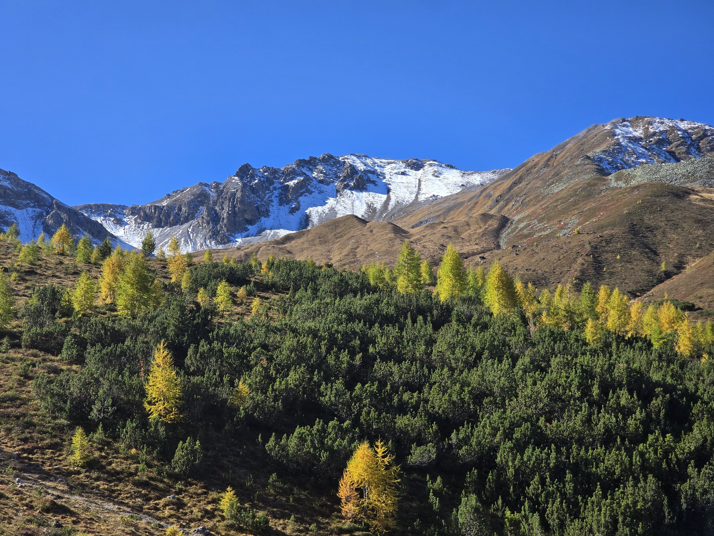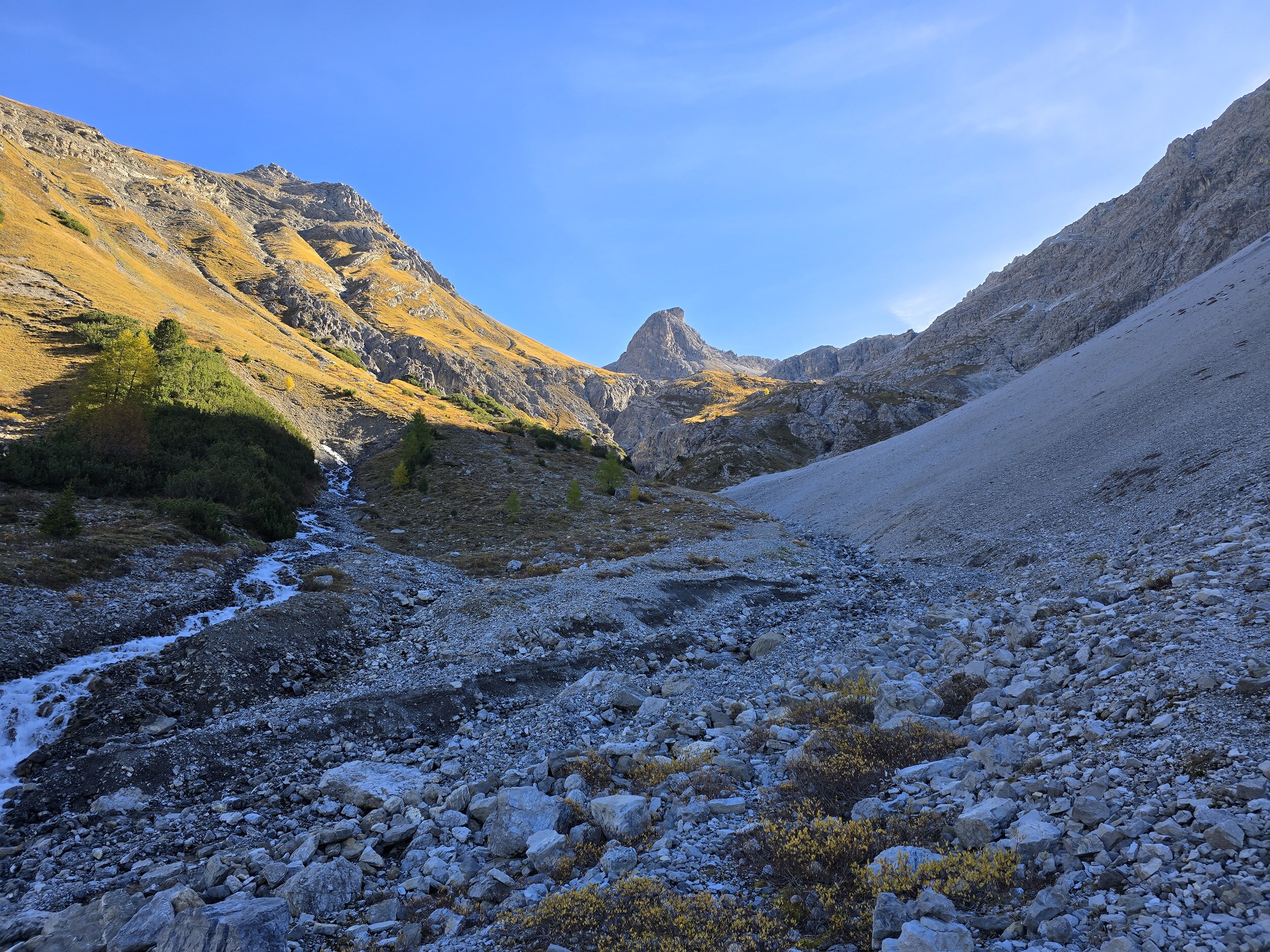 Als wir aus dem Dukantal kommen, werden wir von eine wunderschöne herbstlichen Färbung der Lärchen in Sertig überrascht. Das hätte ich so nicht erwartet, sind doch die meisten Lärchen in dieser Höhenlage noch deutlich grüner. Leider liegt das Tal bereits im Schatten, die gelben Lärchen sind aber dennoch sehr schön.