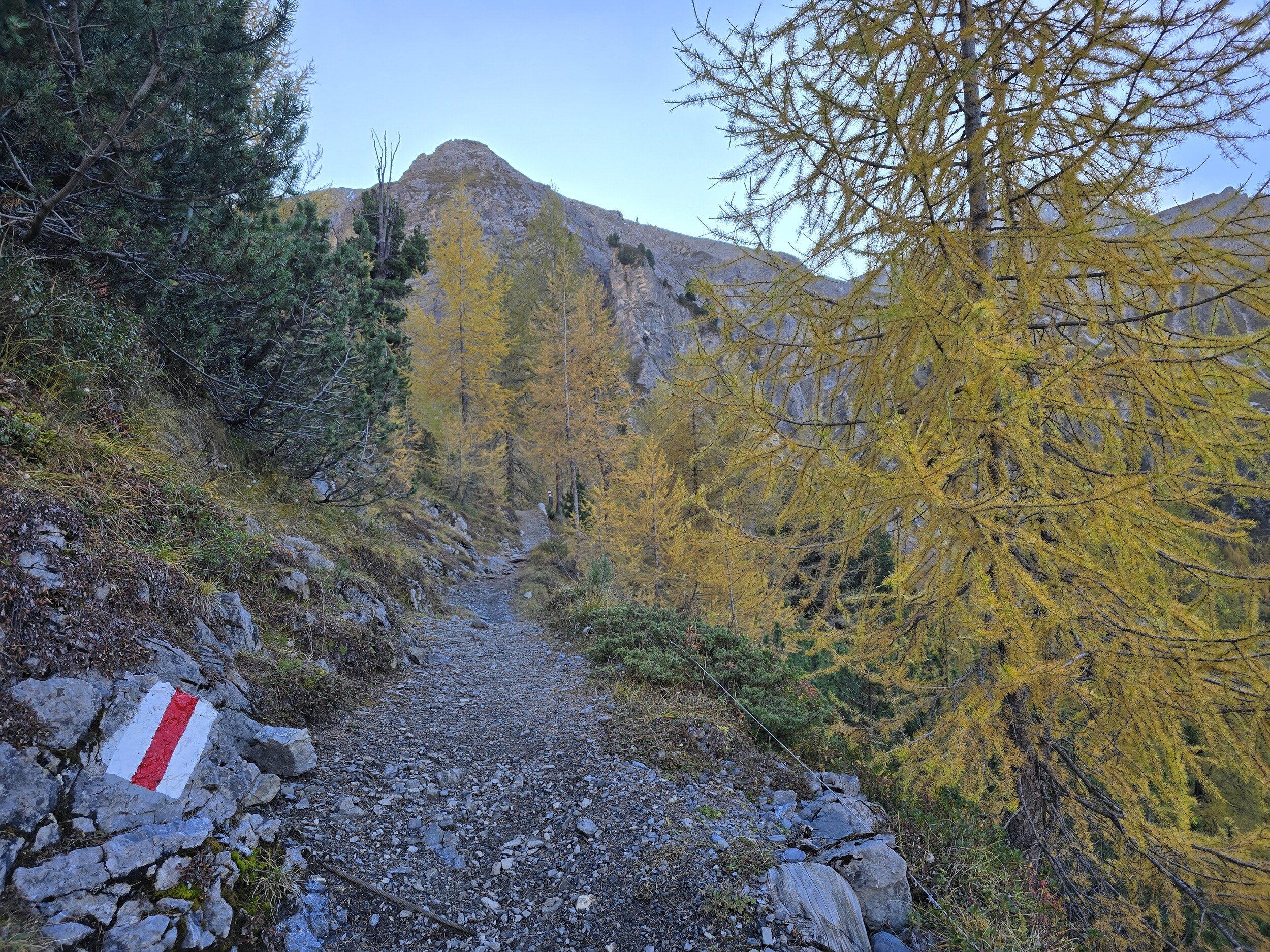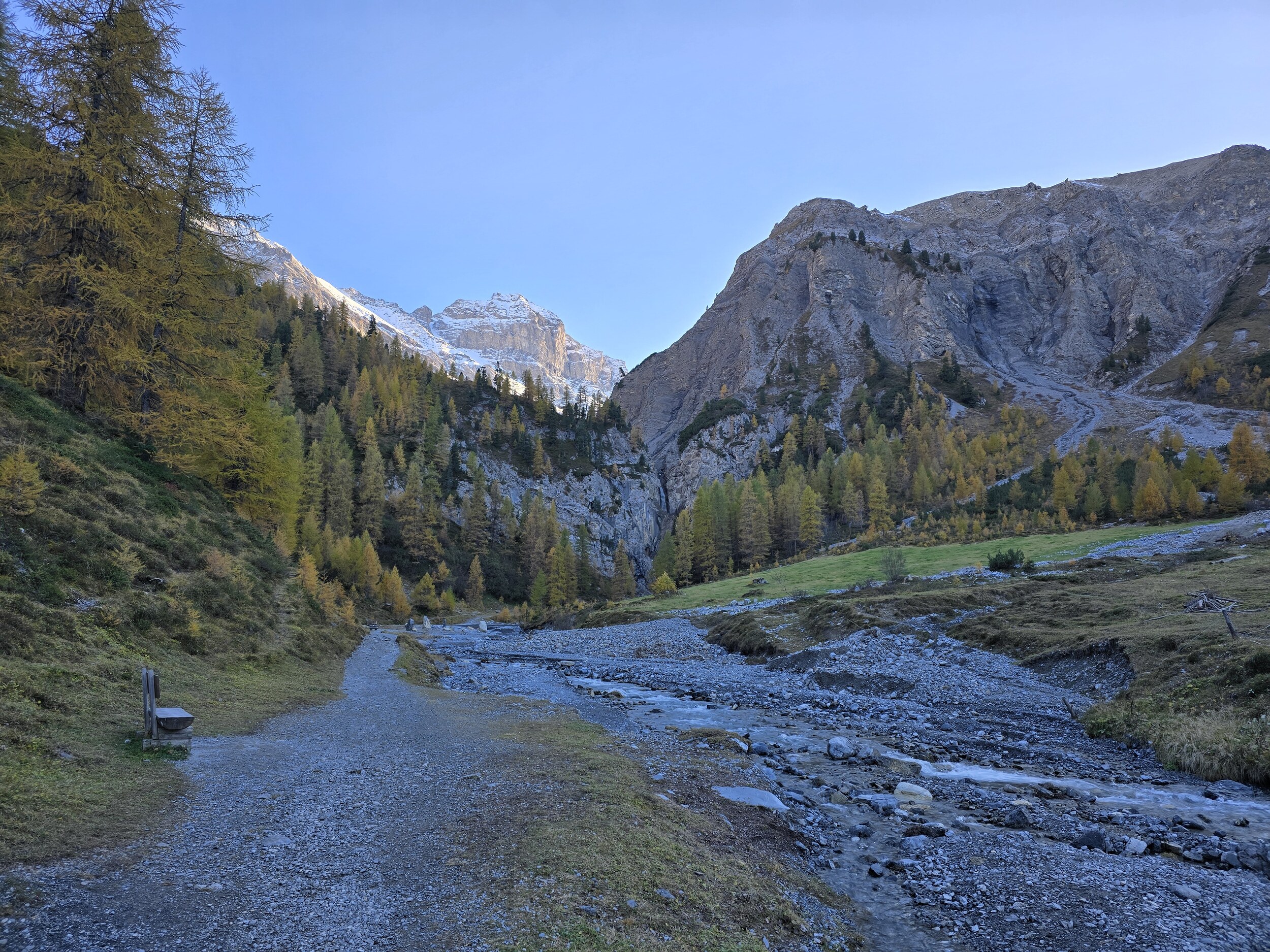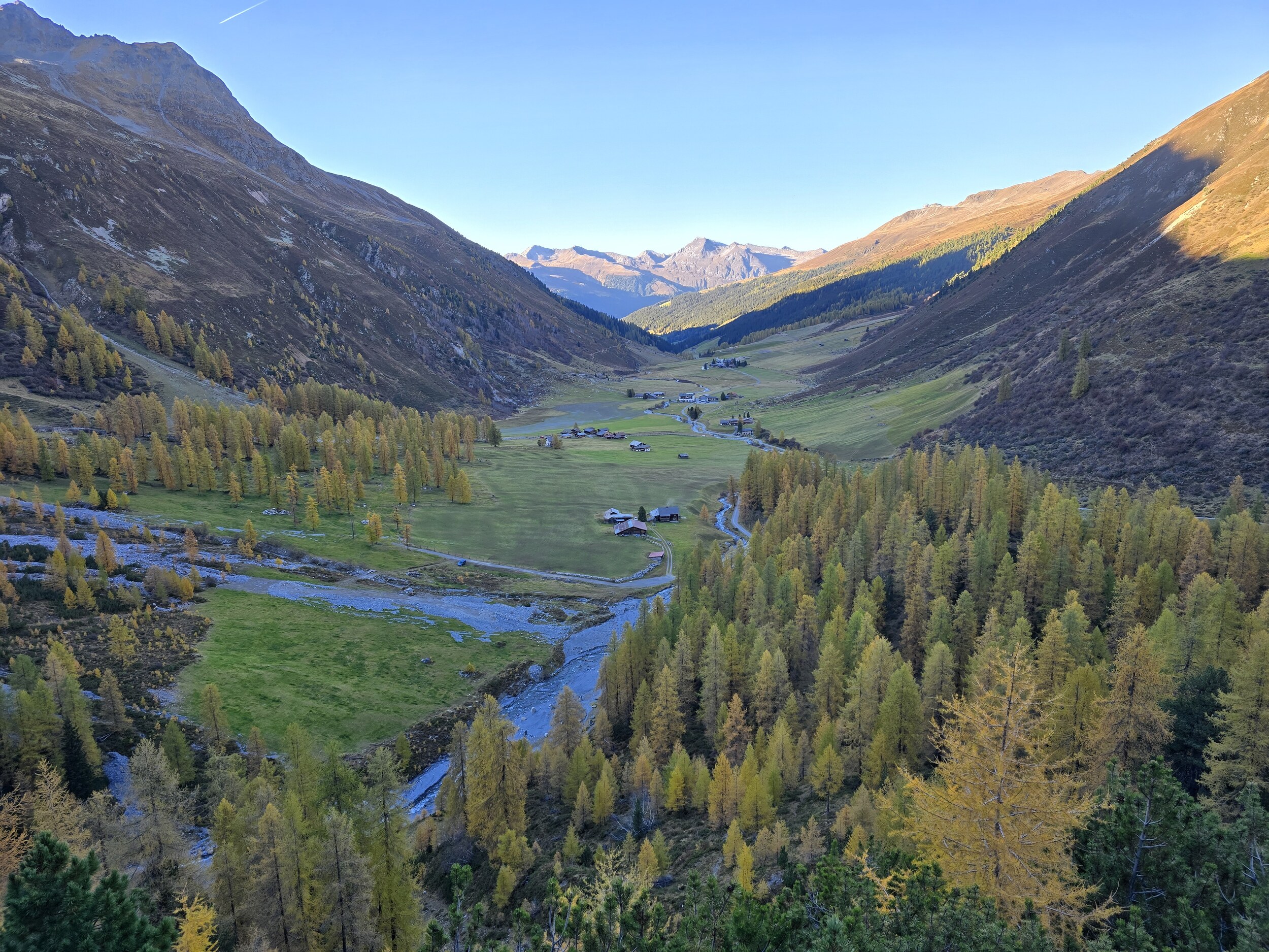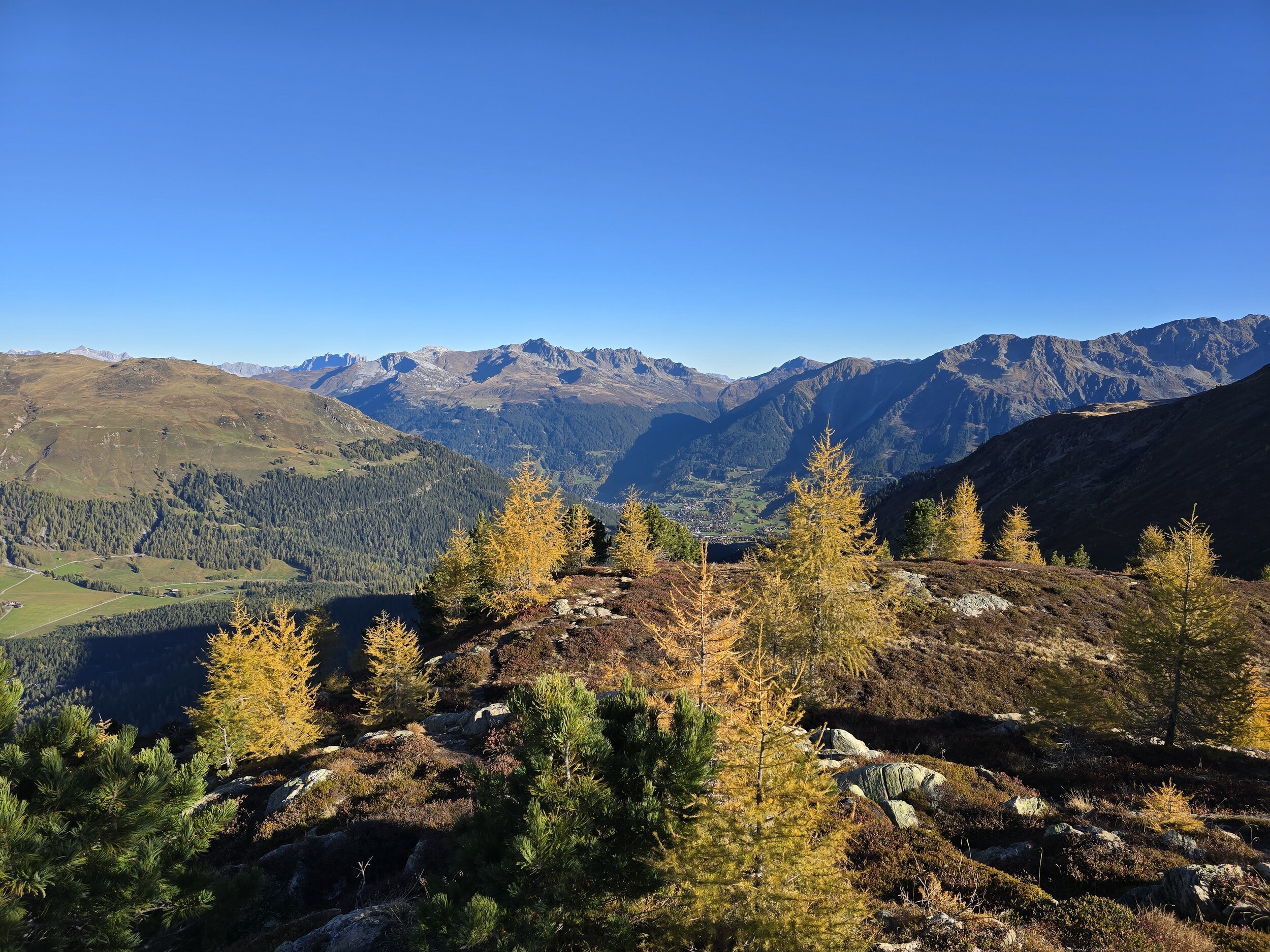 Als wir aus dem Dukantal kommen, werden wir von eine wunderschöne herbstlichen Färbung der Lärchen in Sertig überrascht. Das hätte ich so nicht erwartet, sind doch die meisten Lärchen in dieser Höhenlage noch deutlich grüner. Leider liegt das Tal bereits im Schatten, die gelben Lärchen sind aber dennoch sehr schön.
