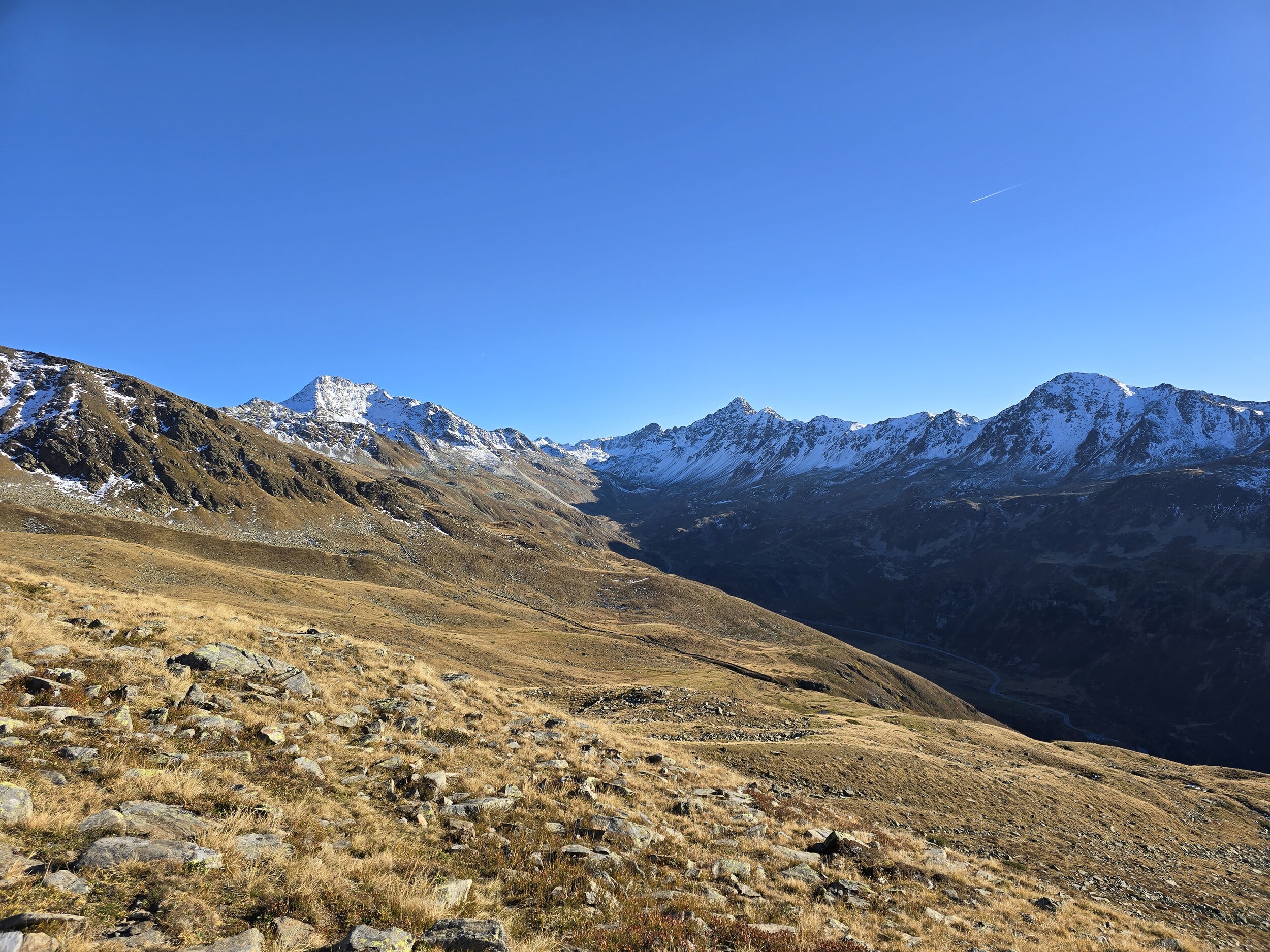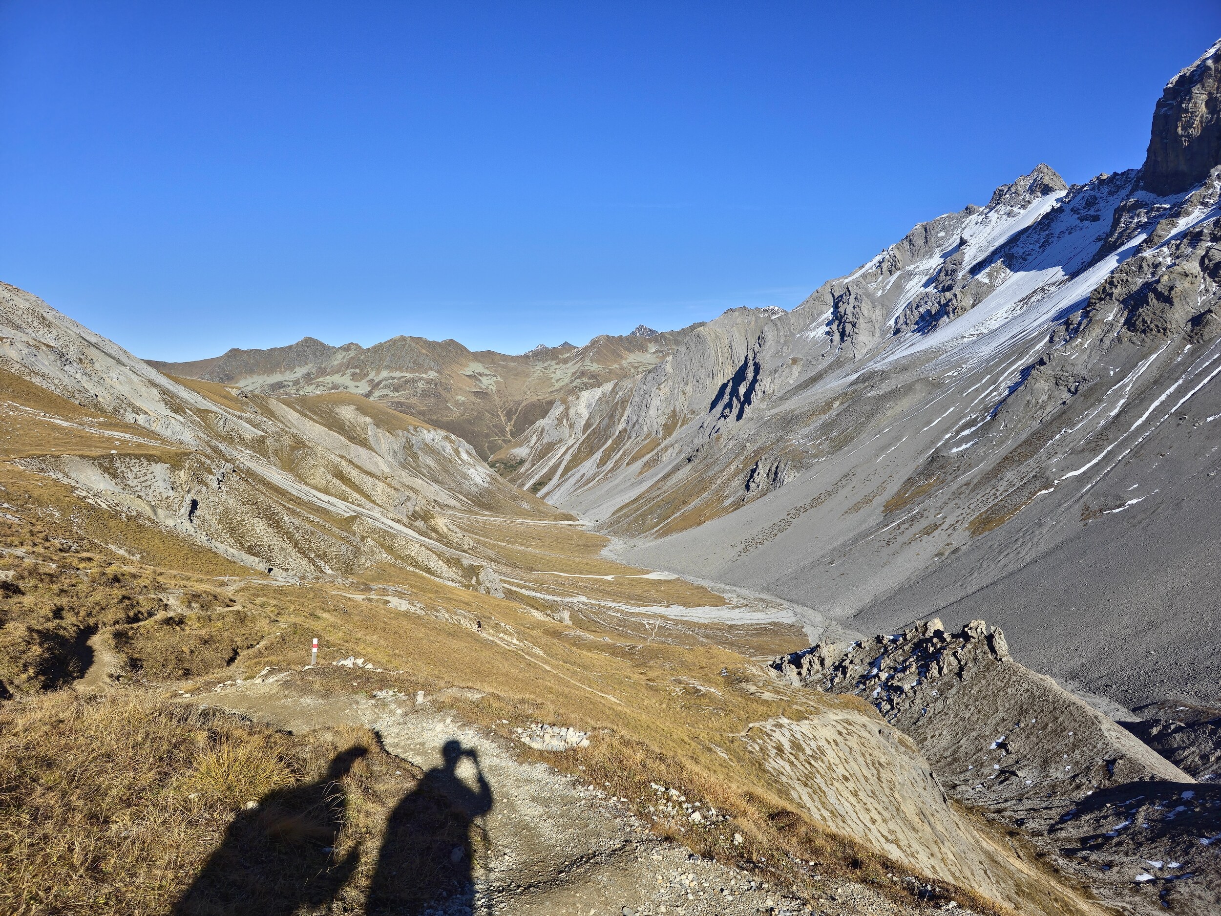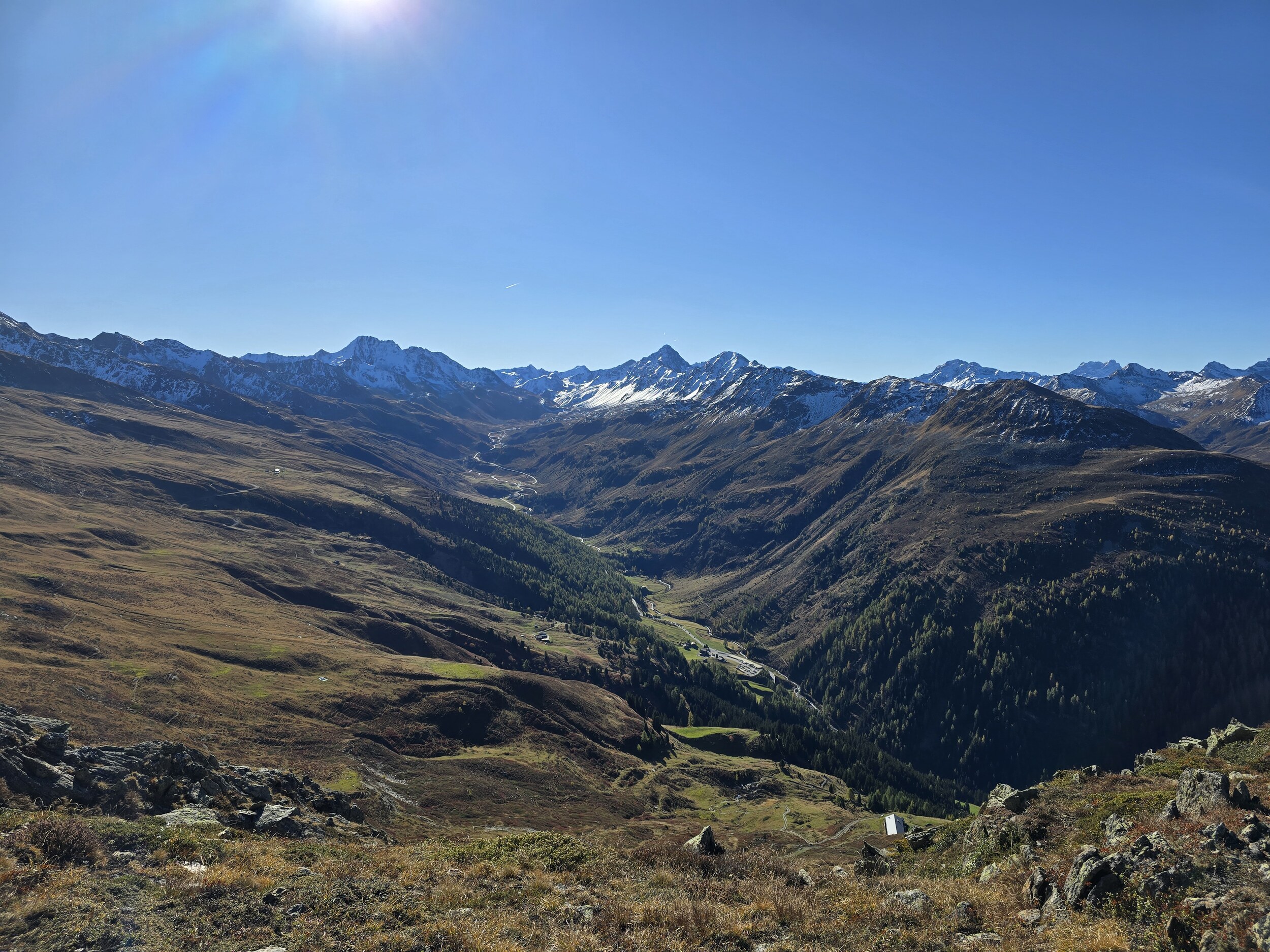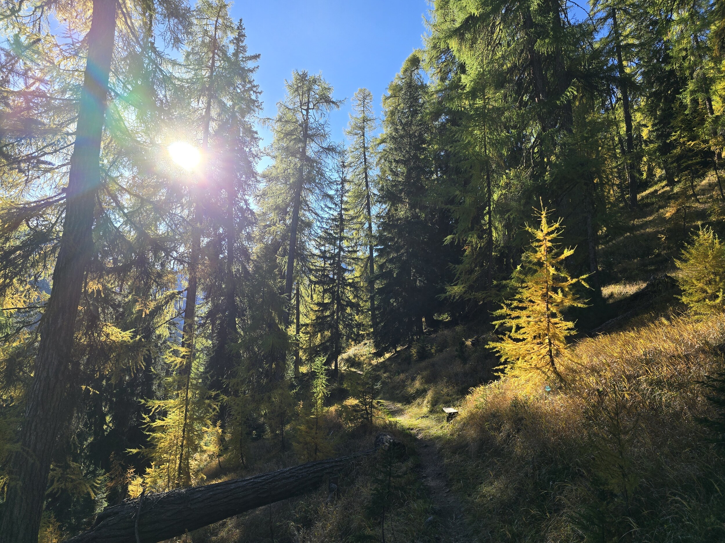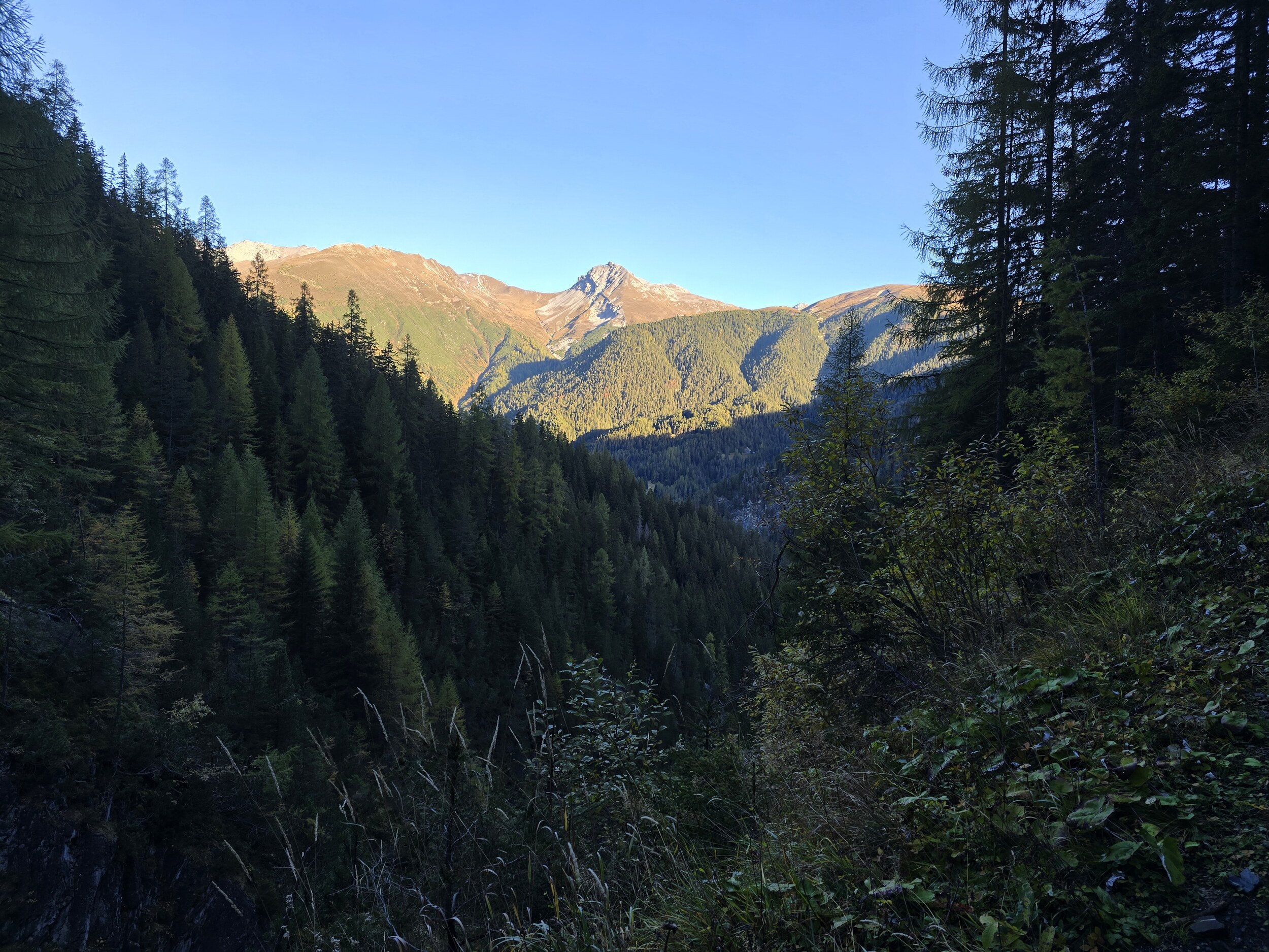 Als wir aus dem Dukantal kommen, werden wir von eine wunderschöne herbstlichen Färbung der Lärchen in Sertig überrascht. Das hätte ich so nicht erwartet, sind doch die meisten Lärchen in dieser Höhenlage noch deutlich grüner. Leider liegt das Tal bereits im Schatten, die gelben Lärchen sind aber dennoch sehr schön.