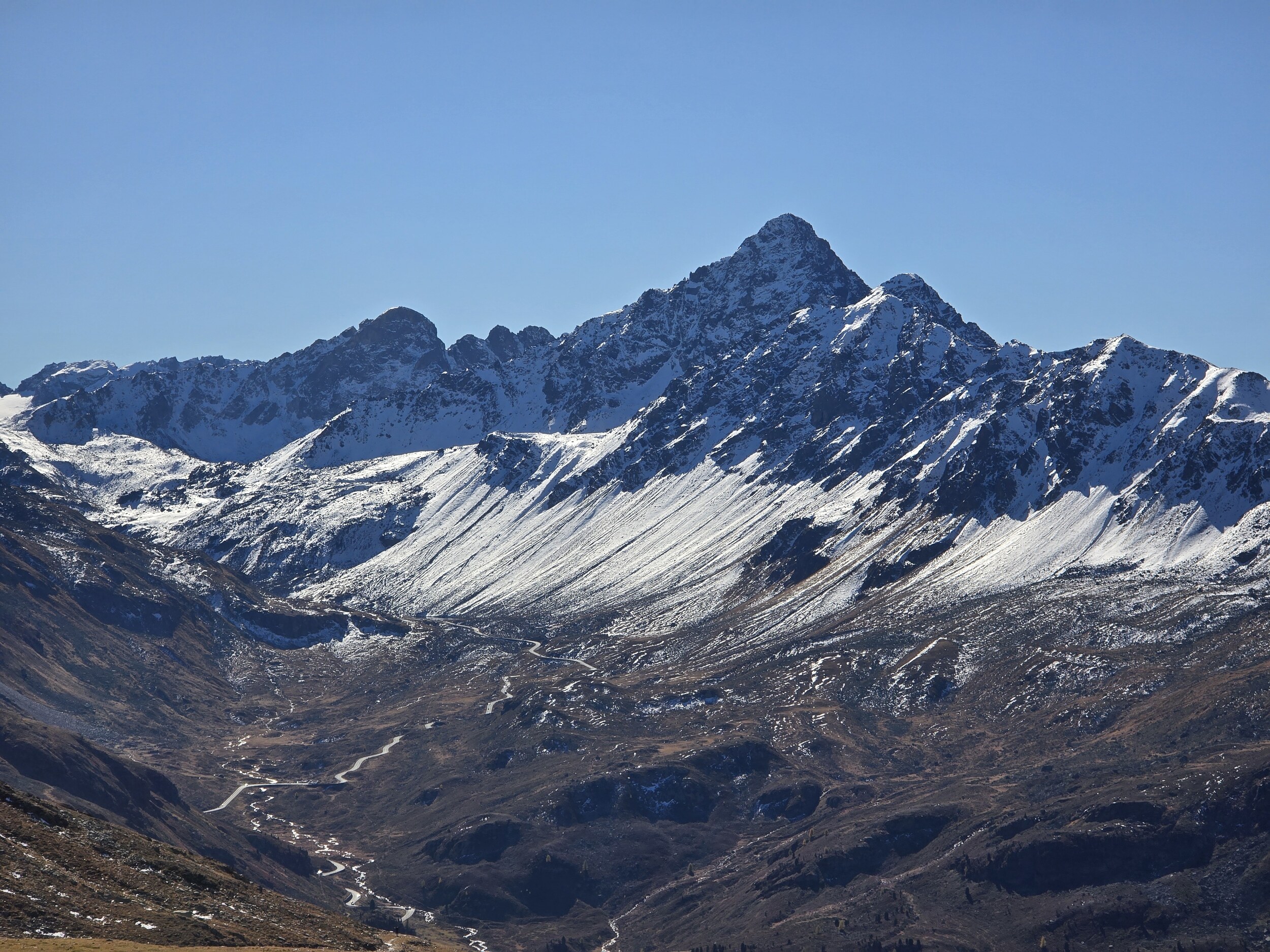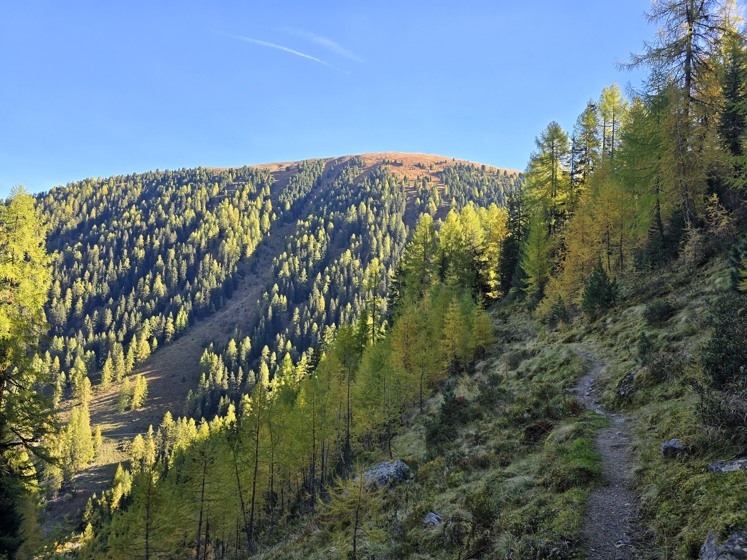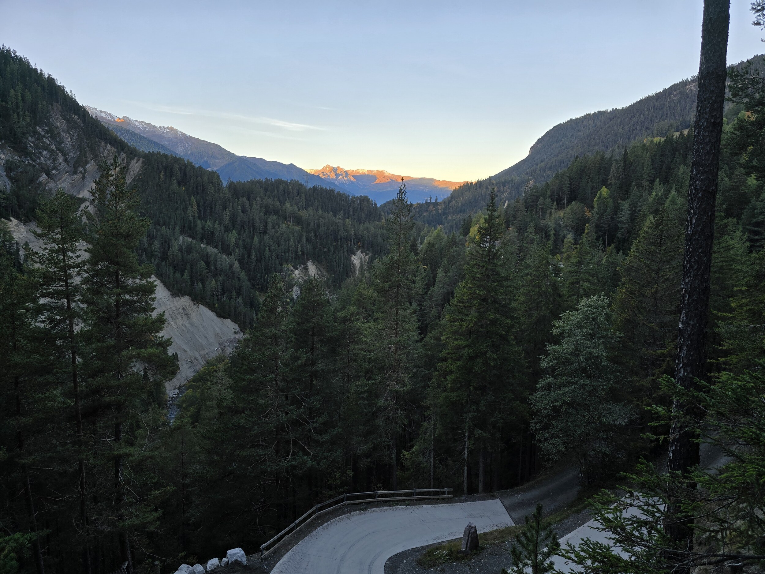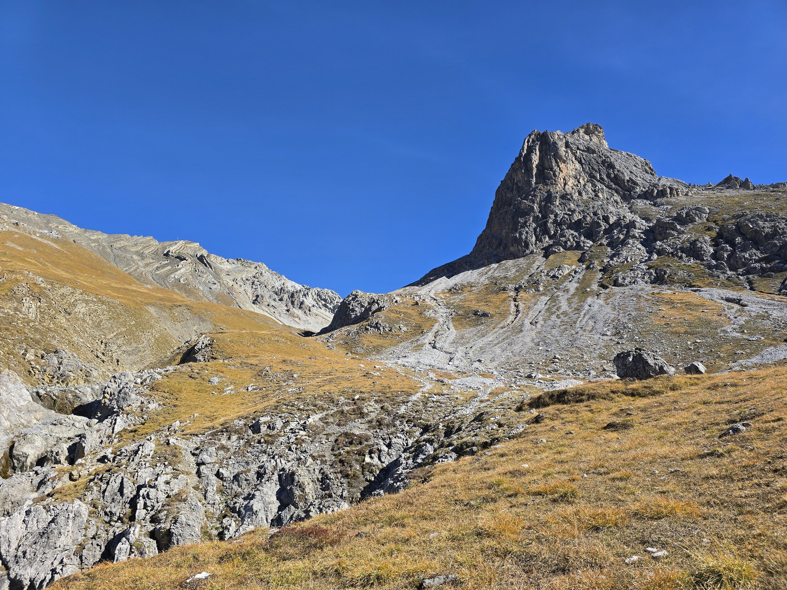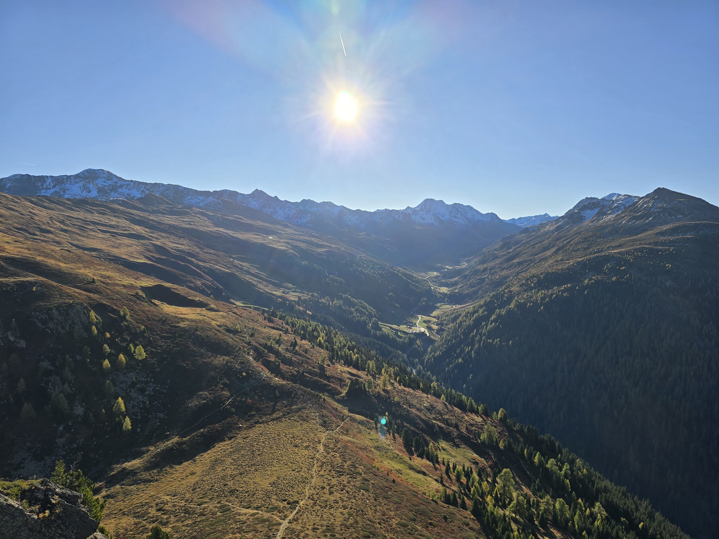 Als wir aus dem Dukantal kommen, werden wir von eine wunderschöne herbstlichen Färbung der Lärchen in Sertig überrascht. Das hätte ich so nicht erwartet, sind doch die meisten Lärchen in dieser Höhenlage noch deutlich grüner. Leider liegt das Tal bereits im Schatten, die gelben Lärchen sind aber dennoch sehr schön.
