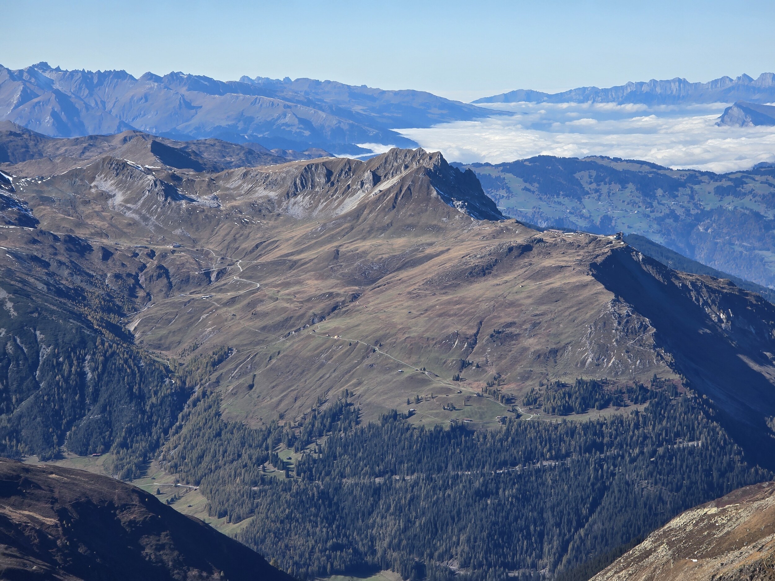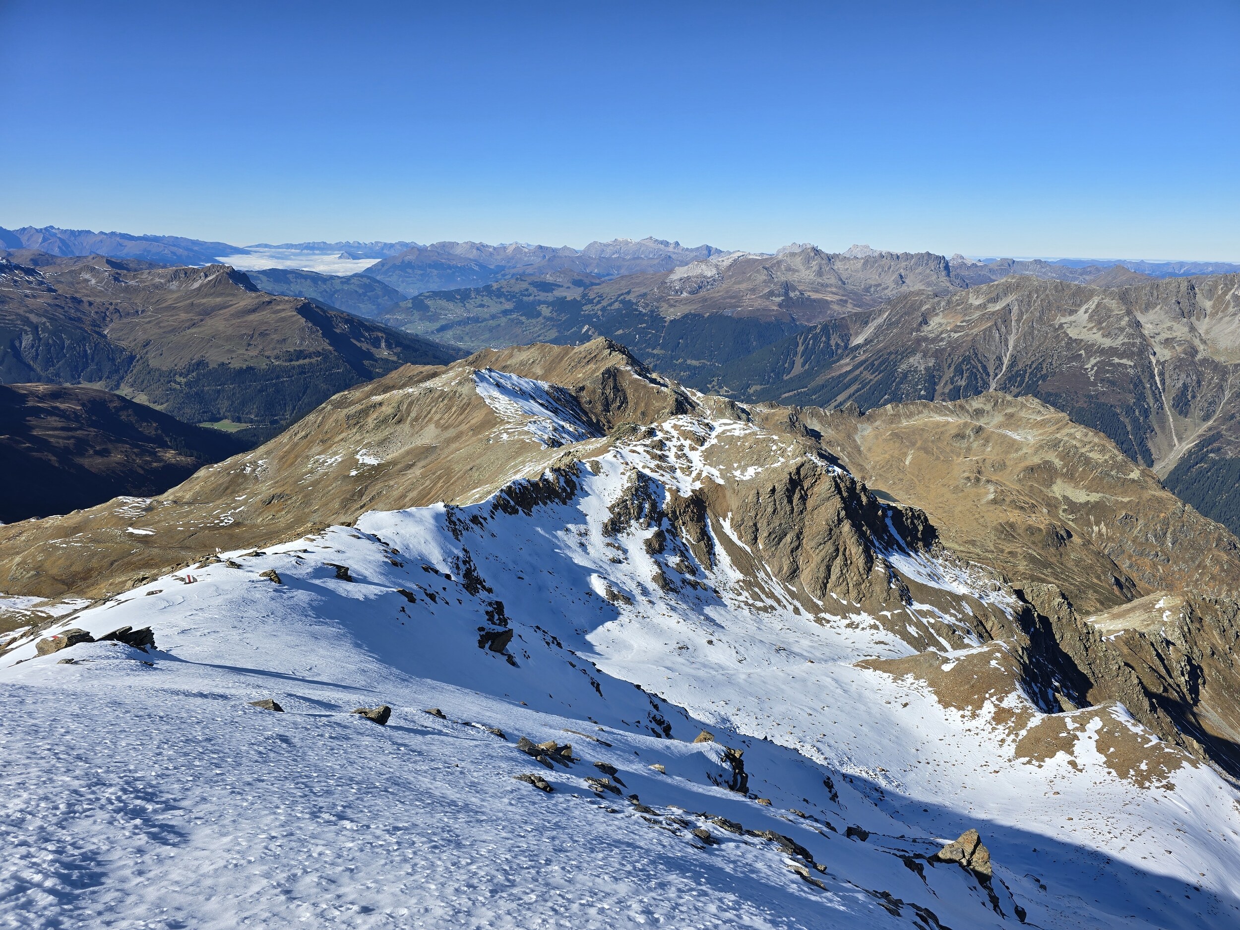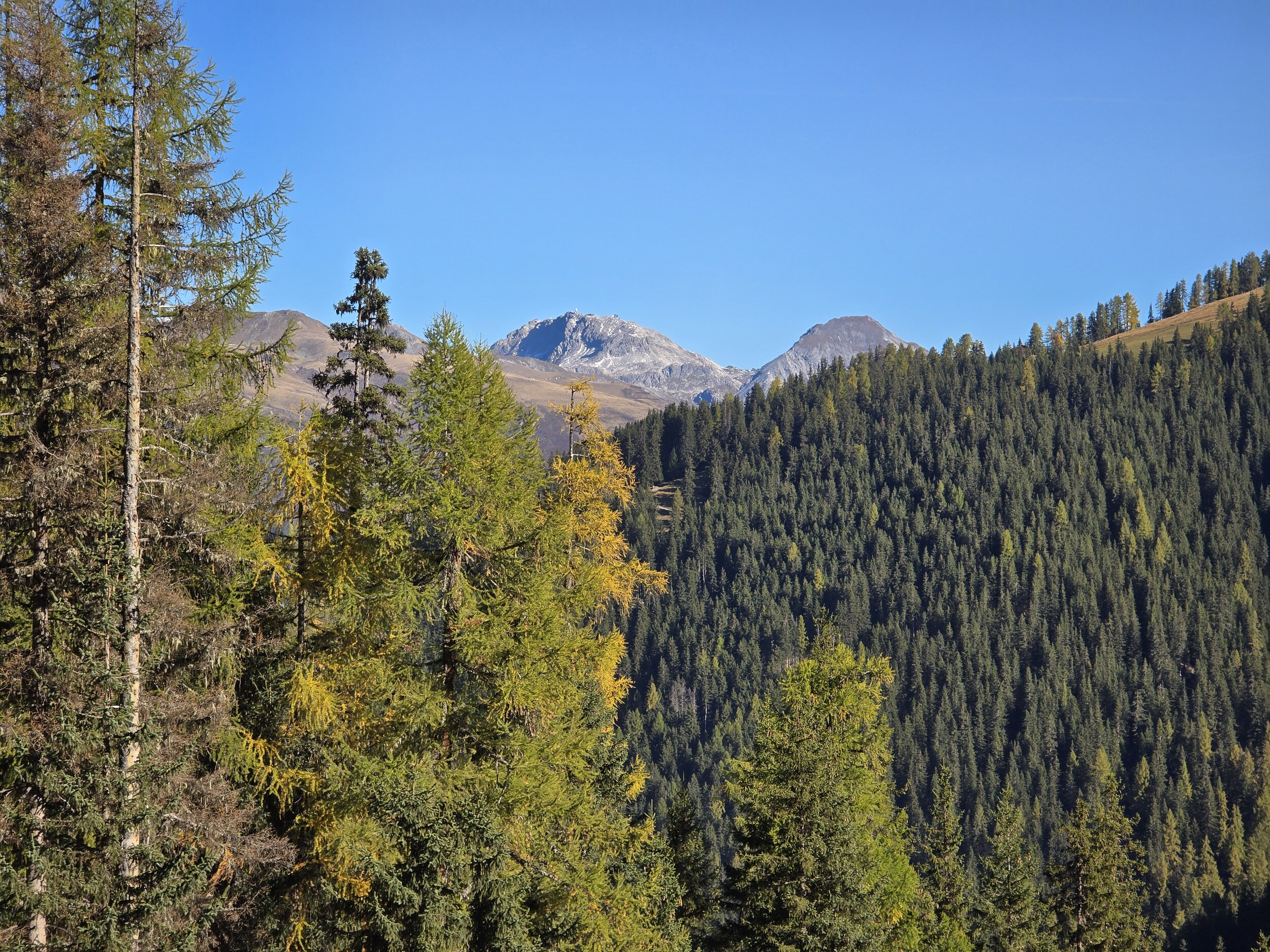 Das Ziel für diesen Sonntag ist das 2980 m hohe Pischahorn, sofern die Schneelage einen Aufstieg zulässt. So starte ich am Morgen in Davos Dorf. Als erstes steige ich von dort zum Seehorn auf. Anfangs startet der Aufstieg gemächlich, bald wird es aber ziemlich steil mit etlichen Treppenstufen. Obwohl das linke Knie und die linke Hüfte noch etwas von der Belastung des Vortages etwas zwickt, komme ich gut voran, sodass ich nach rund 1h 15 min auf dem Gipfel des Seehorns ankomme. Die Aussicht vom Seehorn kann sich dann durchaus sehen lassen. Die Lärchen hier oben sind schon gelb verfärbt, was ein äusserst schönes Gesamtbild ergibt.
