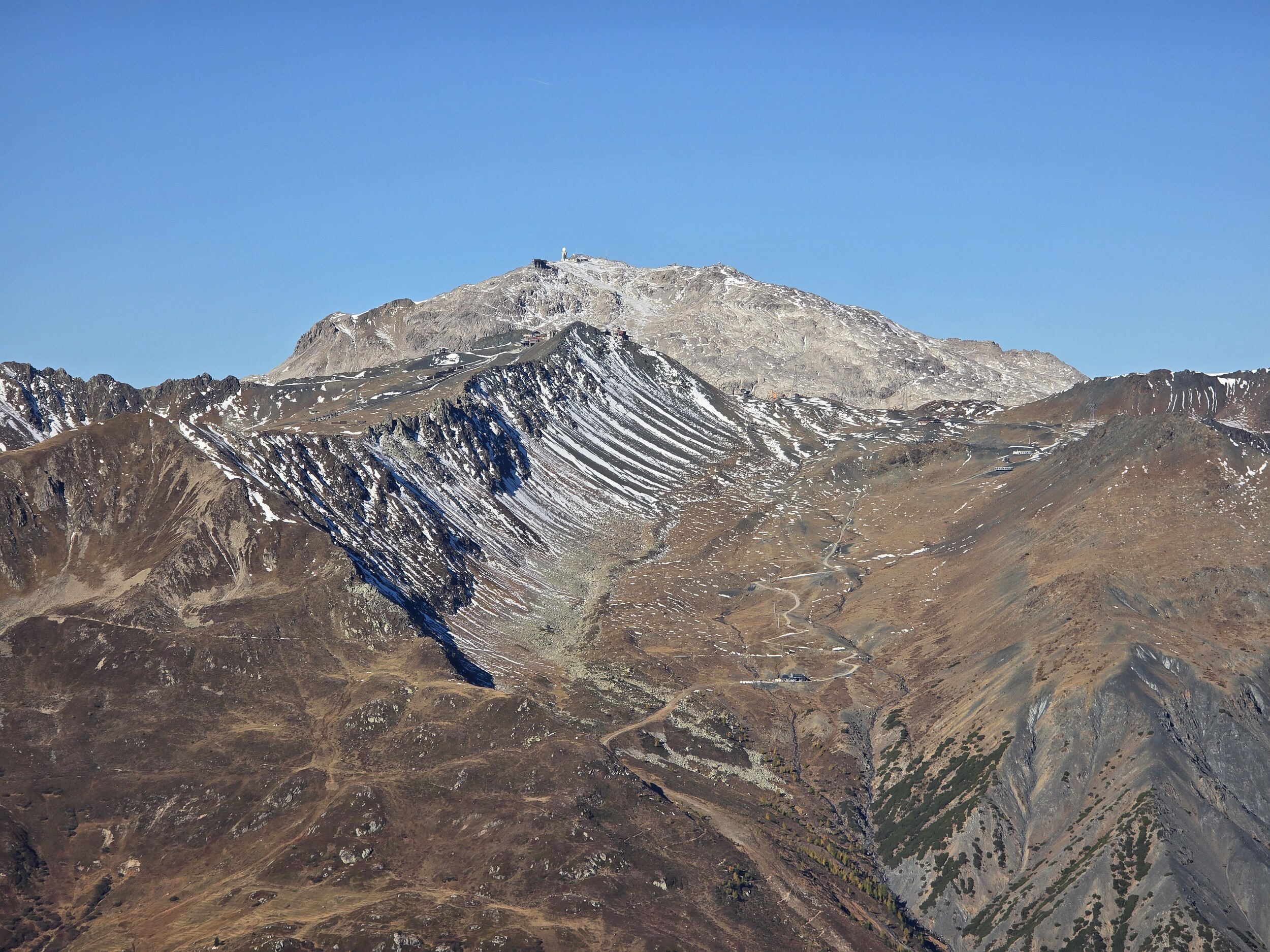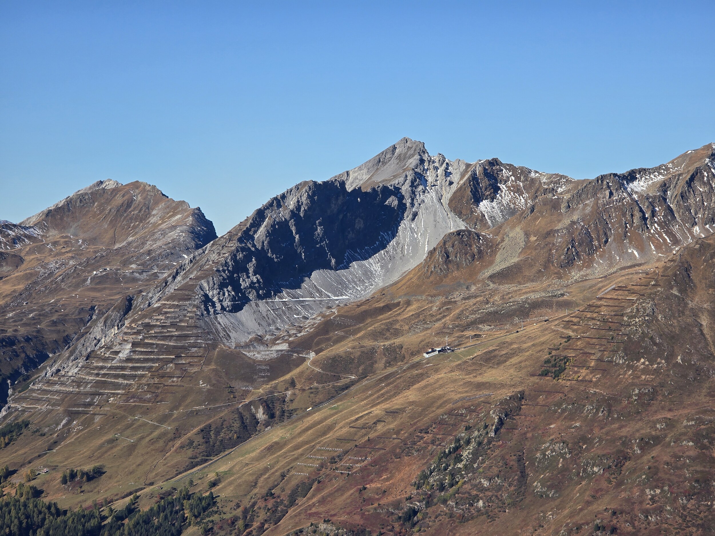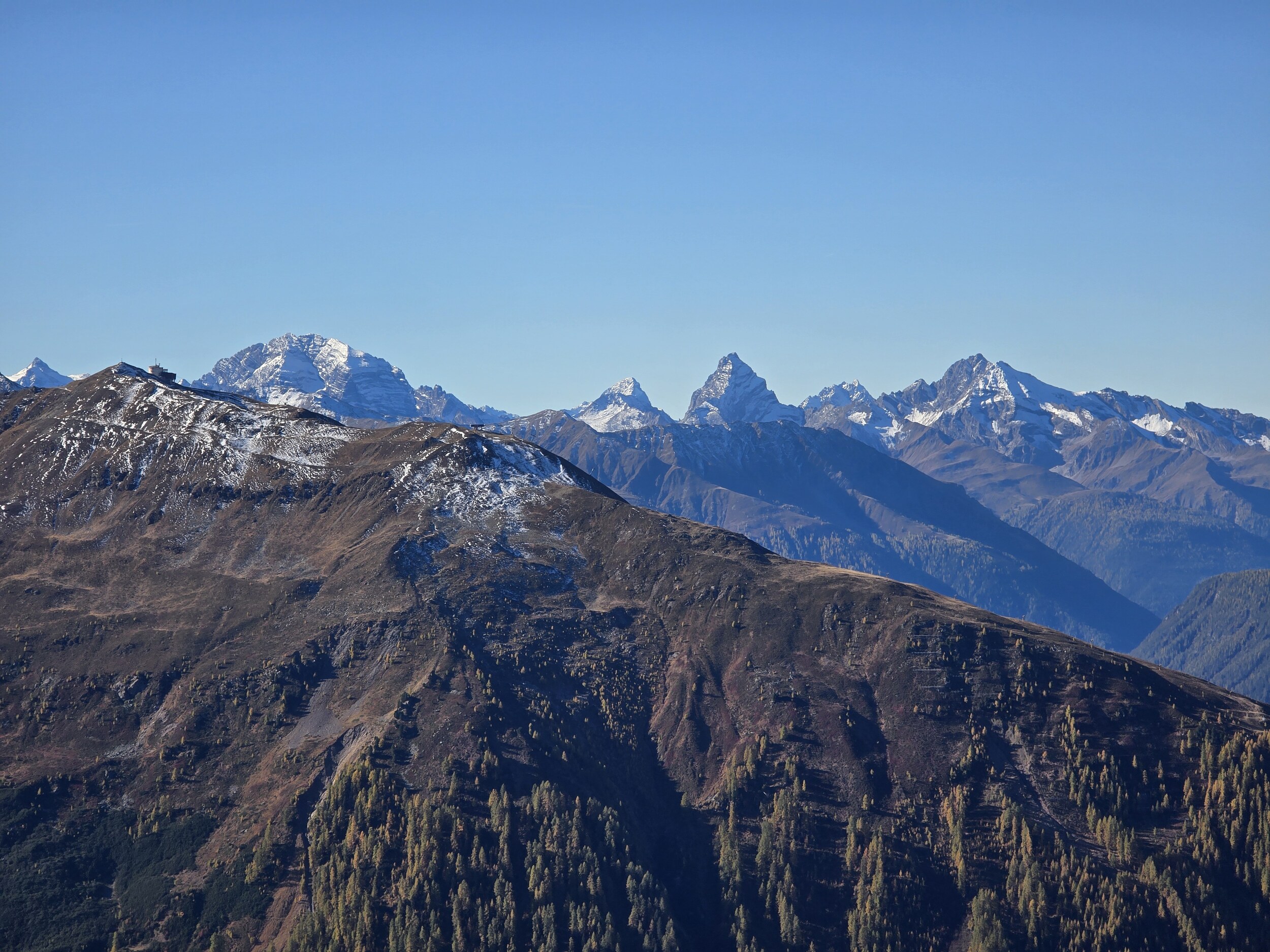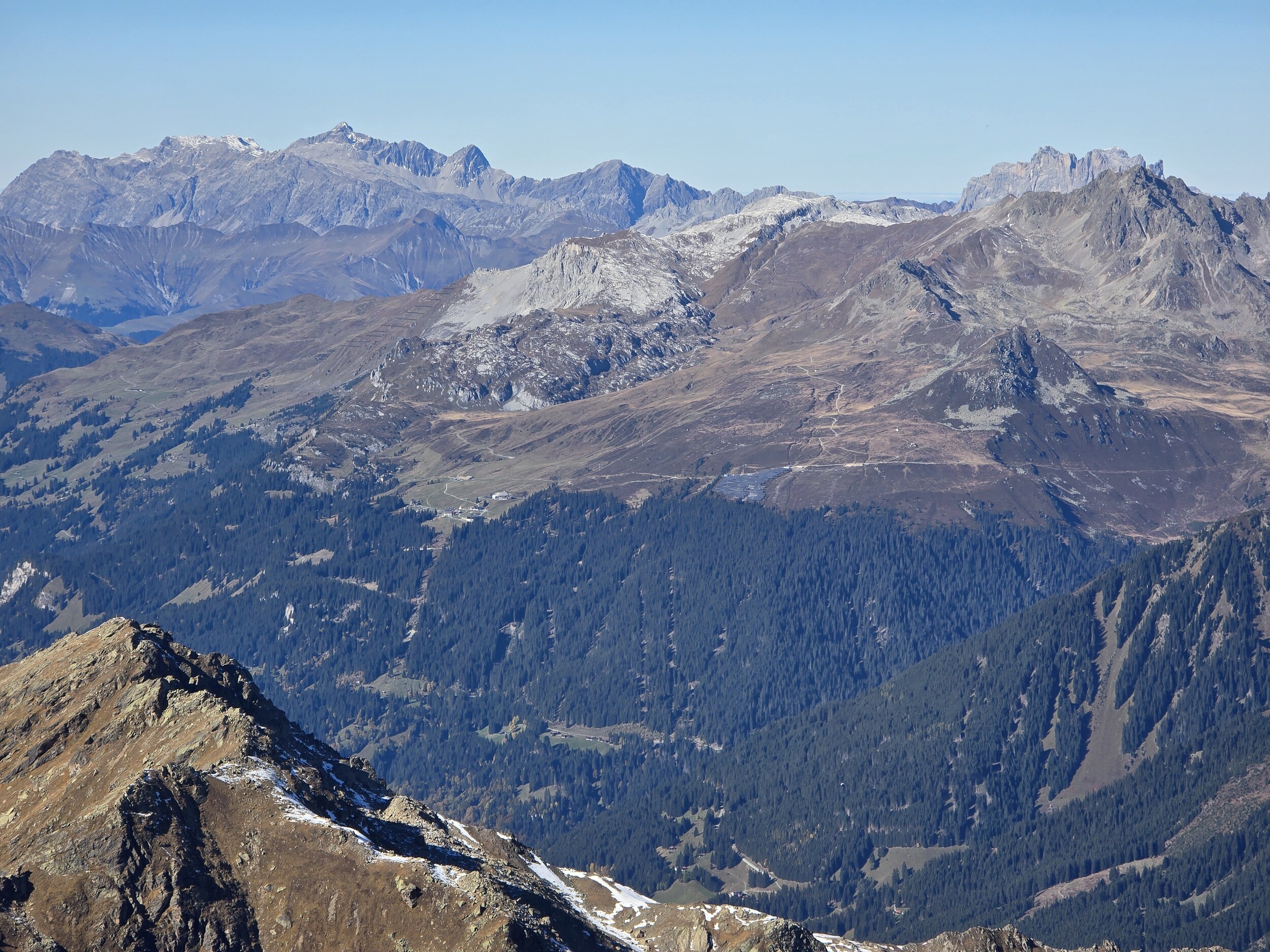Das Ziel für diesen Sonntag ist das 2980 m hohe Pischahorn, sofern die Schneelage einen Aufstieg zulässt. So starte ich am Morgen in Davos Dorf. Als erstes steige ich von dort zum Seehorn auf. Anfangs startet der Aufstieg gemächlich, bald wird es aber ziemlich steil mit etlichen Treppenstufen. Obwohl das linke Knie und die linke Hüfte noch etwas von der Belastung des Vortages etwas zwickt, komme ich gut voran, sodass ich nach rund 1h 15 min auf dem Gipfel des Seehorns ankomme. Die Aussicht vom Seehorn kann sich dann durchaus sehen lassen. Die Lärchen hier oben sind schon gelb verfärbt, was ein äusserst schönes Gesamtbild ergibt.