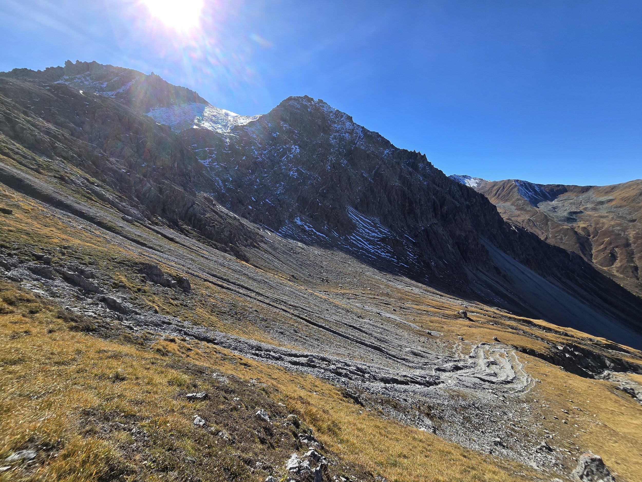 Mittlerweise ist es bereits gegen 12:30. So entscheiden wir uns an dieser Stelle eine Mittagspause einzulegen. Danach geht es frisch gestärkt weiter in Richtung Lengfurgga. Die verbleibenden rund 300 Höhenmeter sind dann relativ leicht zu gehen und führen über Wiesen und kleinere Geröll-Felder.