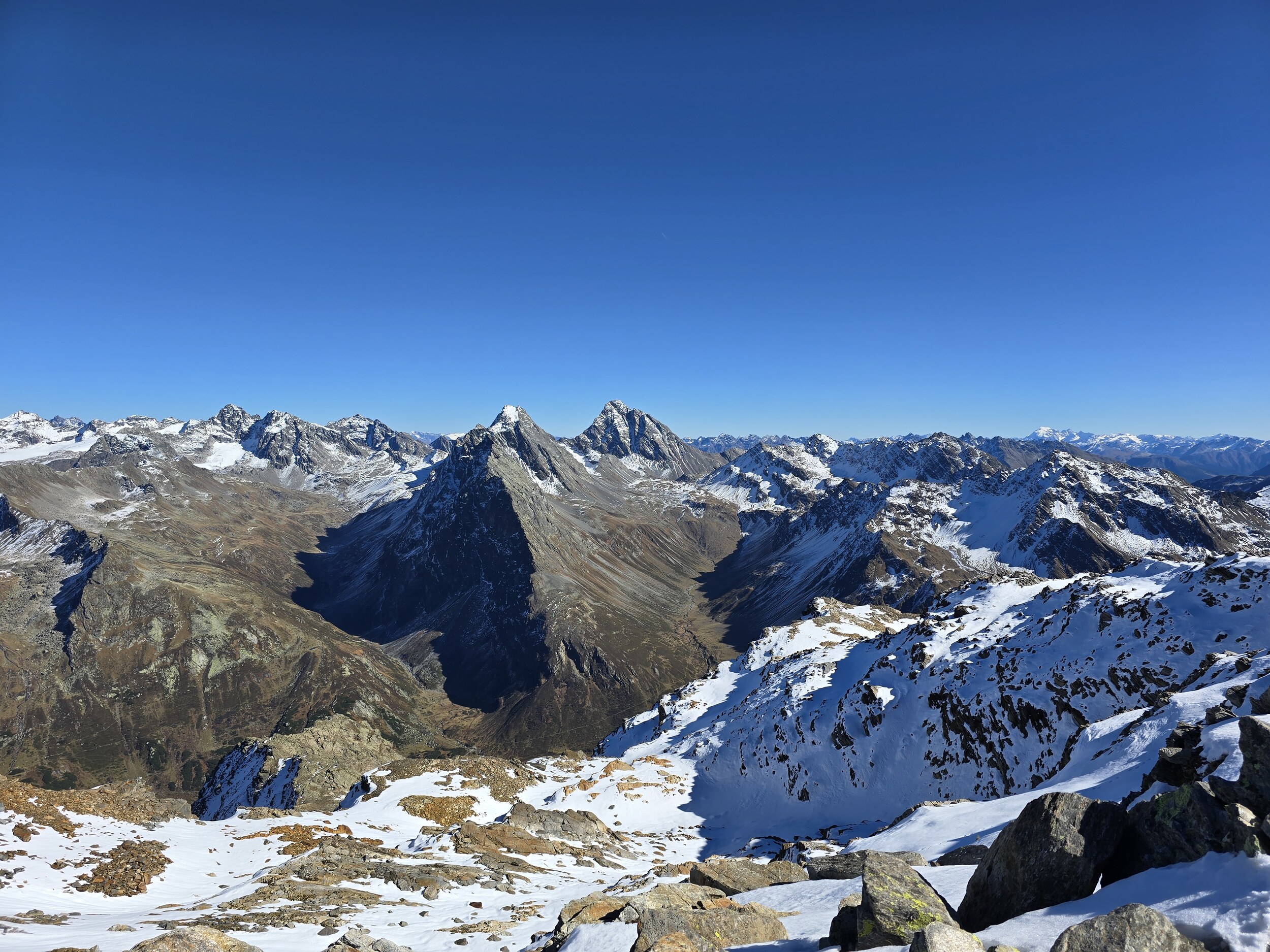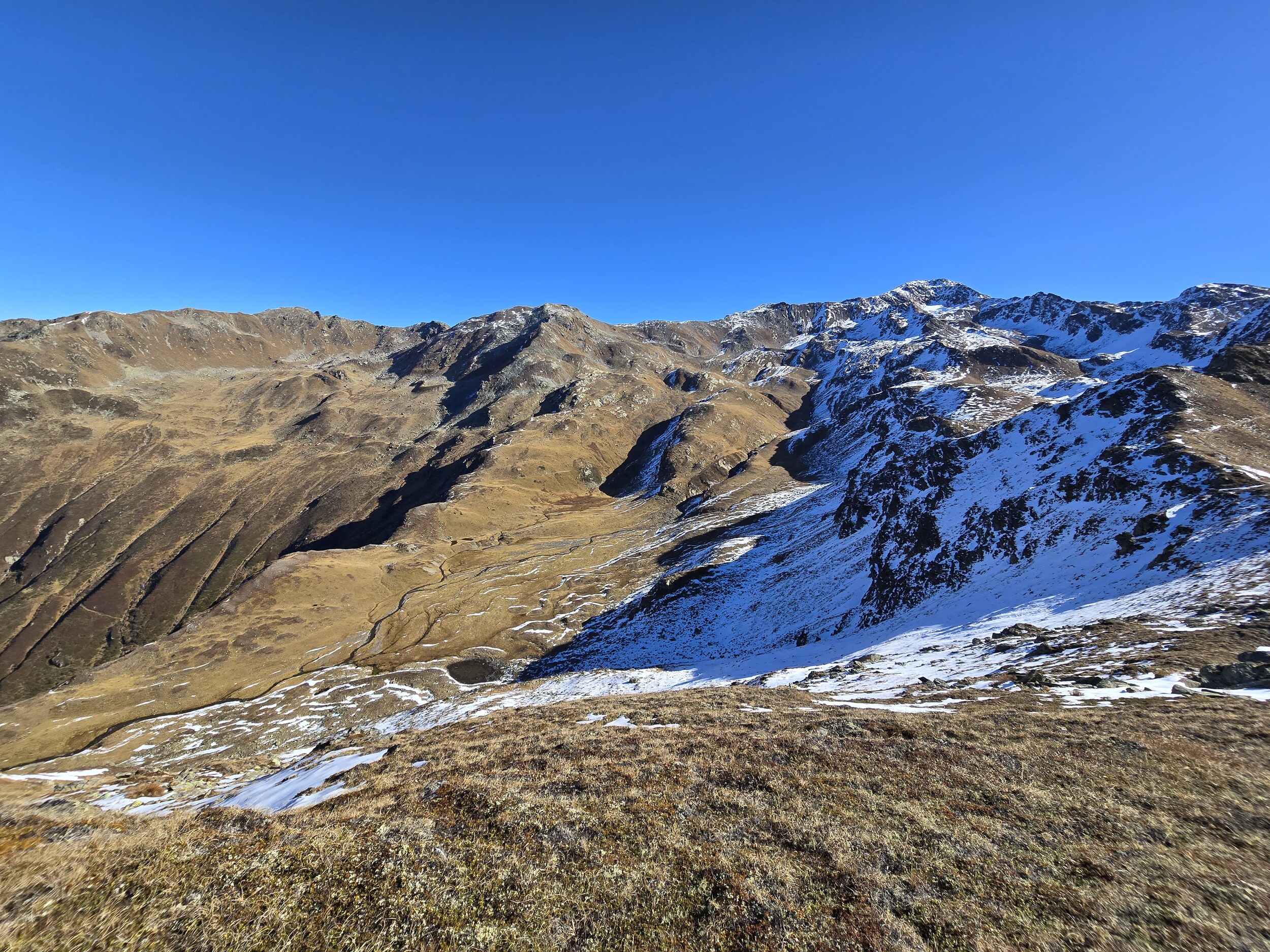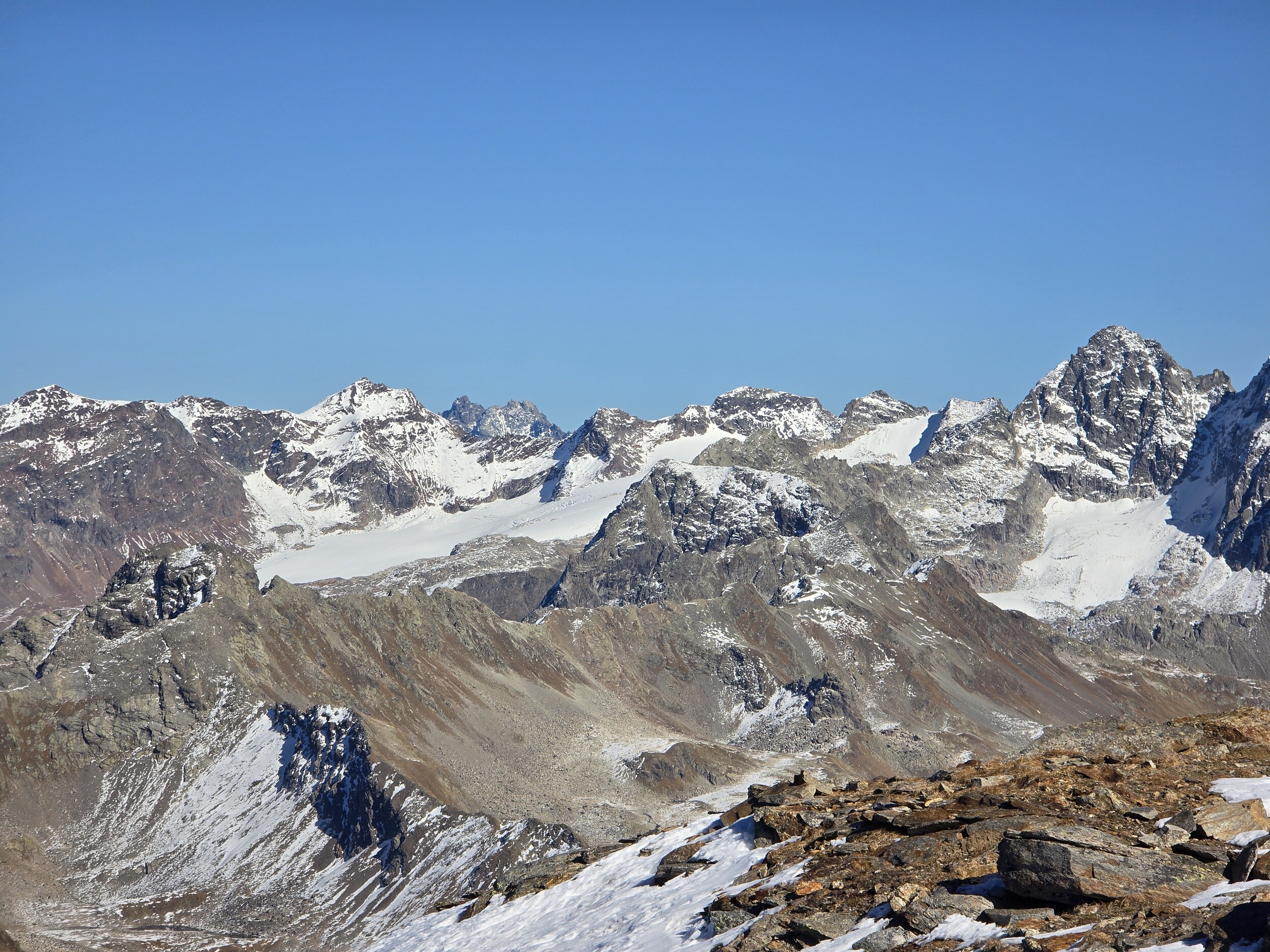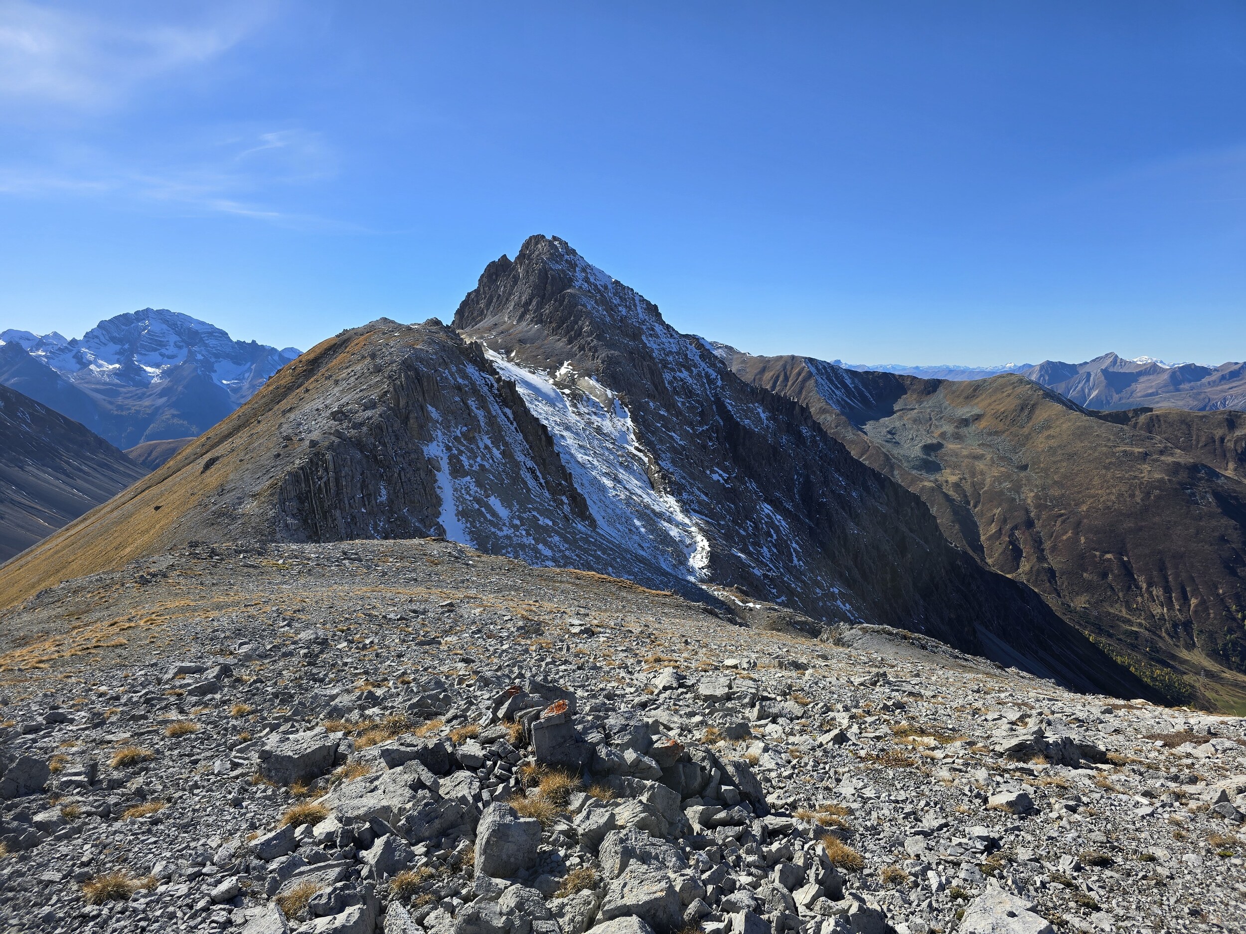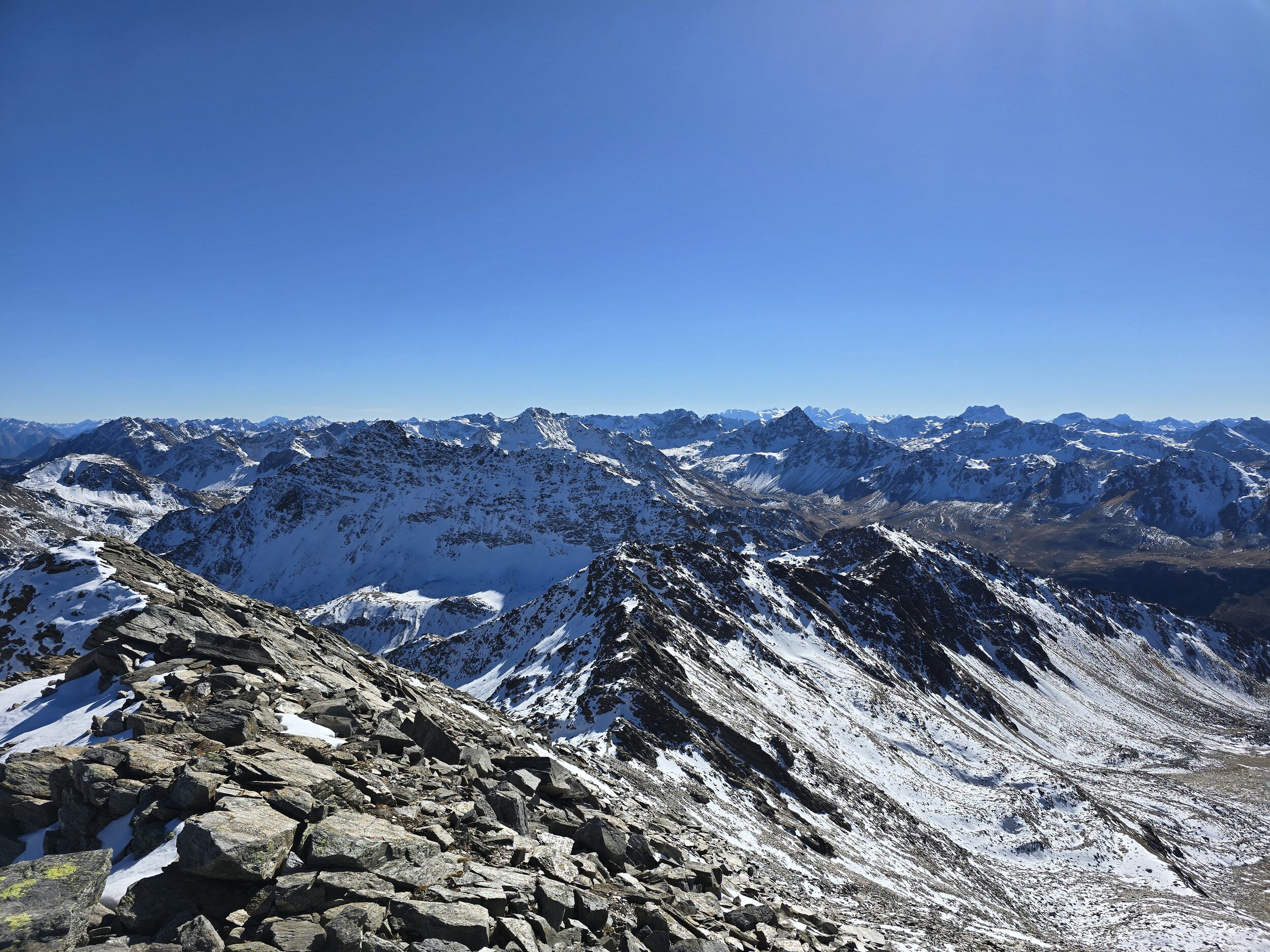 Nach einer ausgiebigen Mittagspause nehme ich den Aufstieg in Richtung Pischahorn in Angriff. Noch weiss ich nicht, ob ich es bis oben schaffen werde. Von unten sieht man, dass teilweise etwas Schnee auf dem Weg liegt. Ab dem 2740 m hohen Vorgipfel ändert die Hangausrichtung von West nach Südost, sodass hier deutlich weniger Schnee liegt. Einzig auf der Überquerung des Grates direkt nach dem Vorgipfel liegt noch ordentlich Schnee, das Gelände ist hier aber relativ flach und nicht ausgesetzt, weshalb das absolut unkritisch ist. Der weitere Weg ist dann grösstenteils schneefrei, für ein angegebenes T3 aber doch eher auf der anspruchsvollen bzw. ausgesetzten Seite, insbesondere da es gar keine Sicherungen gibt. Dennoch komme ich problemlos hoch. Oben angekommen erwartet mich ein gewaltiges Panorama. Das Pischahorn gehört wohl zu den besten Aussichtsbergen hier in Davos. Nur vom Flüela Schwarzhorn ist das Panorama noch besser, aufgrund des vielen Schnees ist dort aber ein Aufstieg aktuell wohl kaum sinnvoll möglich. Es ist heute aber auch ein absoluter Traumtag mit wolkenfreiem Himmel und bester Weitsicht. Die verschneiten Bergspitzen machen das Panorama nochmals schöner. Insbesondere an den nordseitigen Hängen in Richtung Flüela Weisshorn sieht es teilweise schon richtiggehend winterlich aus.
