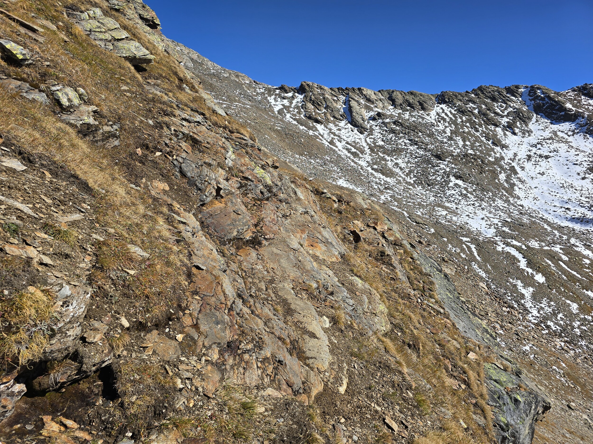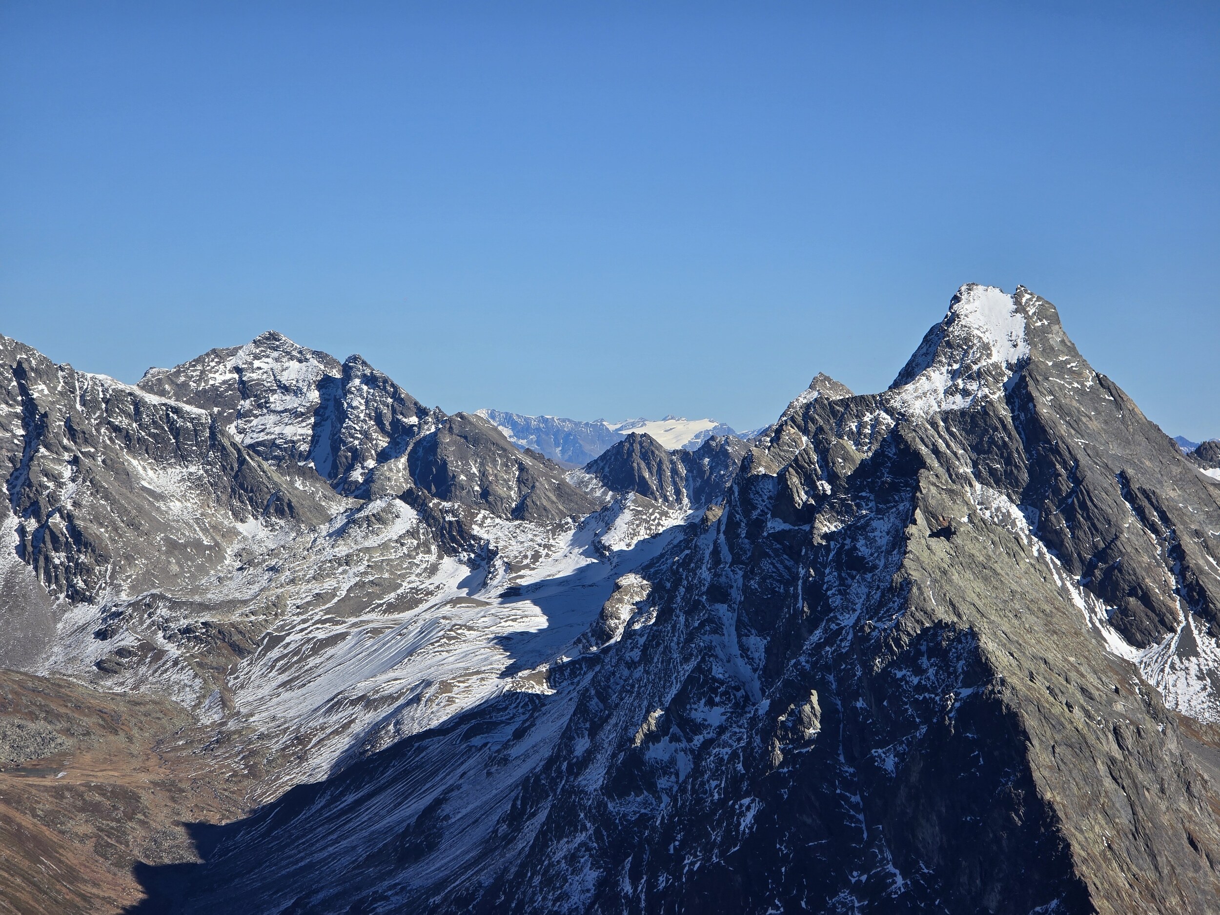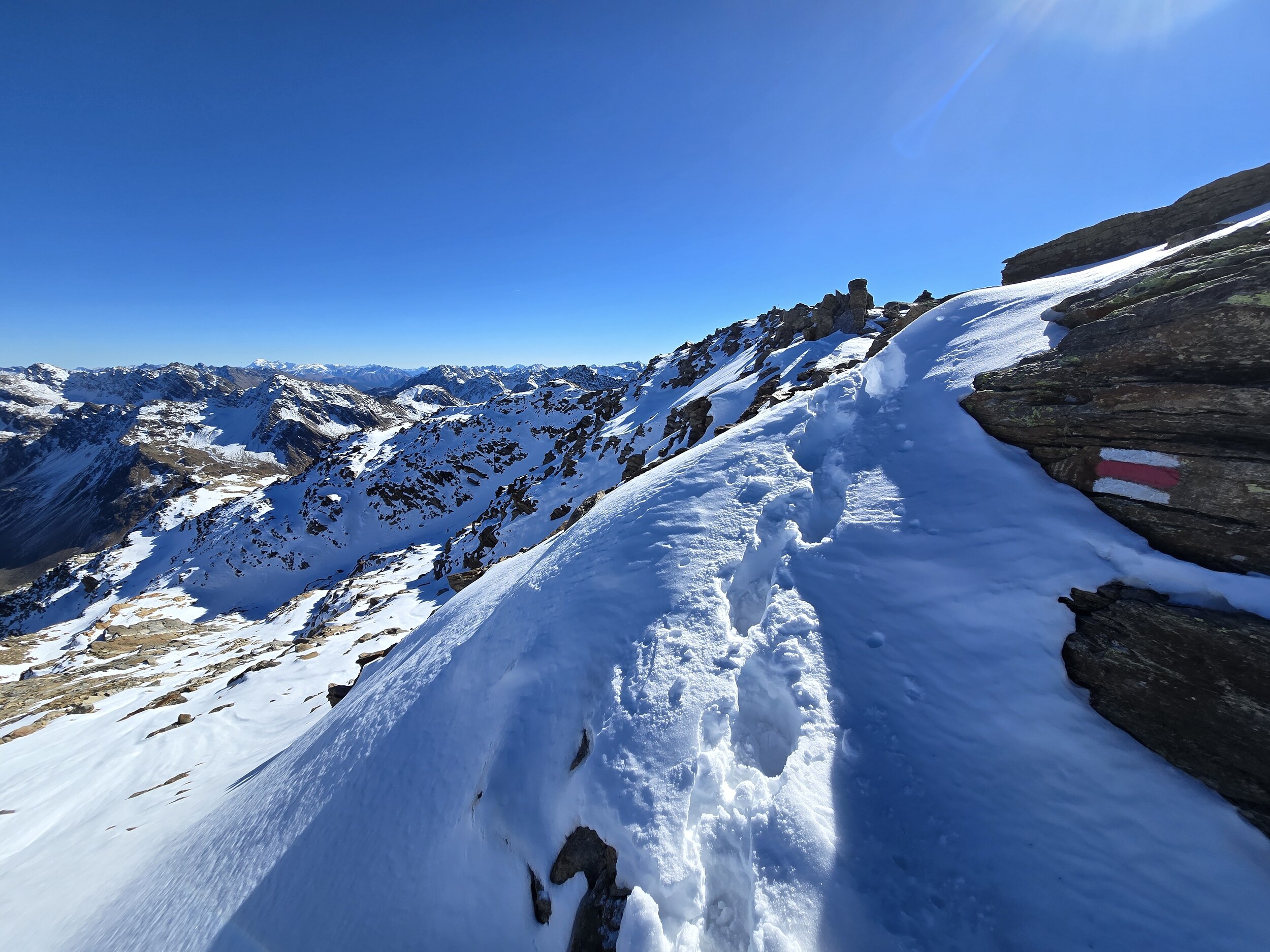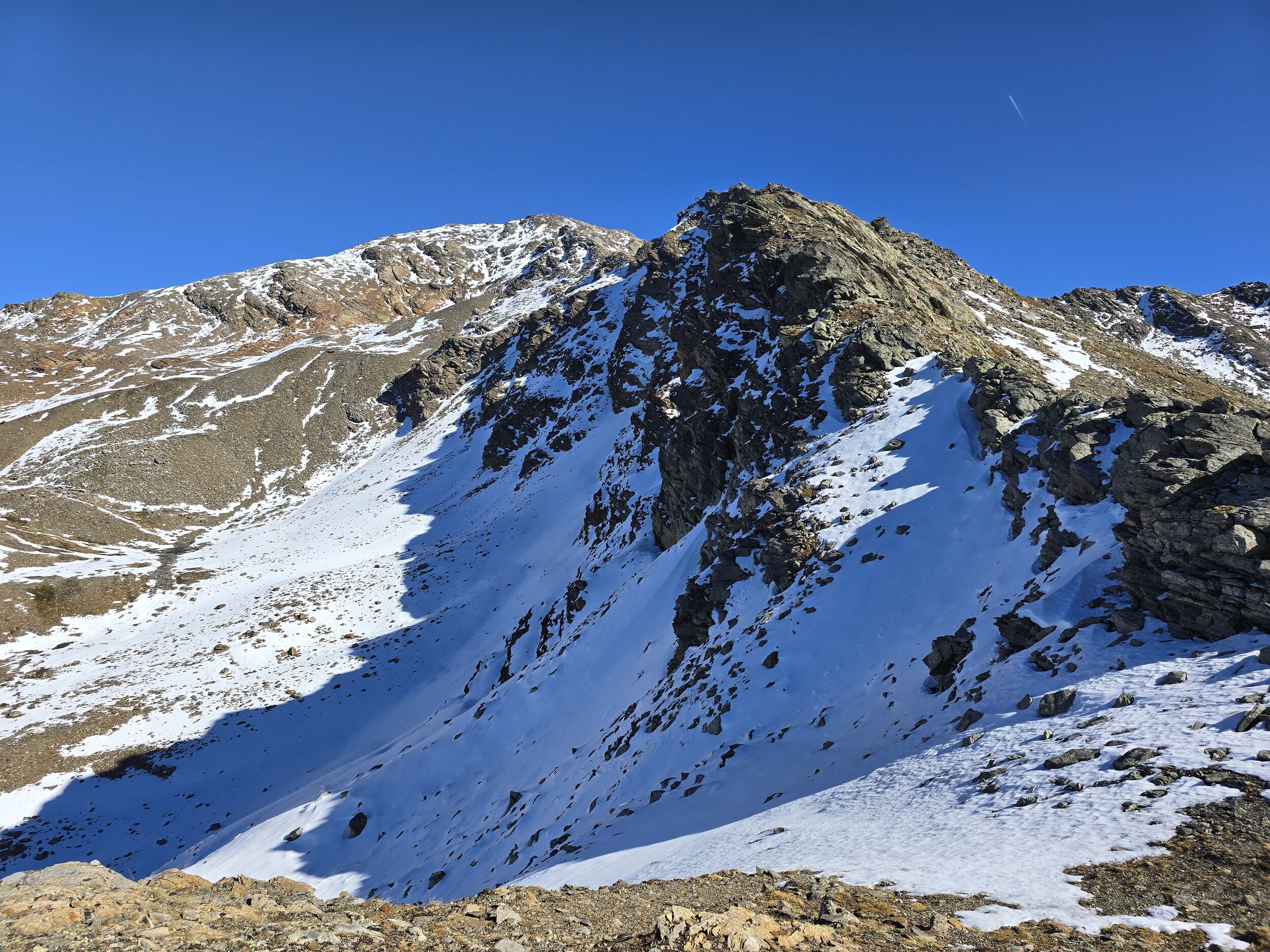 Nach einer ausgiebigen Mittagspause nehme ich den Aufstieg in Richtung Pischahorn in Angriff. Noch weiss ich nicht, ob ich es bis oben schaffen werde. Von unten sieht man, dass teilweise etwas Schnee auf dem Weg liegt. Ab dem 2740 m hohen Vorgipfel ändert die Hangausrichtung von West nach Südost, sodass hier deutlich weniger Schnee liegt. Einzig auf der Überquerung des Grates direkt nach dem Vorgipfel liegt noch ordentlich Schnee, das Gelände ist hier aber relativ flach und nicht ausgesetzt, weshalb das absolut unkritisch ist. Der weitere Weg ist dann grösstenteils schneefrei, für ein angegebenes T3 aber doch eher auf der anspruchsvollen bzw. ausgesetzten Seite, insbesondere da es gar keine Sicherungen gibt. Dennoch komme ich problemlos hoch. Oben angekommen erwartet mich ein gewaltiges Panorama. Das Pischahorn gehört wohl zu den besten Aussichtsbergen hier in Davos. Nur vom Flüela Schwarzhorn ist das Panorama noch besser, aufgrund des vielen Schnees ist dort aber ein Aufstieg aktuell wohl kaum sinnvoll möglich. Es ist heute aber auch ein absoluter Traumtag mit wolkenfreiem Himmel und bester Weitsicht. Die verschneiten Bergspitzen machen das Panorama nochmals schöner. Insbesondere an den nordseitigen Hängen in Richtung Flüela Weisshorn sieht es teilweise schon richtiggehend winterlich aus.