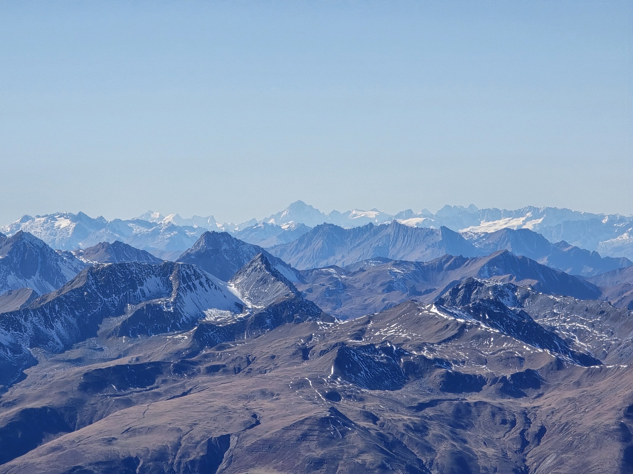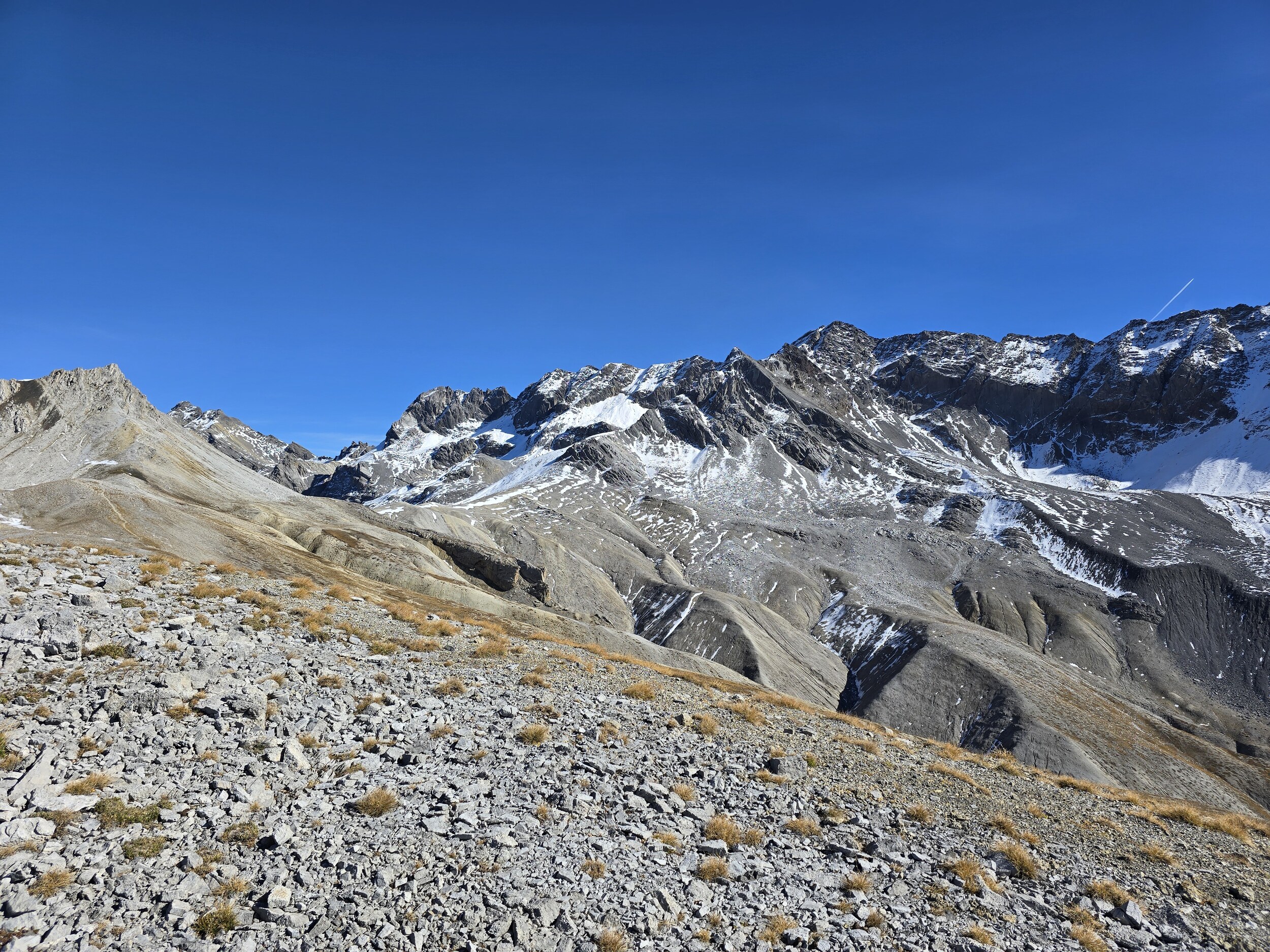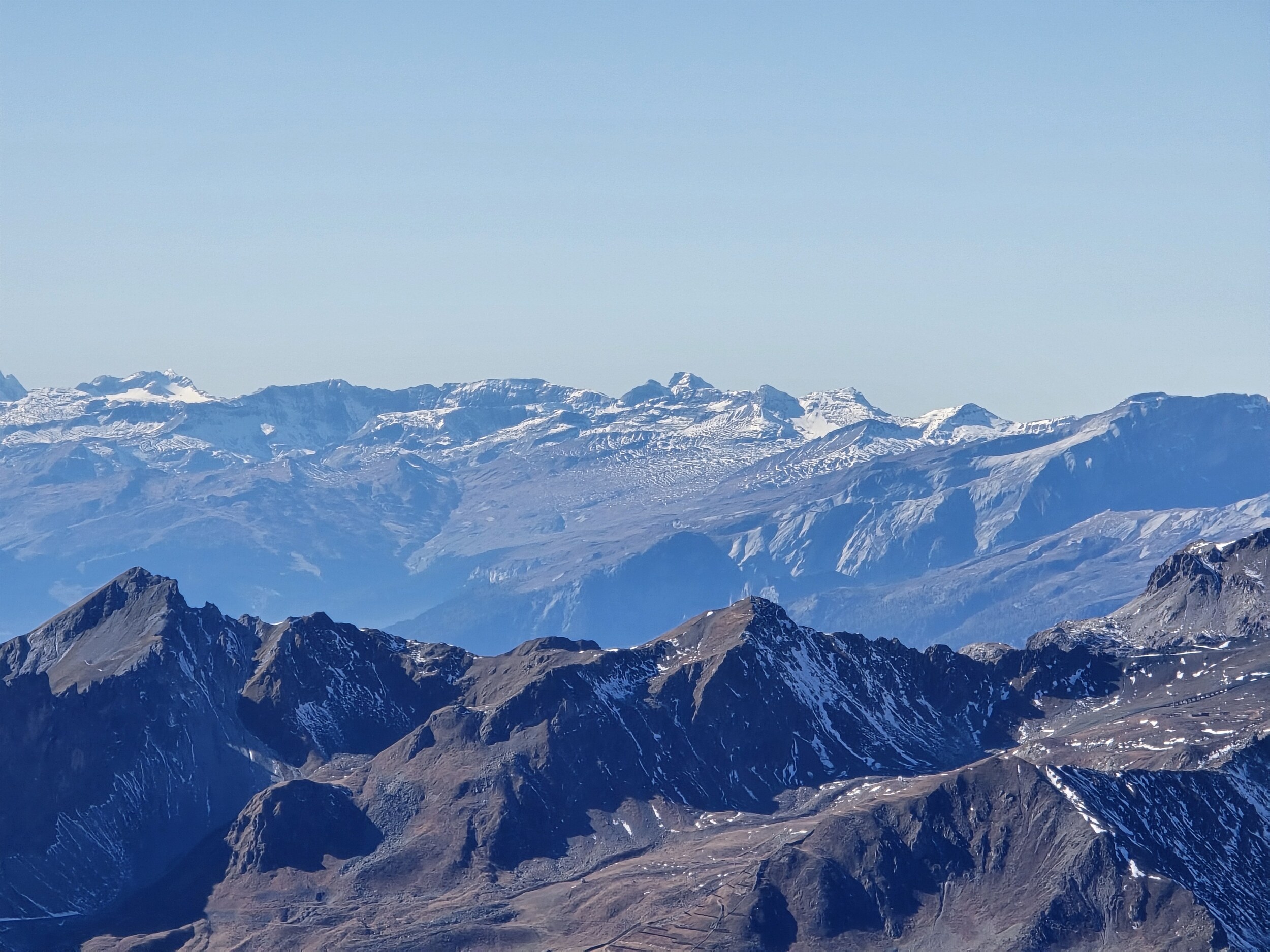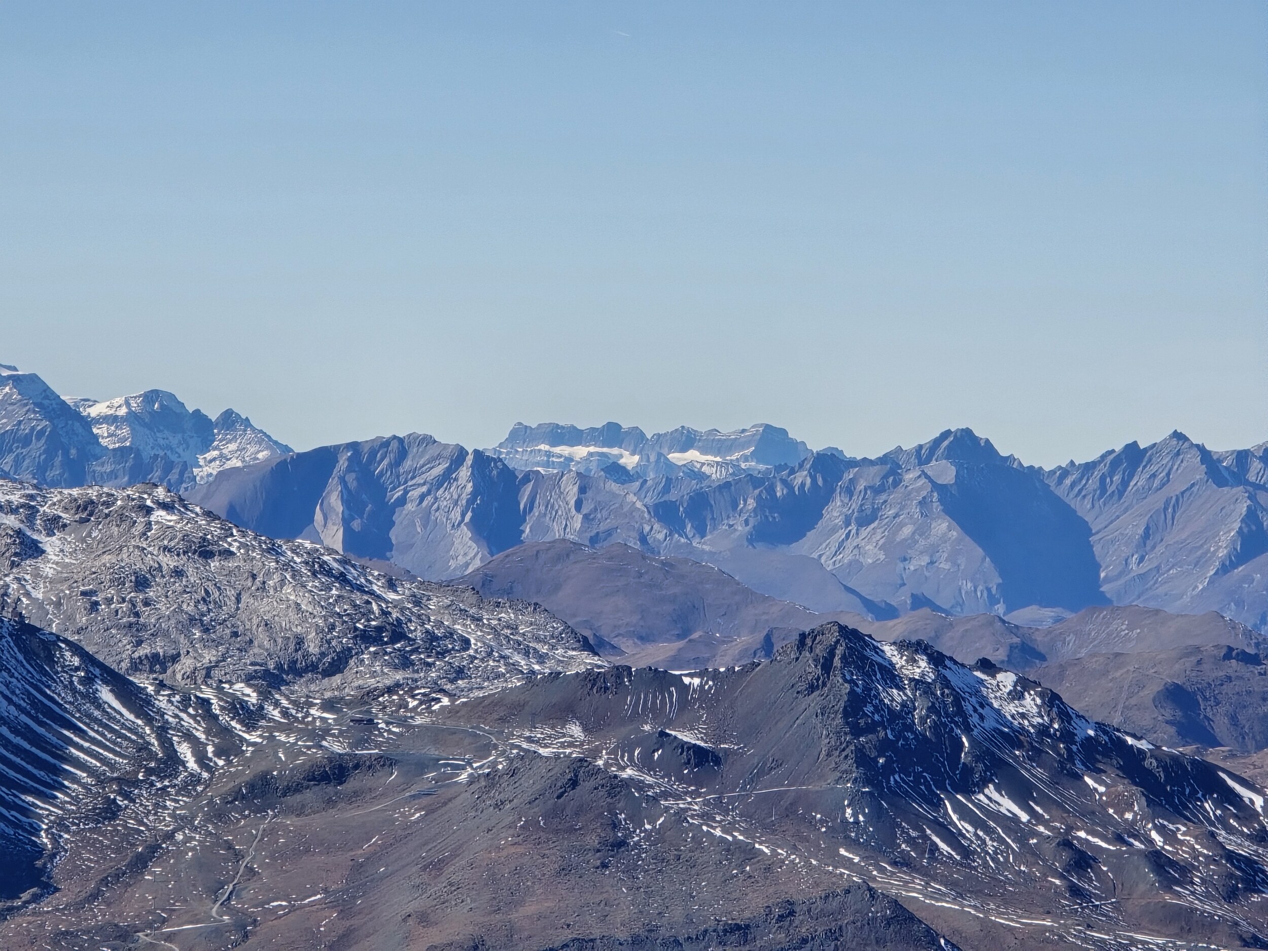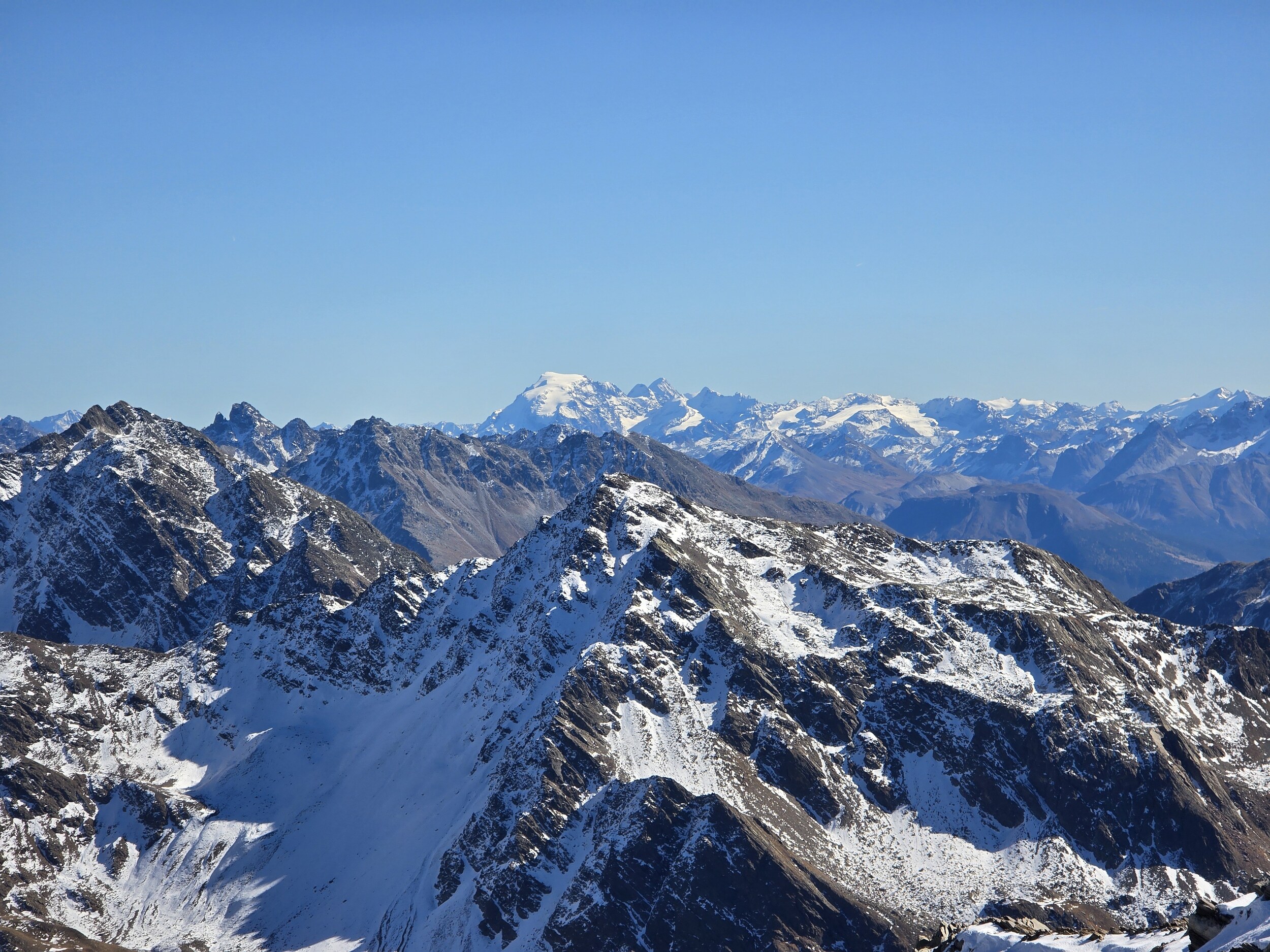 Nach einer ausgiebigen Mittagspause nehme ich den Aufstieg in Richtung Pischahorn in Angriff. Noch weiss ich nicht, ob ich es bis oben schaffen werde. Von unten sieht man, dass teilweise etwas Schnee auf dem Weg liegt. Ab dem 2740 m hohen Vorgipfel ändert die Hangausrichtung von West nach Südost, sodass hier deutlich weniger Schnee liegt. Einzig auf der Überquerung des Grates direkt nach dem Vorgipfel liegt noch ordentlich Schnee, das Gelände ist hier aber relativ flach und nicht ausgesetzt, weshalb das absolut unkritisch ist. Der weitere Weg ist dann grösstenteils schneefrei, für ein angegebenes T3 aber doch eher auf der anspruchsvollen bzw. ausgesetzten Seite, insbesondere da es gar keine Sicherungen gibt. Dennoch komme ich problemlos hoch. Oben angekommen erwartet mich ein gewaltiges Panorama. Das Pischahorn gehört wohl zu den besten Aussichtsbergen hier in Davos. Nur vom Flüela Schwarzhorn ist das Panorama noch besser, aufgrund des vielen Schnees ist dort aber ein Aufstieg aktuell wohl kaum sinnvoll möglich. Es ist heute aber auch ein absoluter Traumtag mit wolkenfreiem Himmel und bester Weitsicht. Die verschneiten Bergspitzen machen das Panorama nochmals schöner. Insbesondere an den nordseitigen Hängen in Richtung Flüela Weisshorn sieht es teilweise schon richtiggehend winterlich aus.