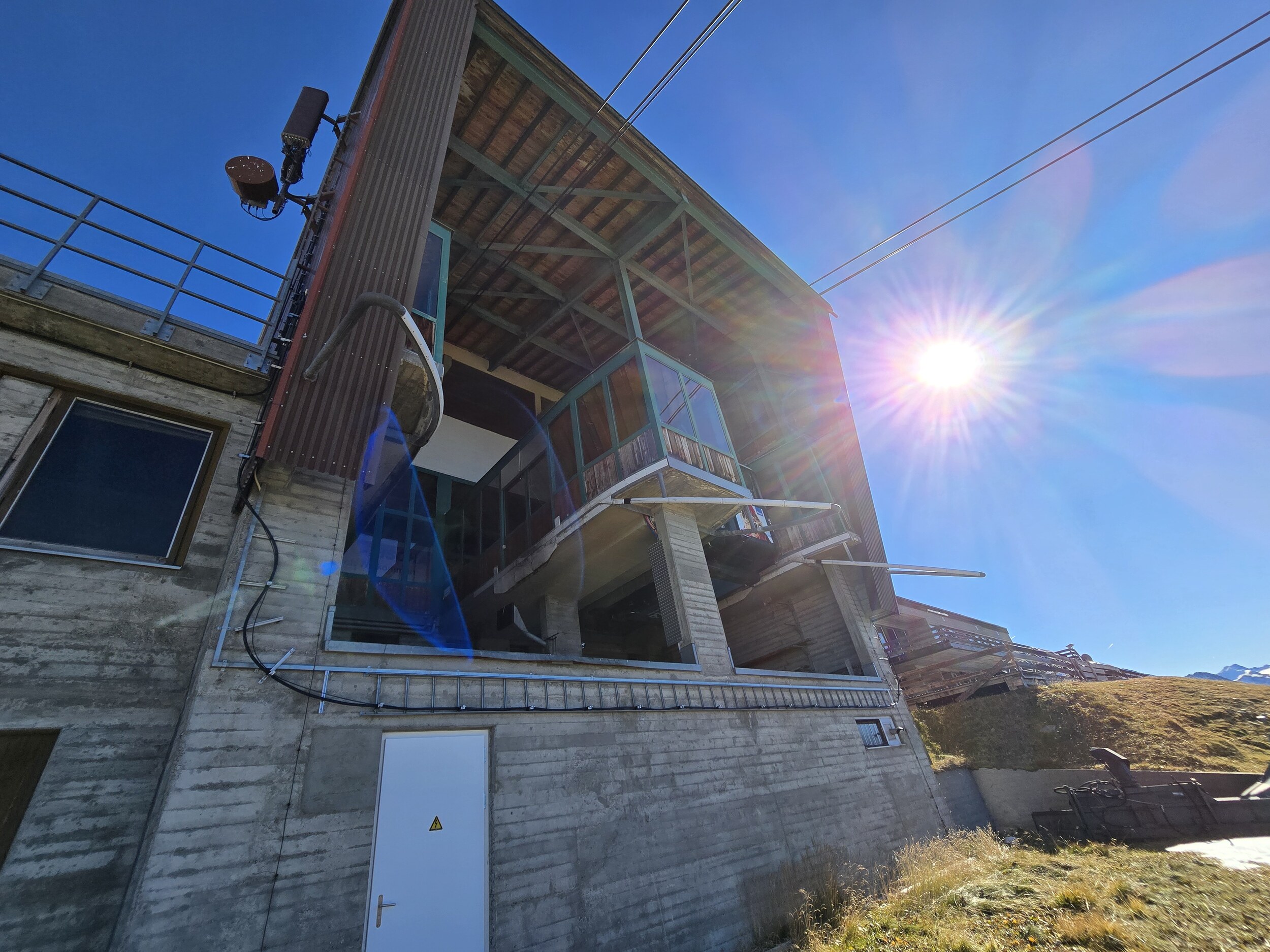 Auch hier lege ich eine kurze Pause ein, danach geht es weiter über den Grat zur Pischa-Bergstation. Der Grat ist durchaus hübsch mit schönen Ausblicken in die verschneiten Berge rund um den Flüelapass. Die Strecke zieht sich dann aber doch etwas in die Länge. Angekommen bei der Bergstation der Pischabahn erkunde ich etwas die Gegend. Die Schlepplifte sind mittlerweile allesamt abgebaut und es stehen nur noch die Stationen und Fundamente. Bei der Bergstation der Mitteltälli-Schlepplifte lege ich eine Mittagspause ein. Das Betonfundament der ehemaligen letzten Stütze dient als idealer Windschutz, sodass ich es locker im T-Shirt aushalte und dabei angelehnt ans Fundament die Bergwelt rund um den Flüelapass geniessen kann. Ich bin dann doch ziemlich erstaunt, wie viele Leute hier unterwegs sind, obwohl die Bahn schon seit langer Zeit keinen Sommerbetrieb mehr anbietet. Insbesondere bei Bikern scheint die Pischa beliebt zu sein. Während ich hier oben bin, kommen mindestens 20 Biker vorbei, welche alle von der Talstation hochtreten mussten. Auch Wanderer hat es erstaunlich viele, sowohl hier als auch rund um das Hüreli und Seehorn. Ich kann mir so kaum vorstellen, dass es nicht möglich wäre hier zumindest am Wochenende einen rentablen Sommerbetrieb der Bahn anzubieten und so den Cashflow etwas zu erhöhen. Es scheint hier ja aber leider weniger an den Möglichkeiten, sondern viel mehr am mangelnden Wille der DKM zu scheitern.