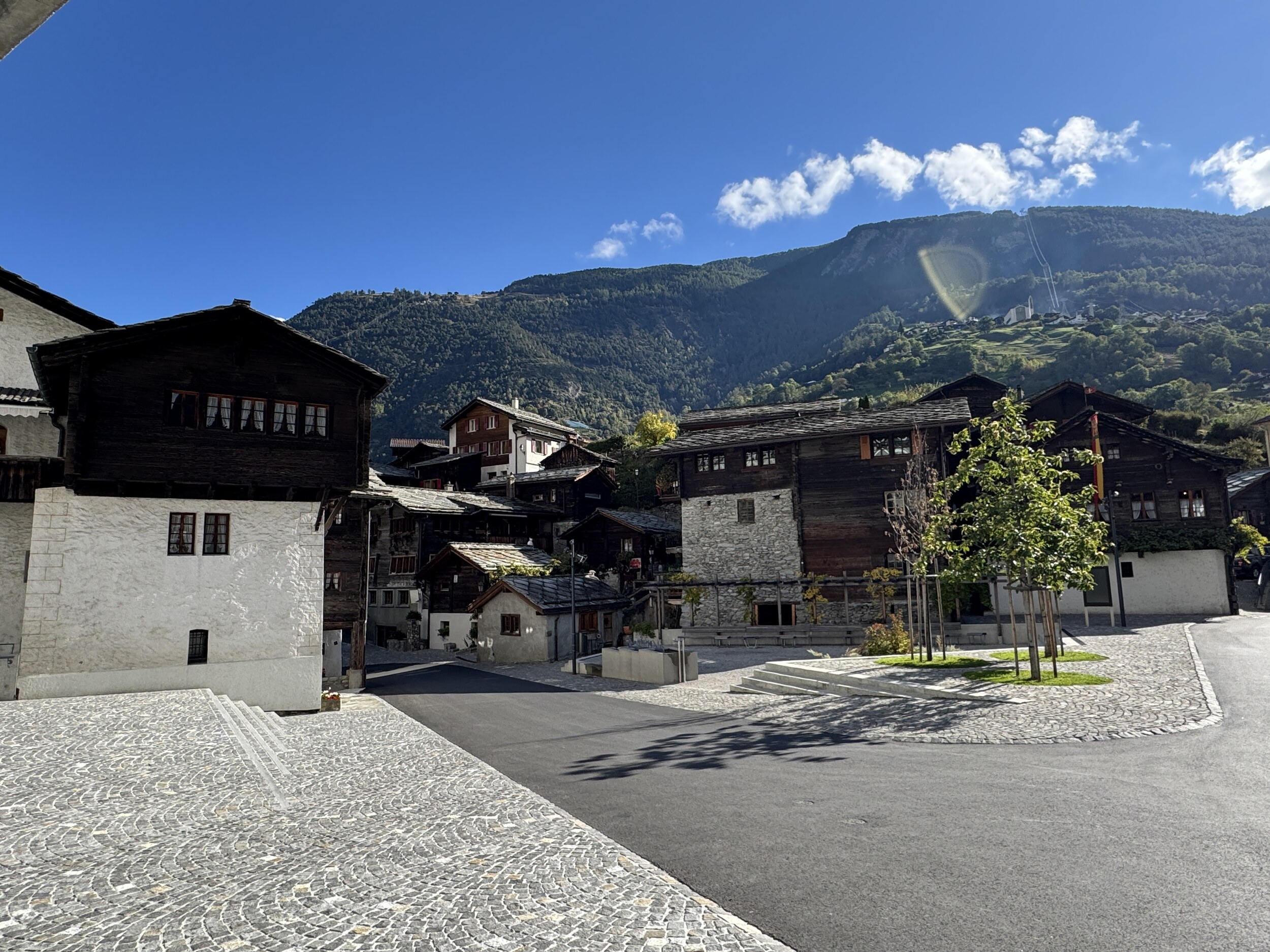 Der kürzlich neu gestaltete Dorfplatz von Stalden
