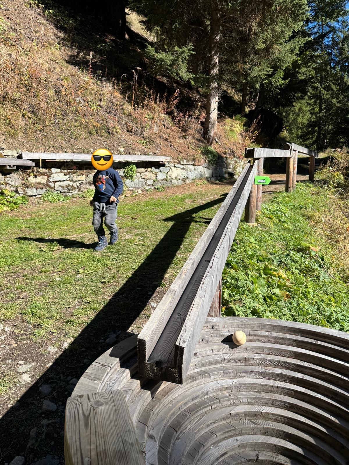 Geräusch Junior an einer der vielen Kugelbahnen auf dem Loichi Kugelweg Lauchernalp-Wiler