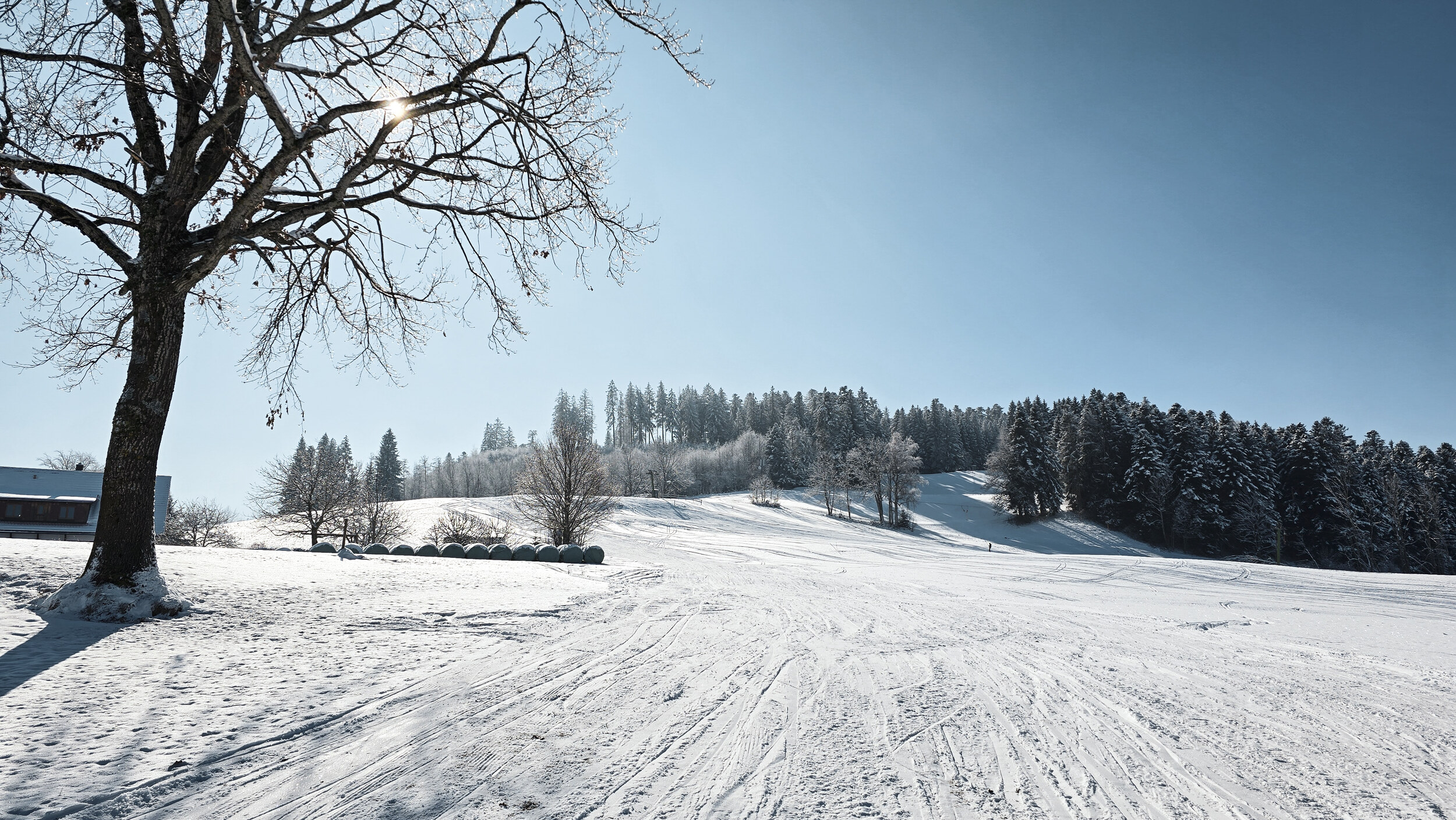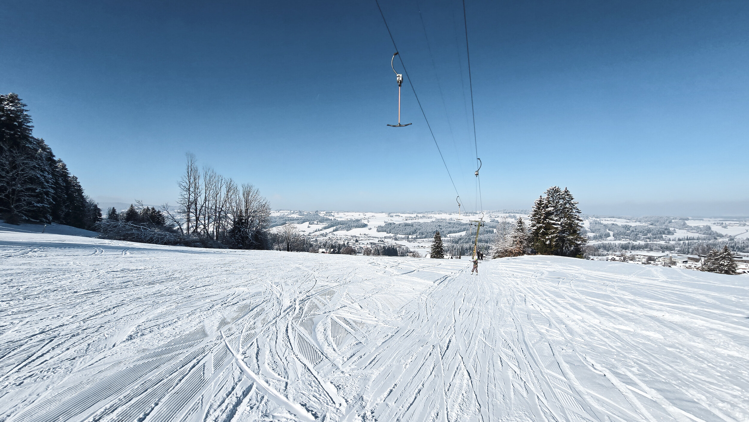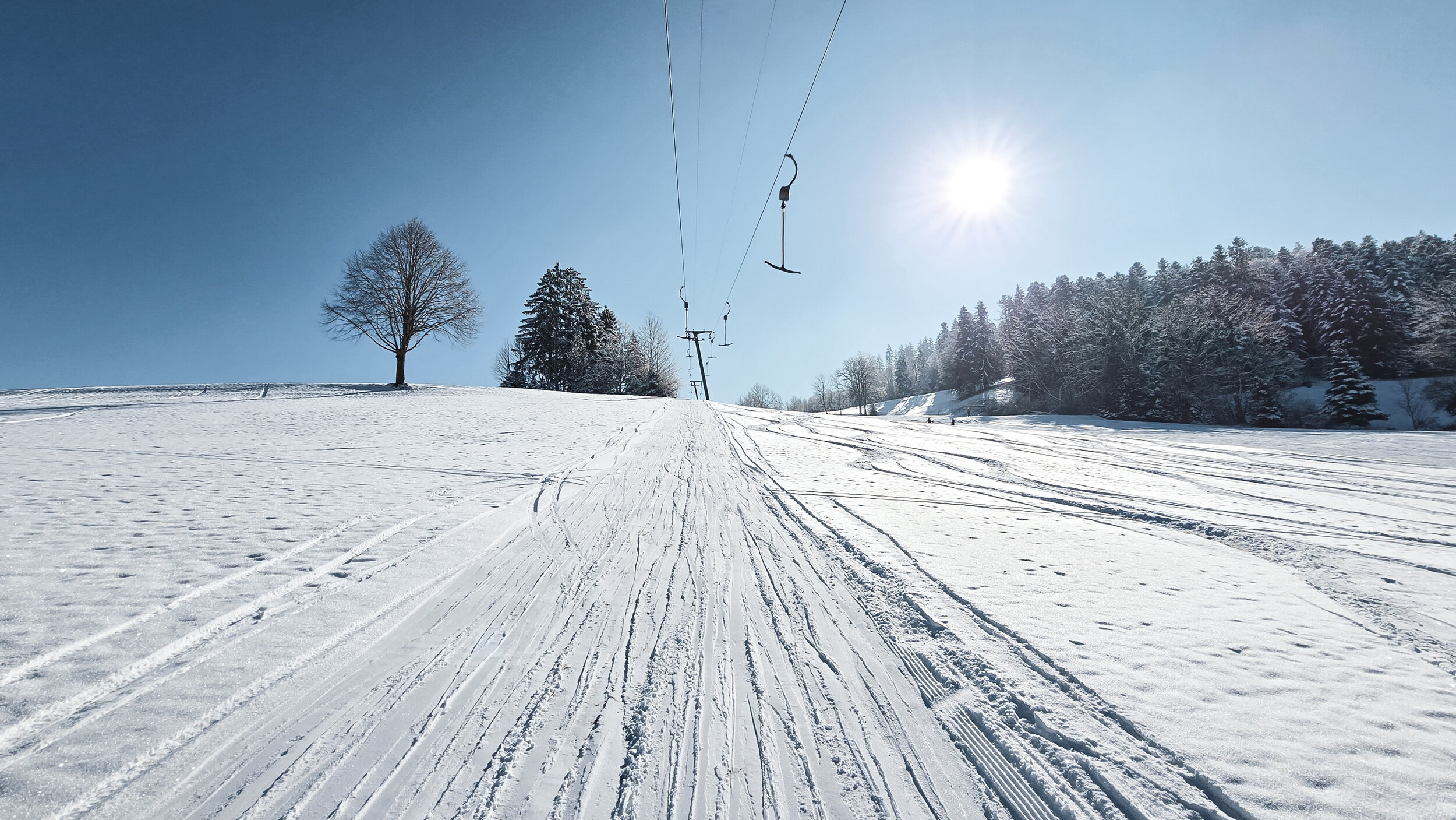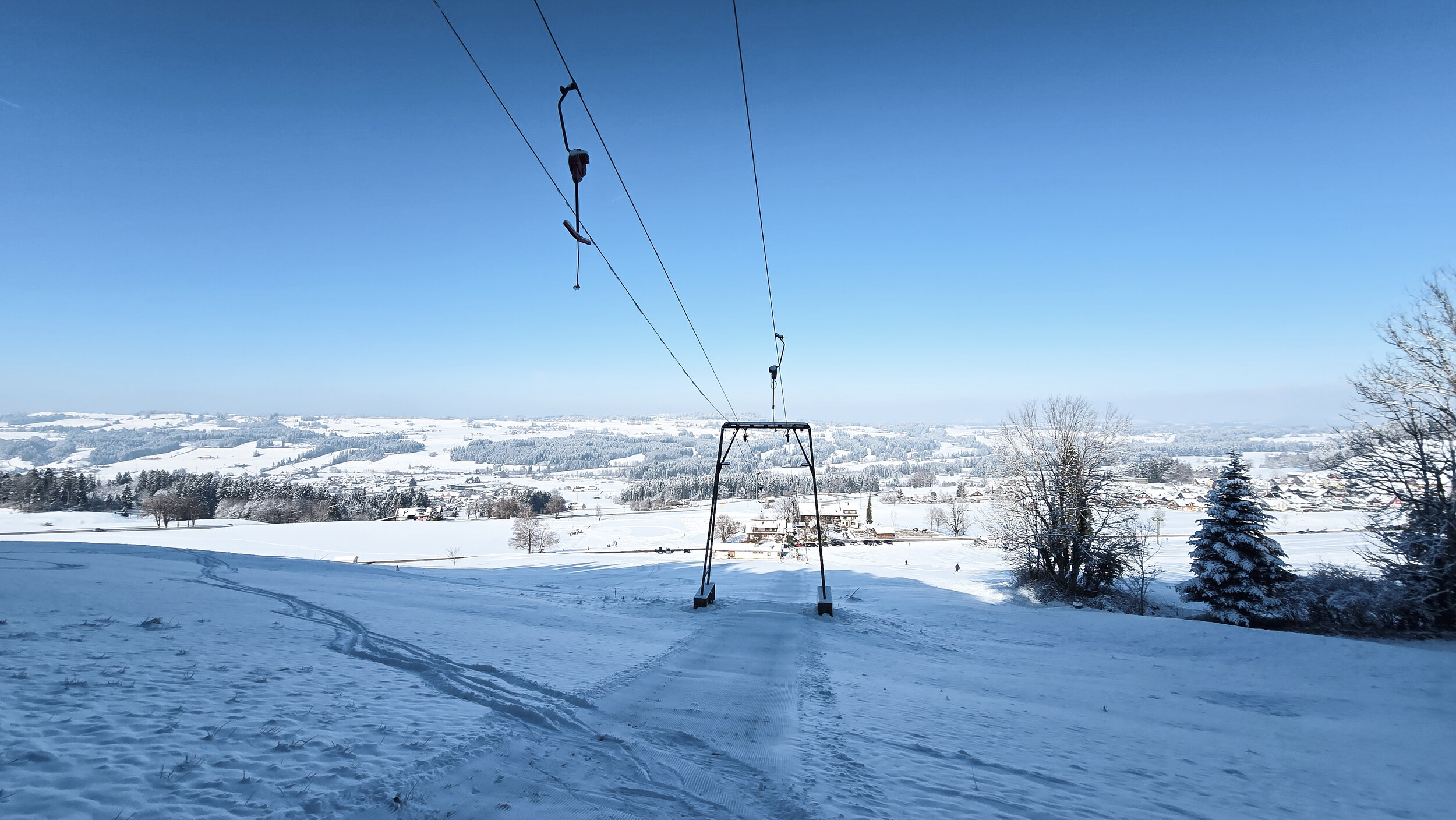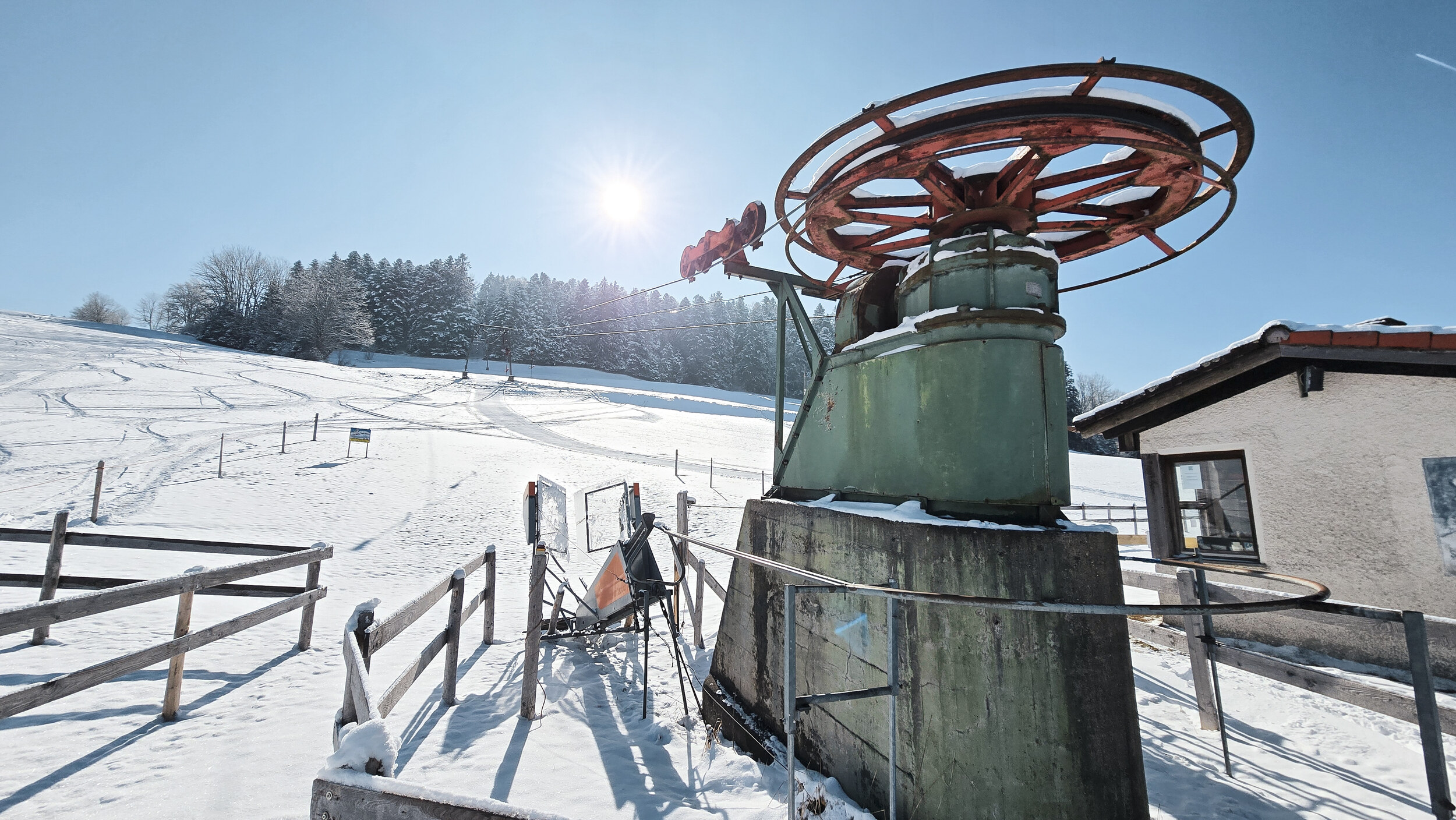Daneben steht ein etwas kürzerer Schlepplift von Doppelmayr, der eine etwas kleinere offene Anhöhe bedient. Er misst etwa 390 Meter und überwindet dabei 80 Höhenmeter. Eine mittlerweile auf Langbügel umgerüstete Redundanz zum längeren Skilift daneben. An jenem Februarwochenende war ausschliesslich der kürzere der beiden Lifte in Betrieb. Verständlich, denn in das Waldstück der längeren Trasse war der Schnee erst gar nicht gefallen. So blieb der kultige Lift mit dem Liftomat an diesem Tag leider still. Schade, denn gerade diese Anlage ist nicht nur wegen ihrer spannenderen Trasse, sondern auch aus technikhistorischer Sicht eigentlich das Highlight des kleinen Gebiets. Aber man will ja nicht klagen, schliesslich ist es bemerkenswert genug, dass hier überhaupt Skibetrieb angeboten wurde. Wer bei so dünner Schneelage eine fahrbare Piste hinzaubert, verdient ausschliesslich Dank und Respekt.