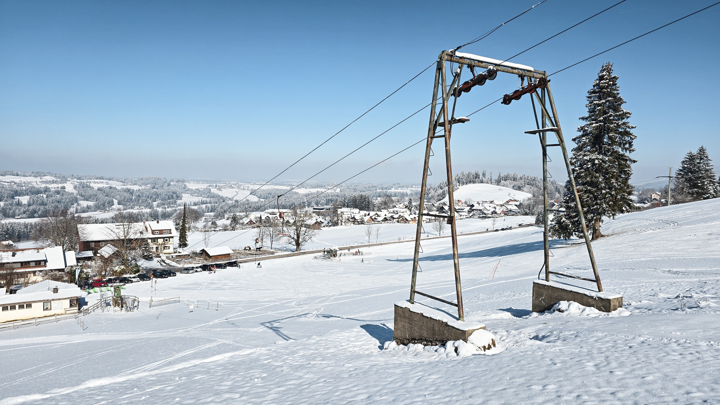 Das kleine Skigebiet am Ortsrand von Simmerberg besteht aus zwei Schleppliften, die an einem überschaubaren Nordhang mehrere Abfahrten erschliessen. Der längere der beiden Lifte stammt aus dem Hause Leitner und bringt es auf rund 420 Meter Länge bei 115 Höhenmetern. Seine Trasse führt im oberen Teil durch ein kleines Waldstück, was dem Lift einen eigenen Charakter verleiht. Doch weit interessanter ist die Tatsache, dass die Anlage mit einem Liftomat ausgestattet ist – einem mittlerweile raren Helferlein, das beim Anbügeln mechanisch unterstützt. Ein seltenes Überbleibsel aus einer Ära, in der selbst die Technik noch Charme hatte.