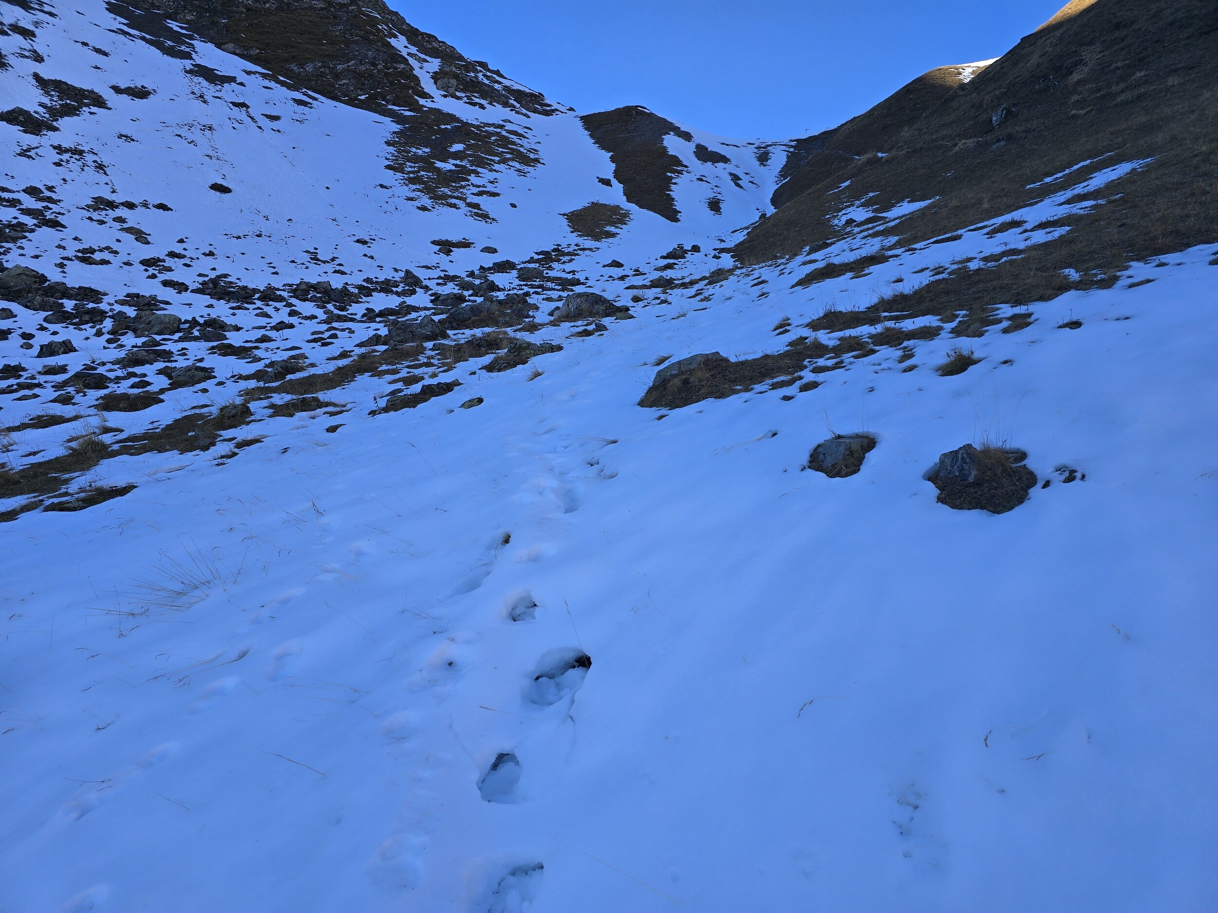 Durch den Schnee haben wir bis hier hin doch relativ viel Zeit benötigt. Es ist bereits 15:30 und eigentlich wollen wir die Bahn um 17:30 ab Mettmen erwischen. Die Wanderzeit bis dahin ist mit 1h 40 min angegeben, sodass wir nicht mehr gross Zeit verlieren sollten. Wir kommen dann aber doch ganz gut voran. Deshalb entscheiden wir uns den minimal längeren Weg via Kärpfstaffel zu nehmen. Dieser ist zwar rund 10 Minuten länger, jedoch landschaftlich deutlich ansprechender als der direkte Weg.