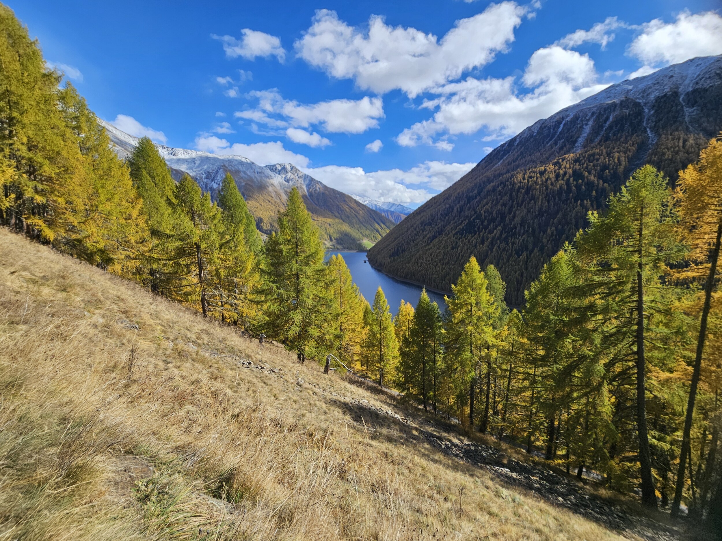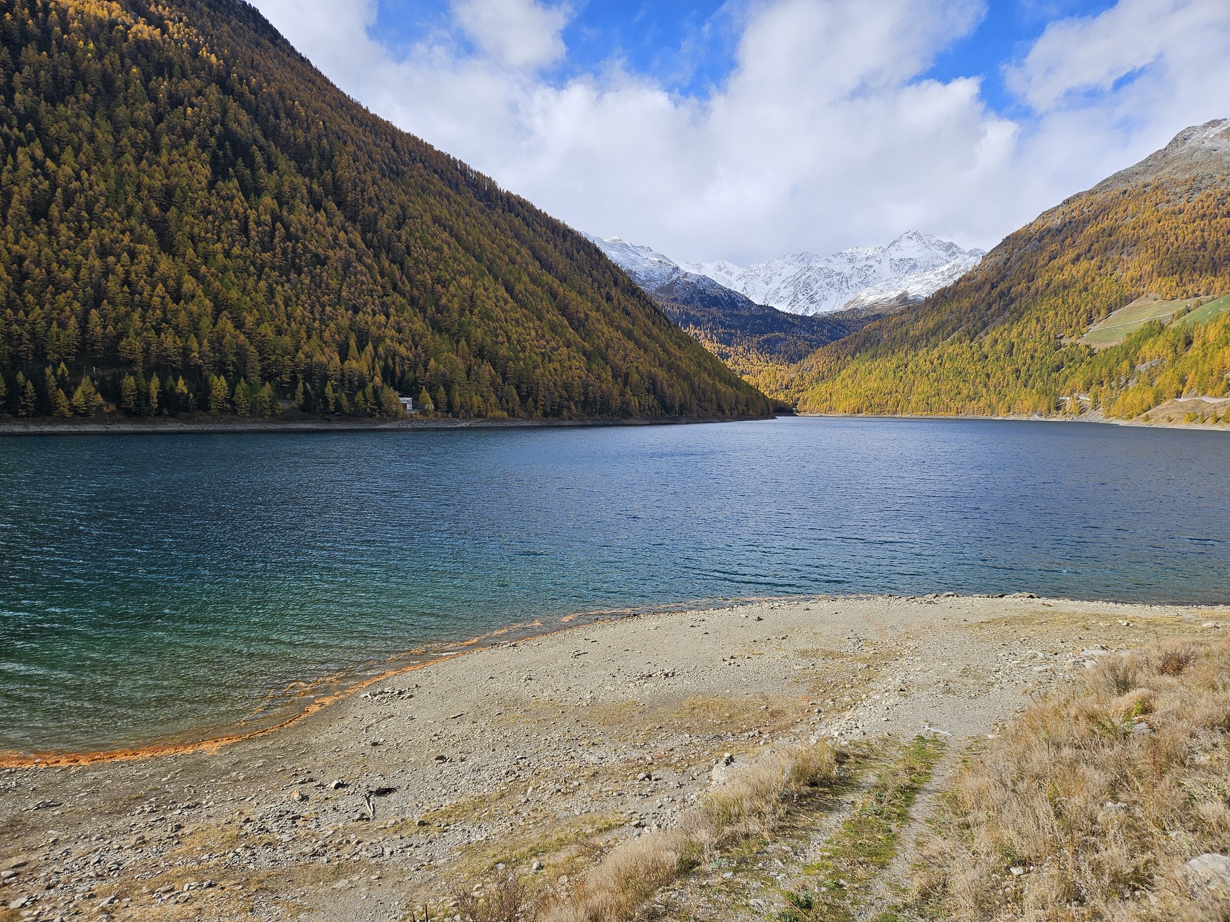 Zunächst zum Damm hoch; immer wieder faszinierend die Bergschafe im Schnalstal, aber besonders die Dammschafe. Kühl aber sonnig gingen wir am Nordufer am See entlang bis zum Ötzi-Rope-Parc, bei dem wir eine erste Pause machten. Der Blick auf die sich rötenden Lärchenwälder ist auch immer wieder erfreulich.