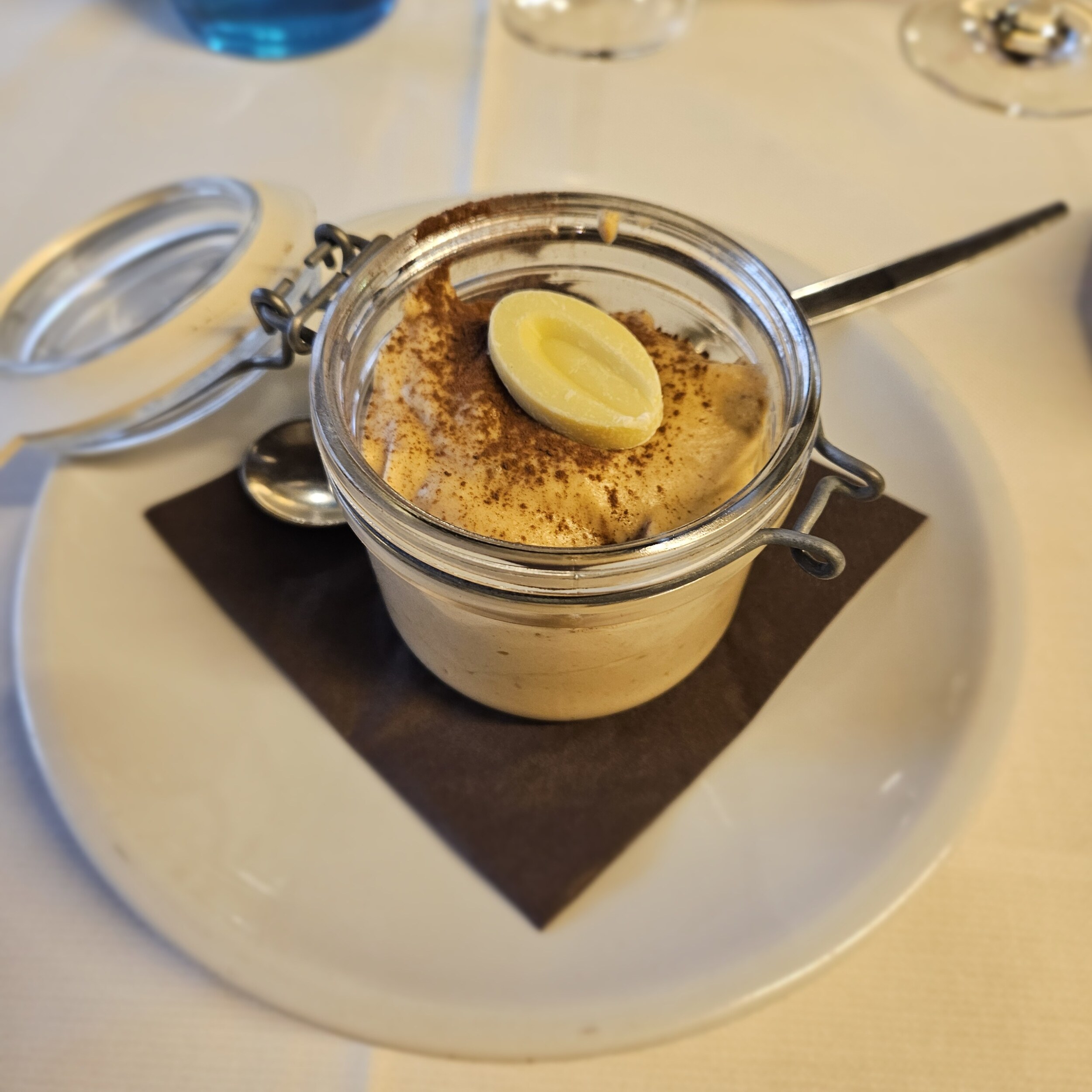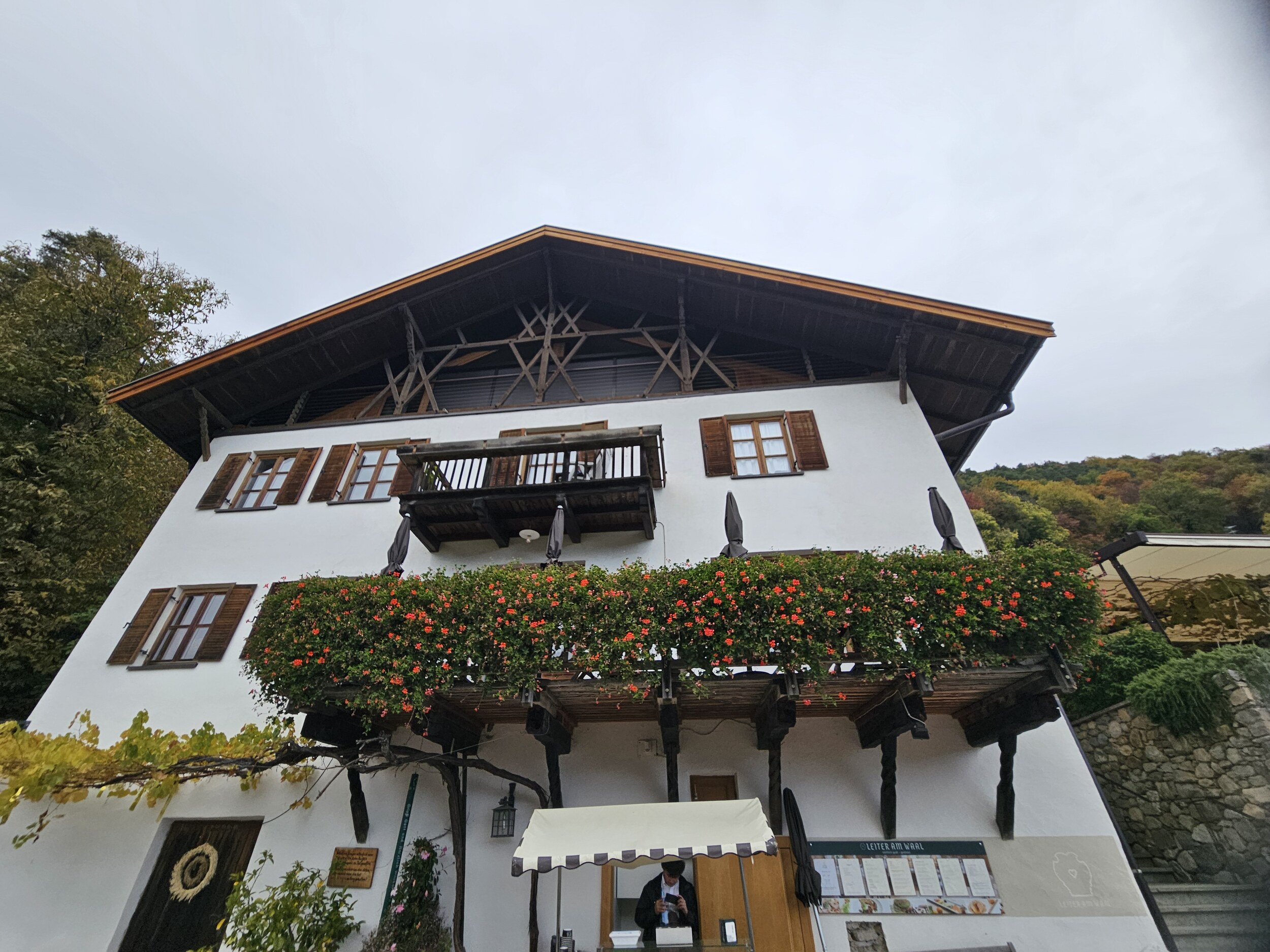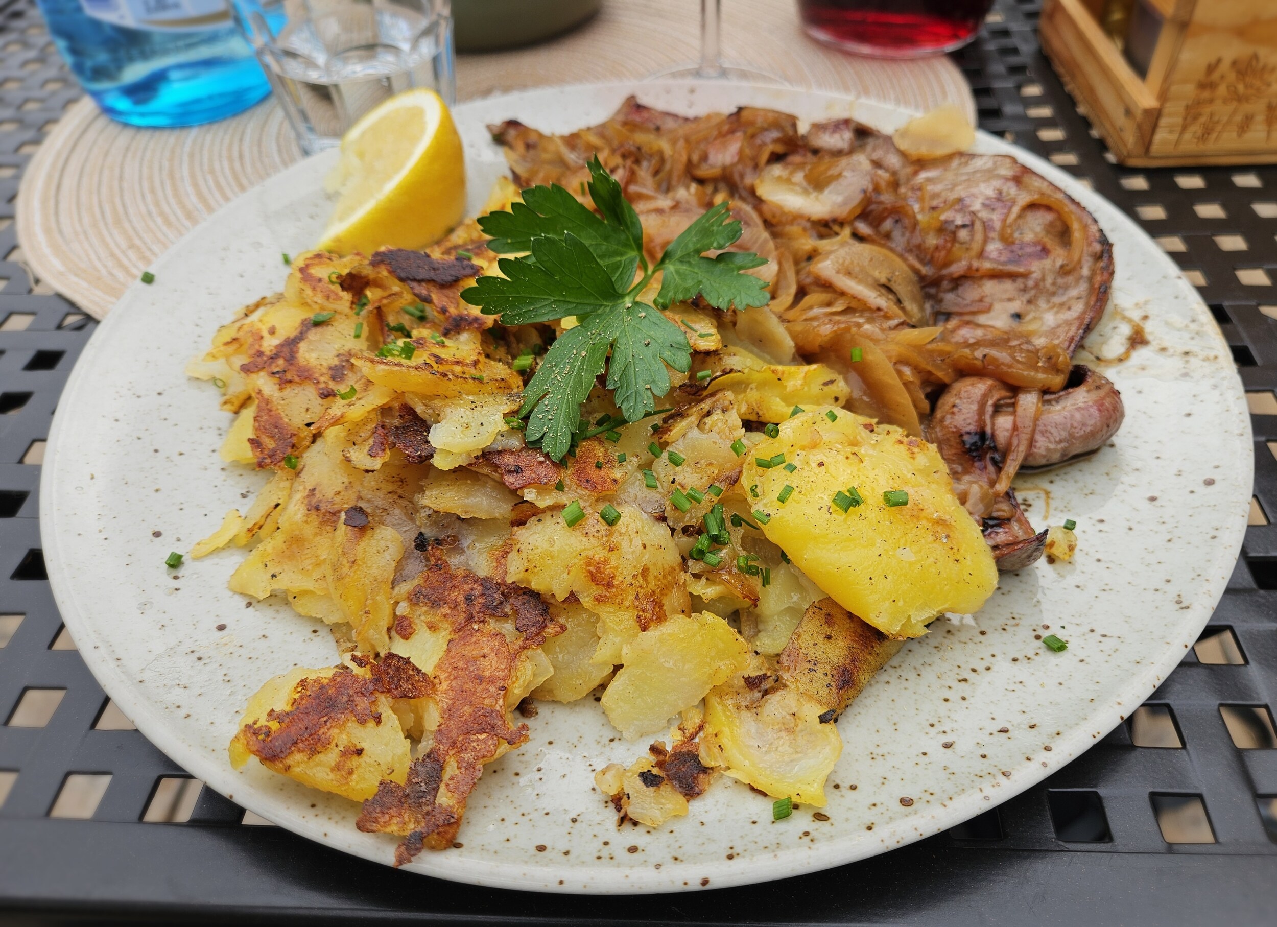 Jetzt hatten wir Eiswein und das gerade kommende Essen musste uns aufwärmen. Zwar wussten wir, dass es wieder aufhellen sollte, aber dennoch litt der Genuss ein wenig unter den Umständen. Denn geschmacklich waren wir beide zufrieden 👍.