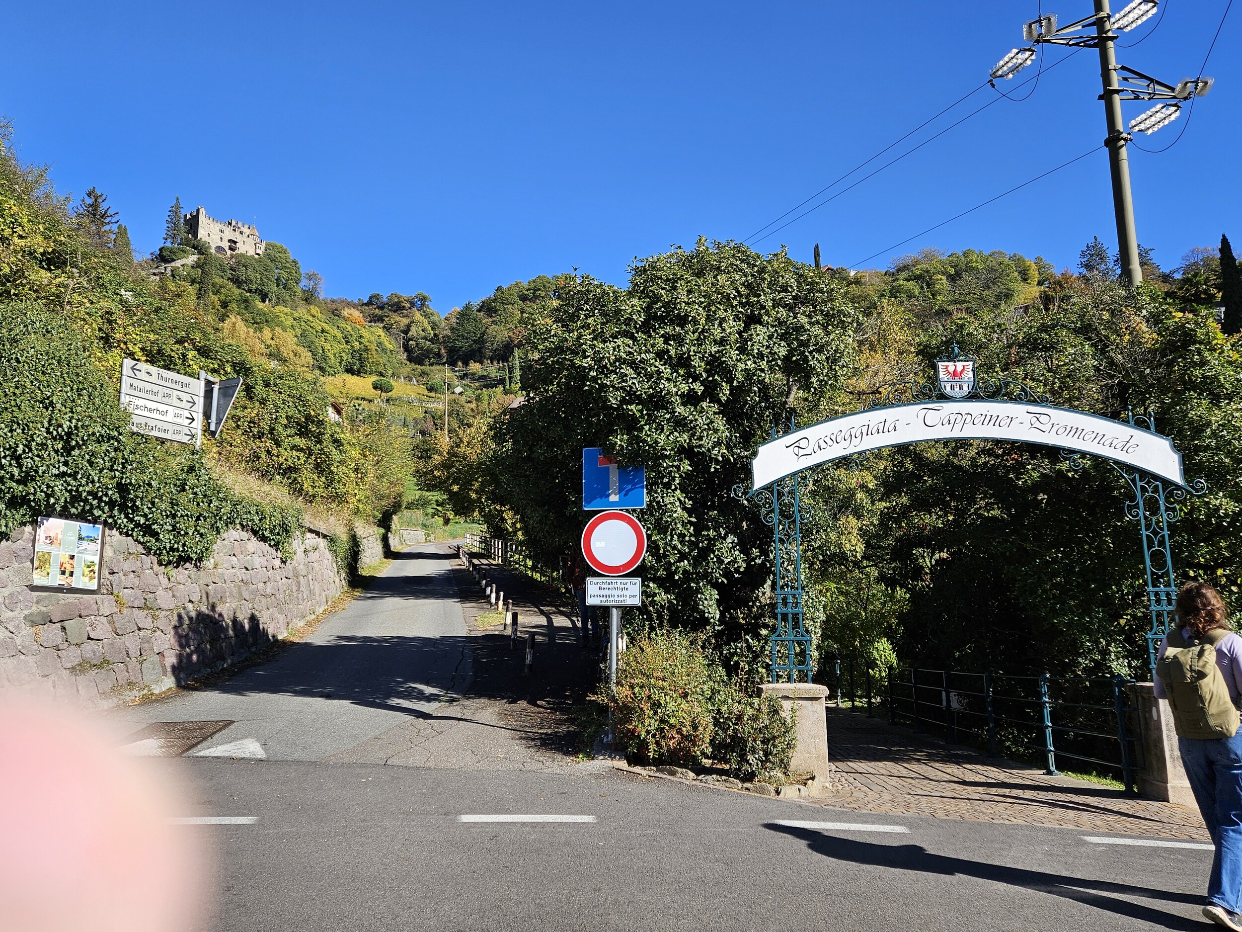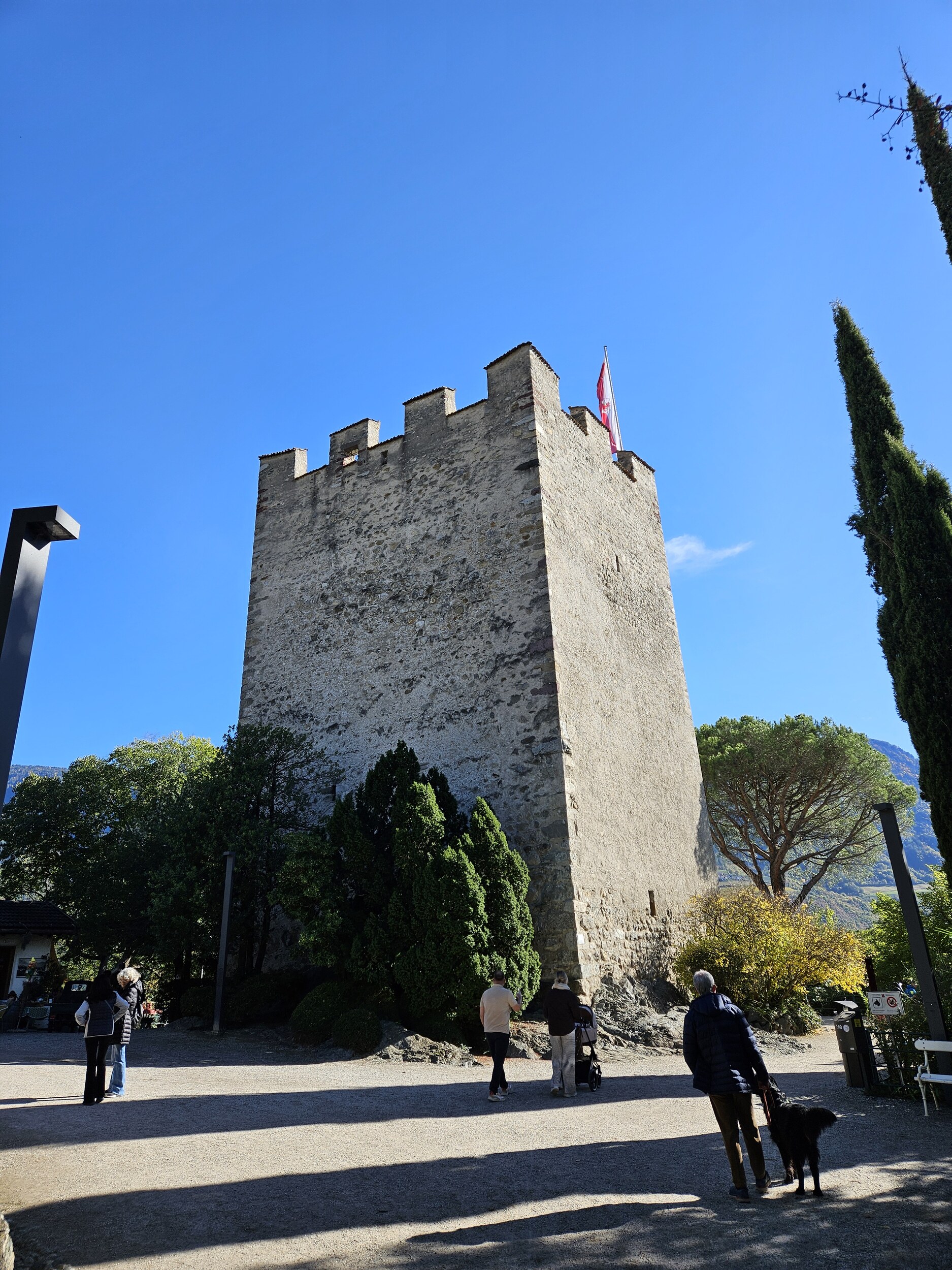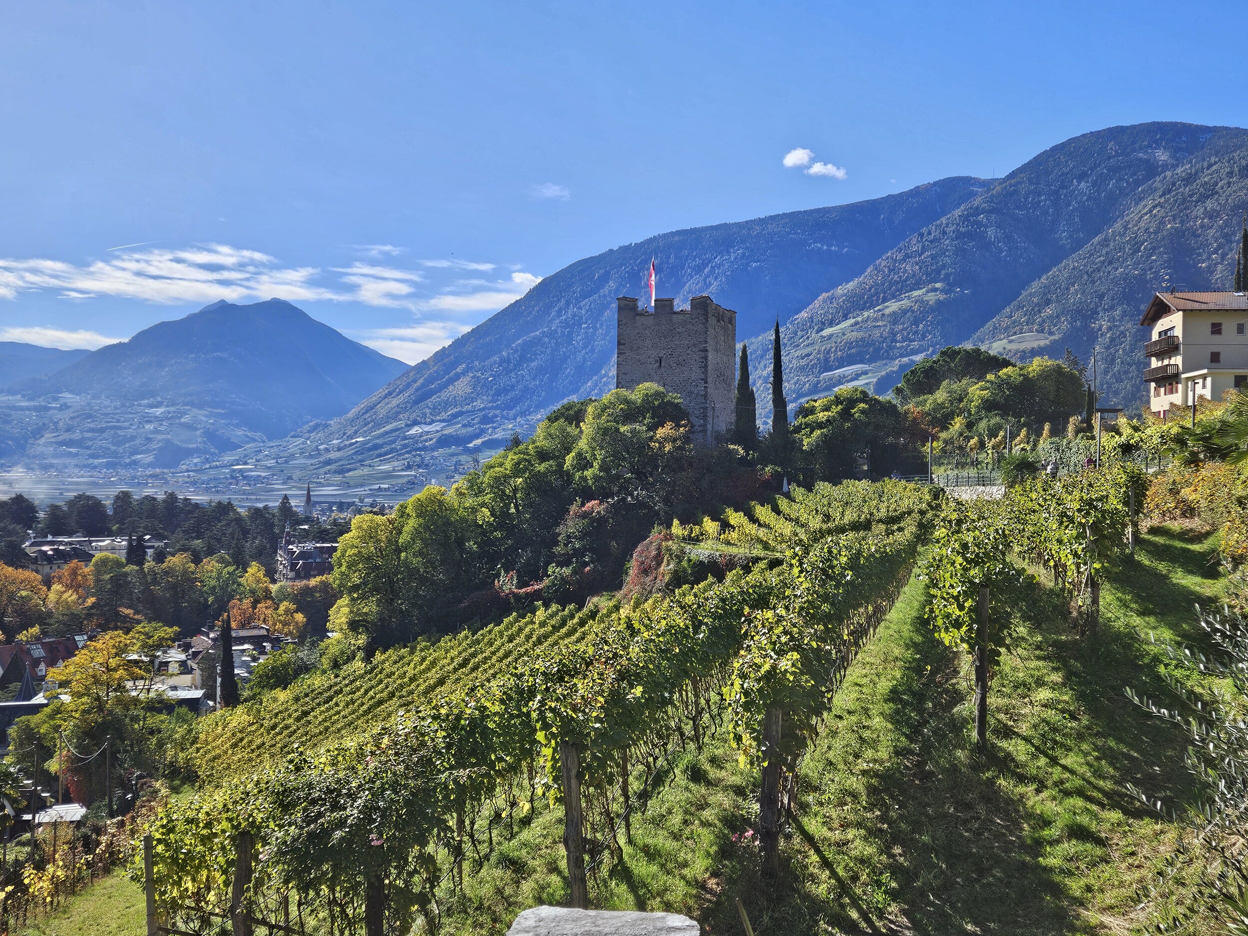 Mit dem Bus auf die Töll und dann in rund 2h bis zum Pulverturm in Meran; dort Essen in den Lauben und mit dem Bus ab Rennweg nach Plaus in den Pool. Um 5 wartet schon wieder Weinverkostung 🍷