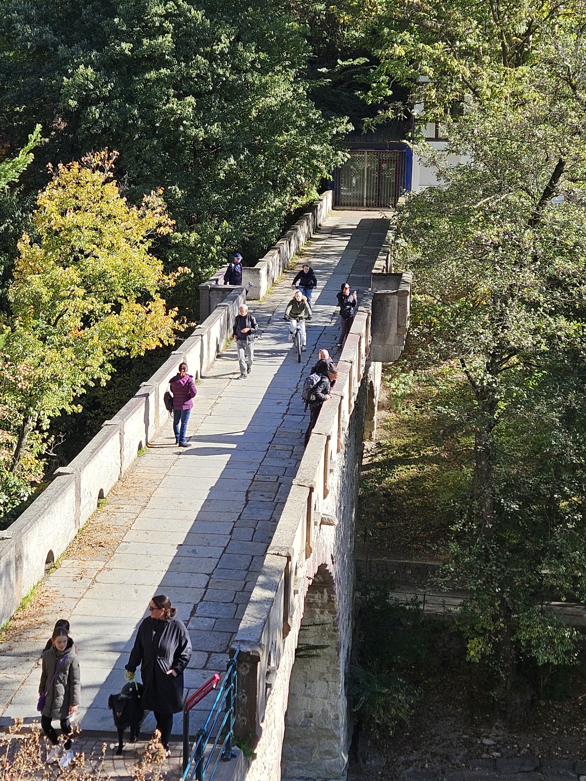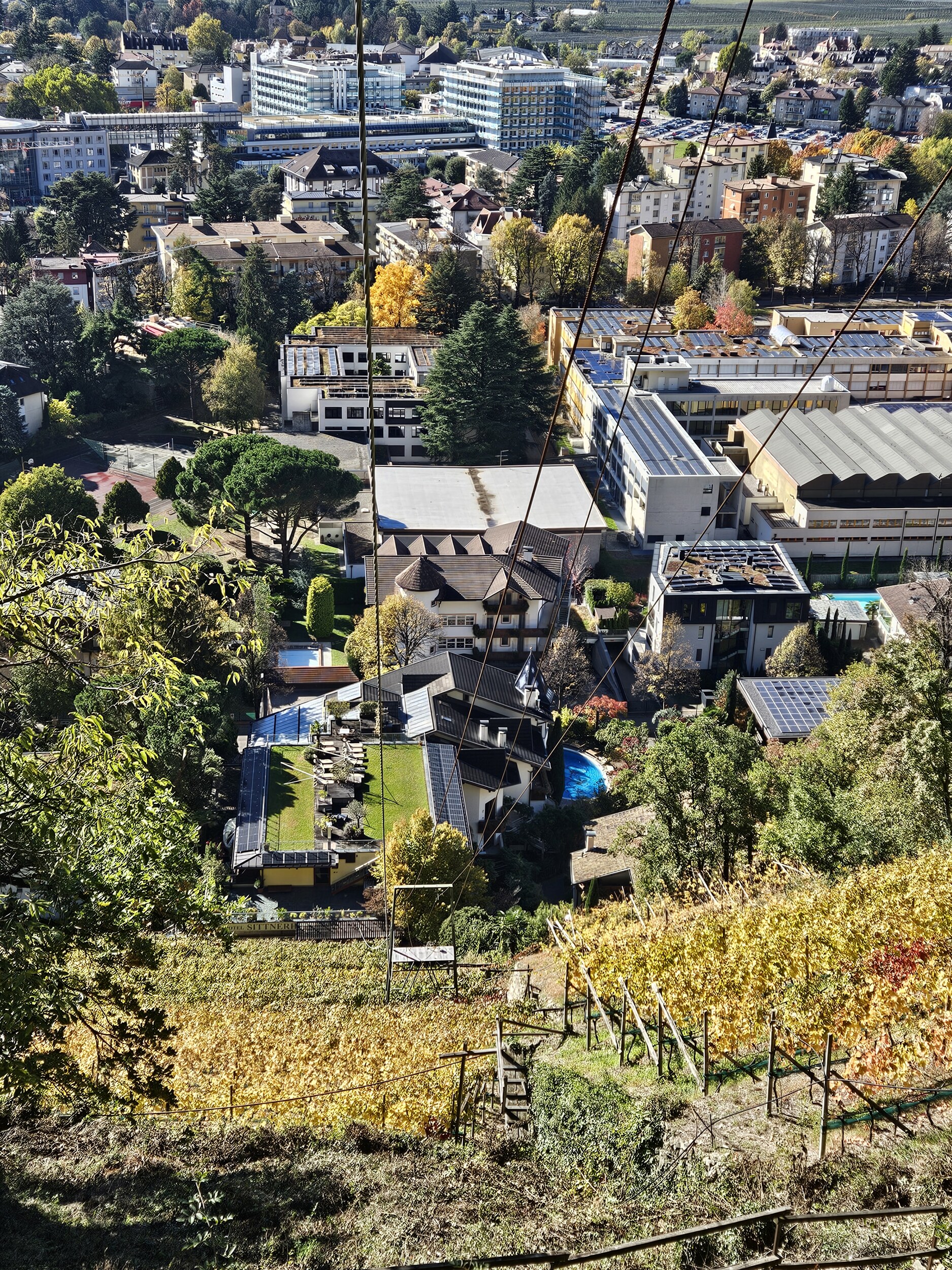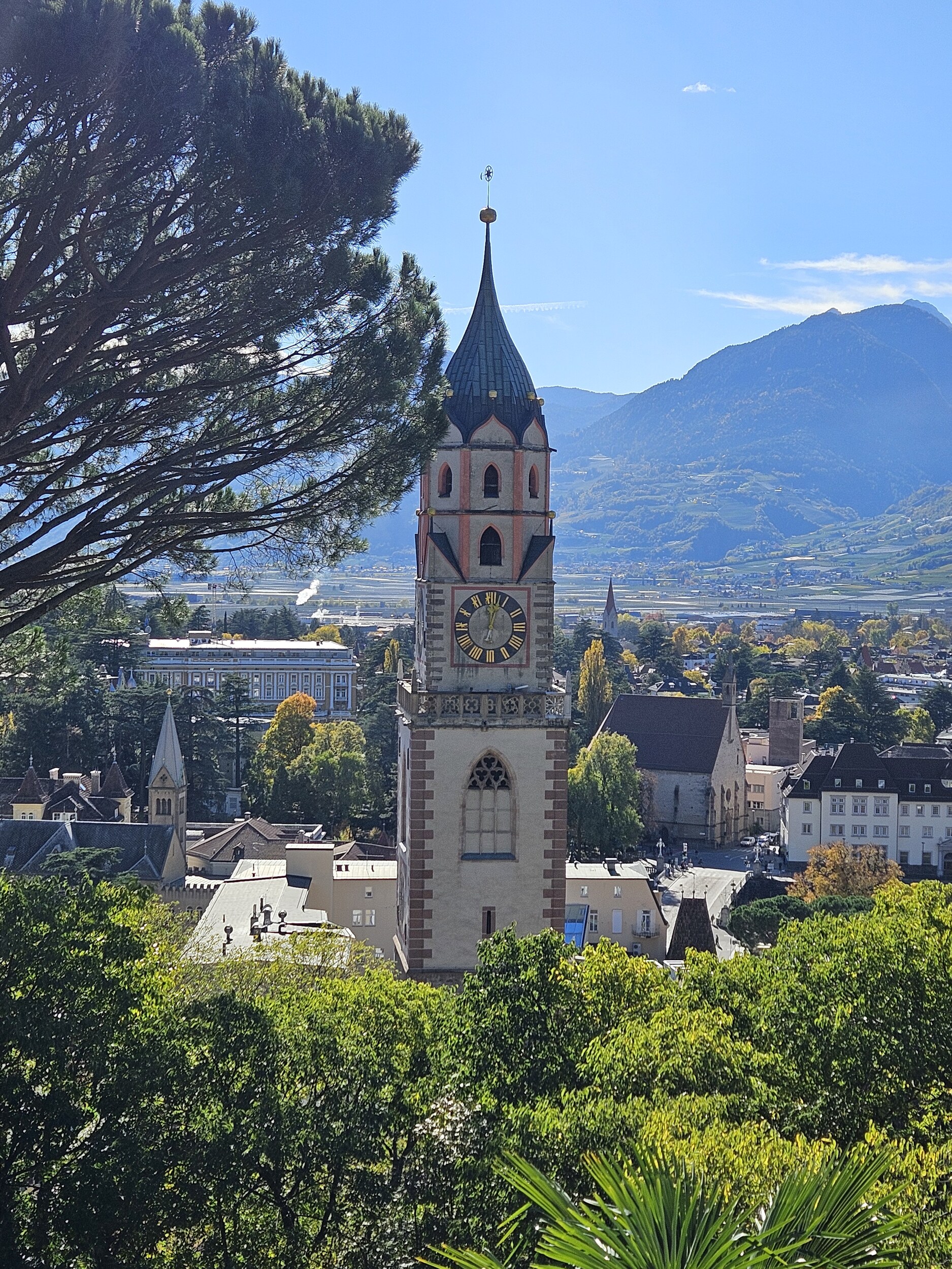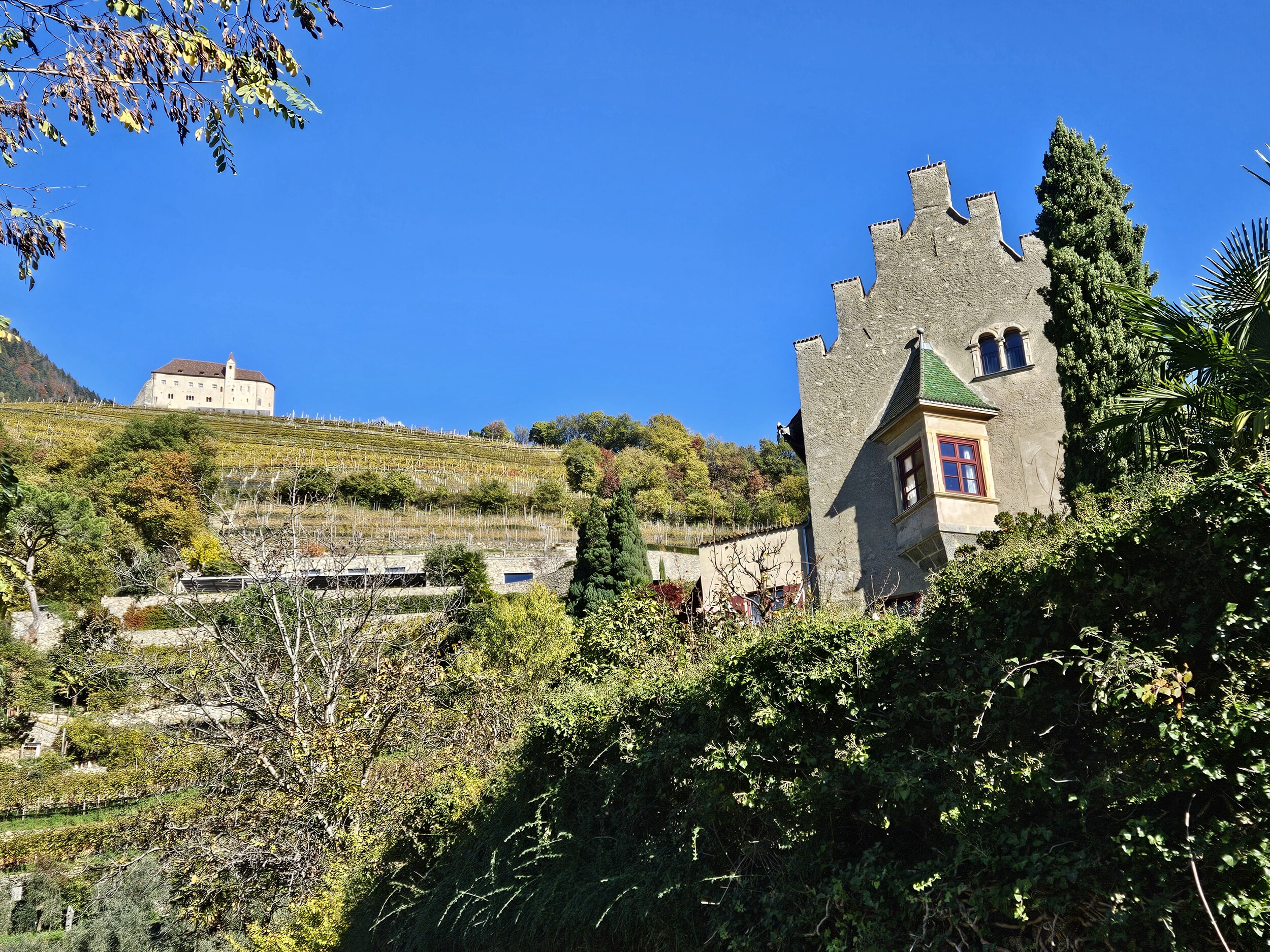 Mit dem Bus auf die Töll und dann in rund 2h bis zum Pulverturm in Meran; dort Essen in den Lauben und mit dem Bus ab Rennweg nach Plaus in den Pool. Um 5 wartet schon wieder Weinverkostung 🍷