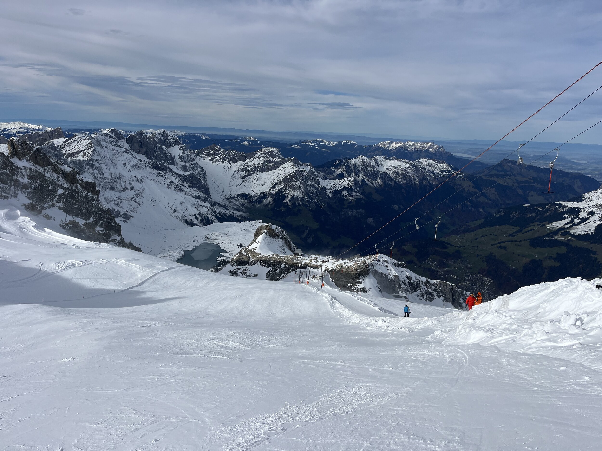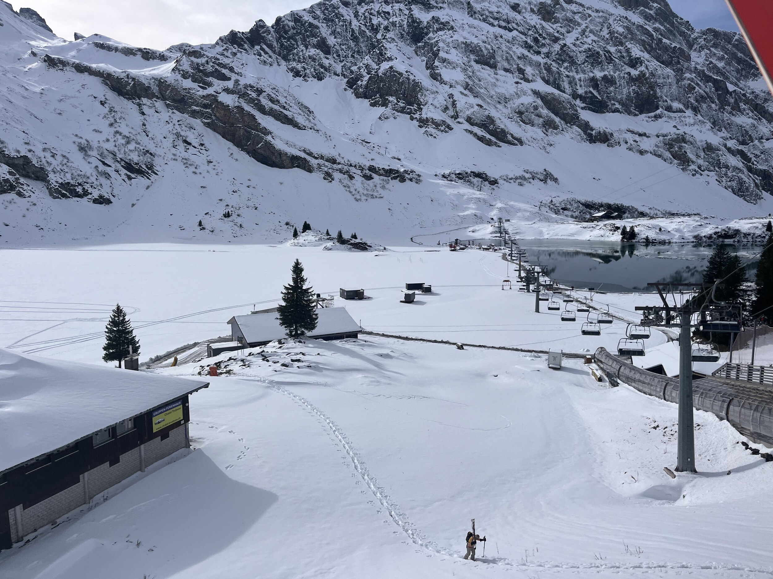 Ich bin mit den Lifts runter nach Trübsee. Ich habe sogar eine Gruppe gesehen, die die Rotegg runtergefahren ist. Ich glaube, dass bis Trübsee runter ohne abzuschnallen leider nicht mehr möglich ist - bis der nächste Ladung, die schon morgen kommt.