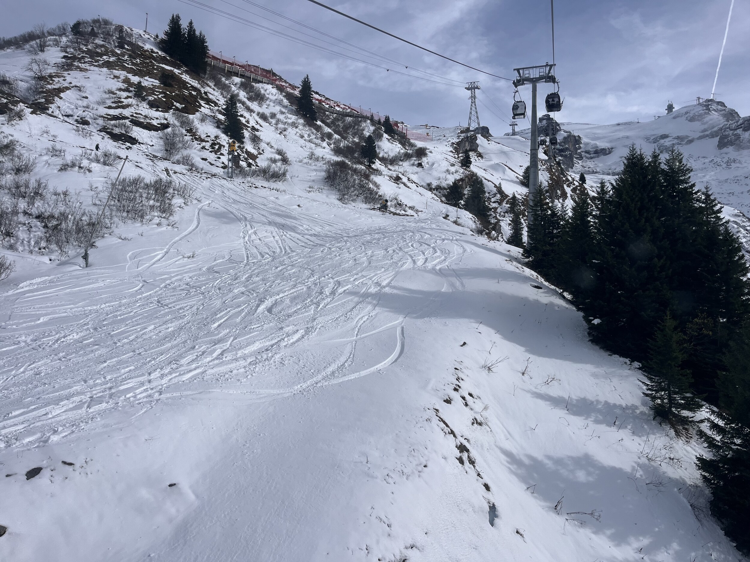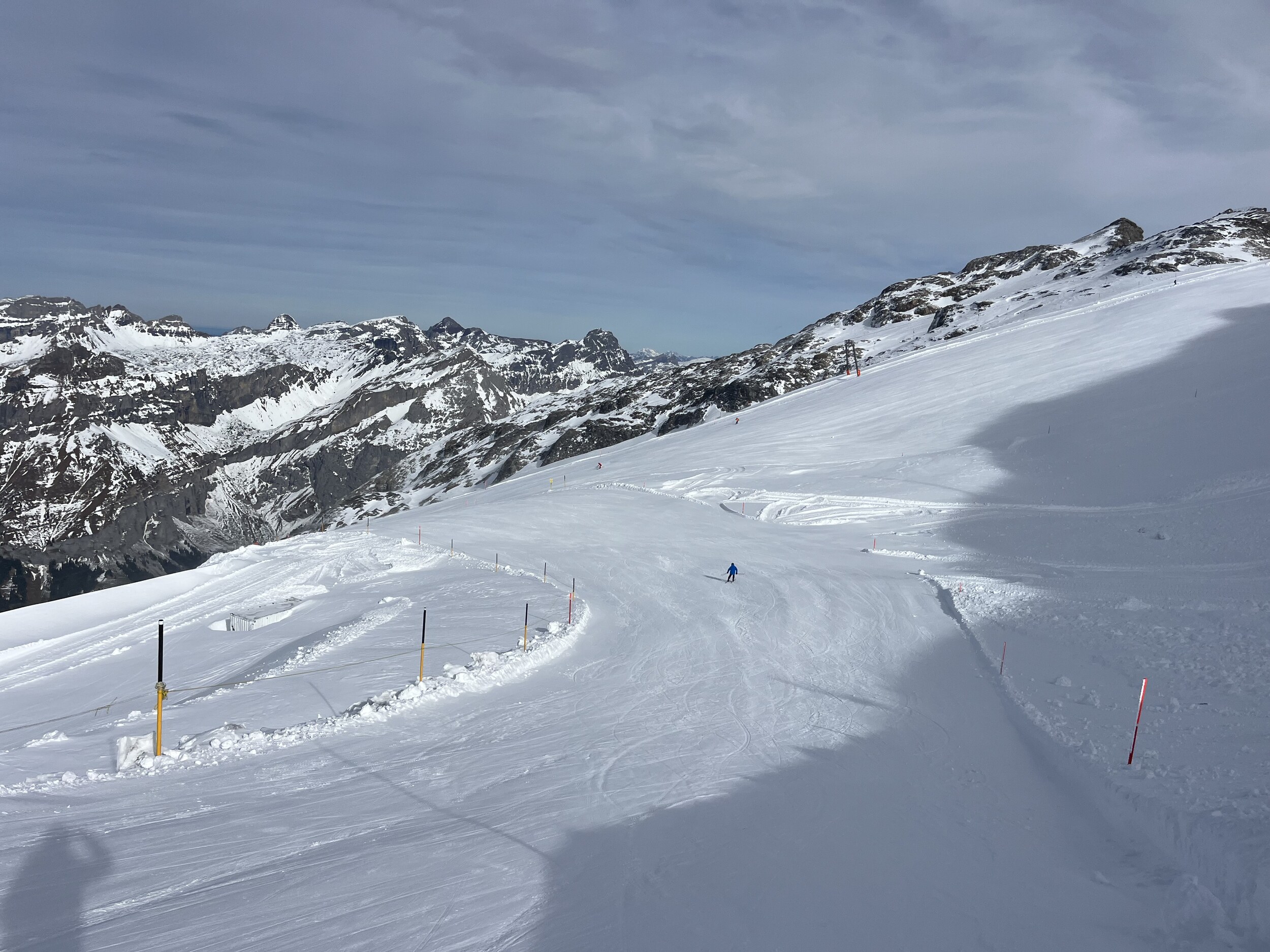 Zwischen zwei Terminen hatte ich heute ein paar Stunden Zeit für etwas Skifahren auf dem Titlis. Ob eine Abfahrt Stand-Trübsee möglich ist? Es hat einige Spuren.