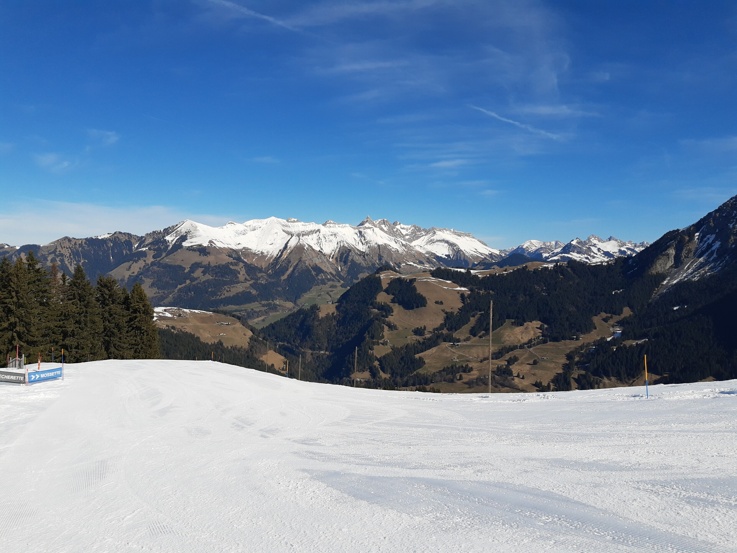 Sehr gute Bedingungen in Les Mosses, alle Anlagen geöffnet (außer Parchets 2, das außerhalb des Wochenendes geschlossen ist, da es die gleichen Pisten wie Parchets 1 bedient.). Die überwiegende Mehrheit der Pisten ist geöffnet (nur einige wenige Varianten sind geschlossen). Top Präparierung im Sektor Les Mosses, in La Lécherette nur die blau Pisten frisch präpariert. Als der Schnee gegen Mittag etwas weicher wurde, wurden auch die wenigen nicht frisch präparierten Pisten gut.