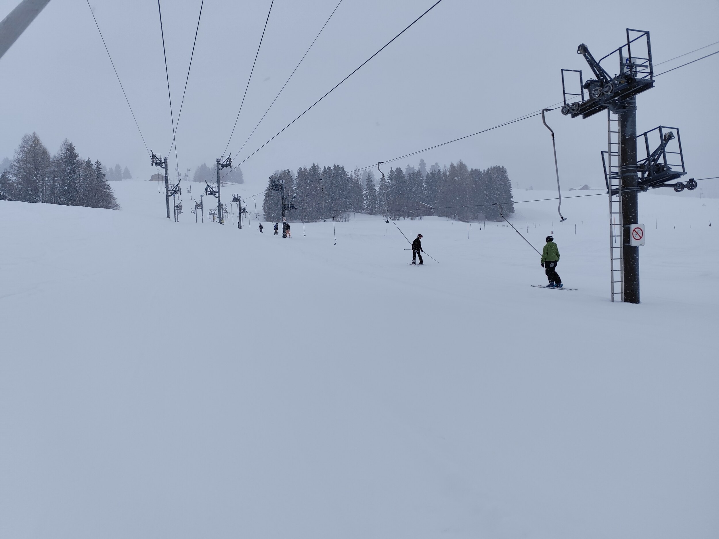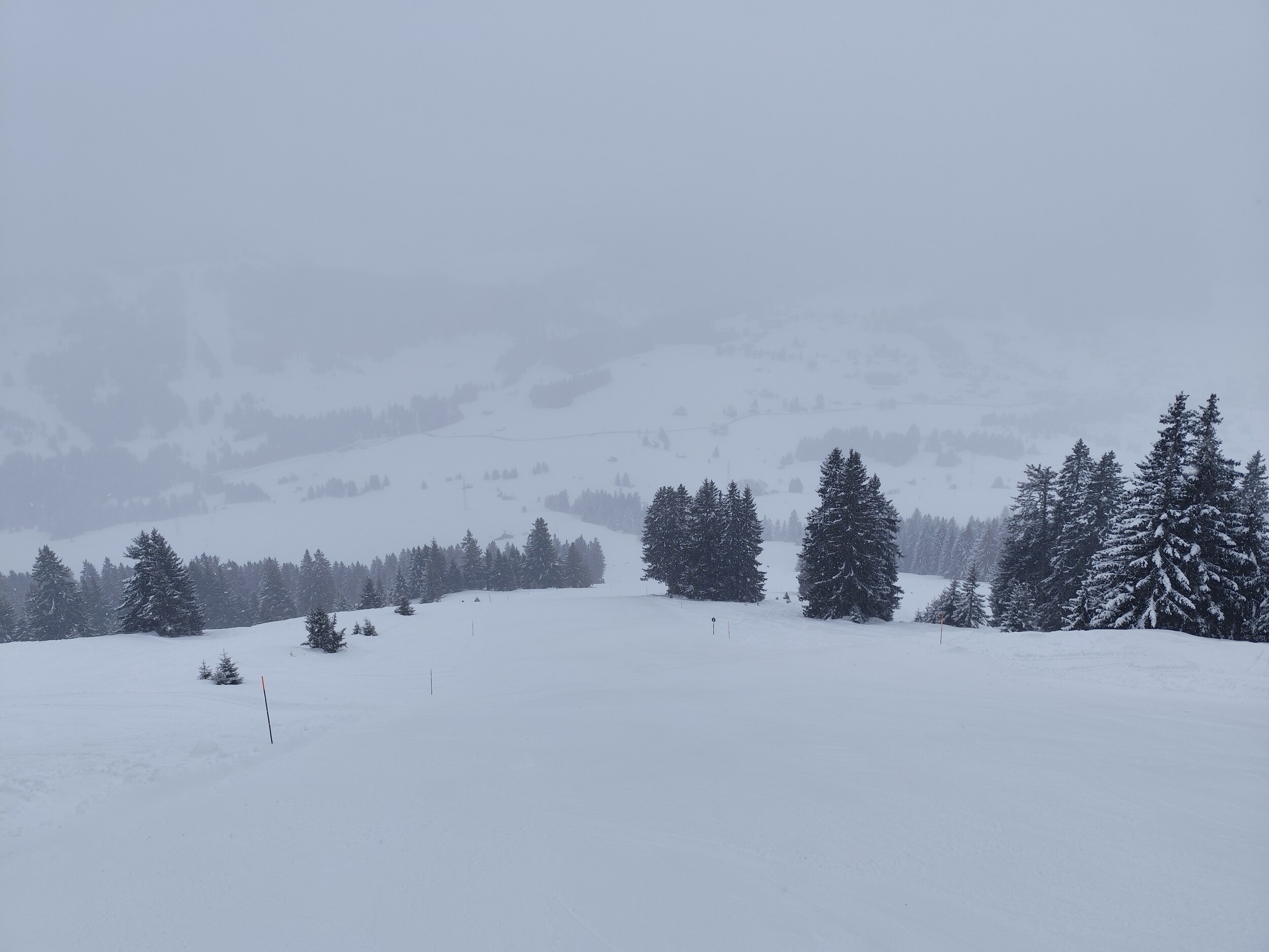 Also 9:00 in Villars an der Gondel bei nassem Schneefall eingestiegen. Oben wenig Sicht aber recht gut abmarkiert.