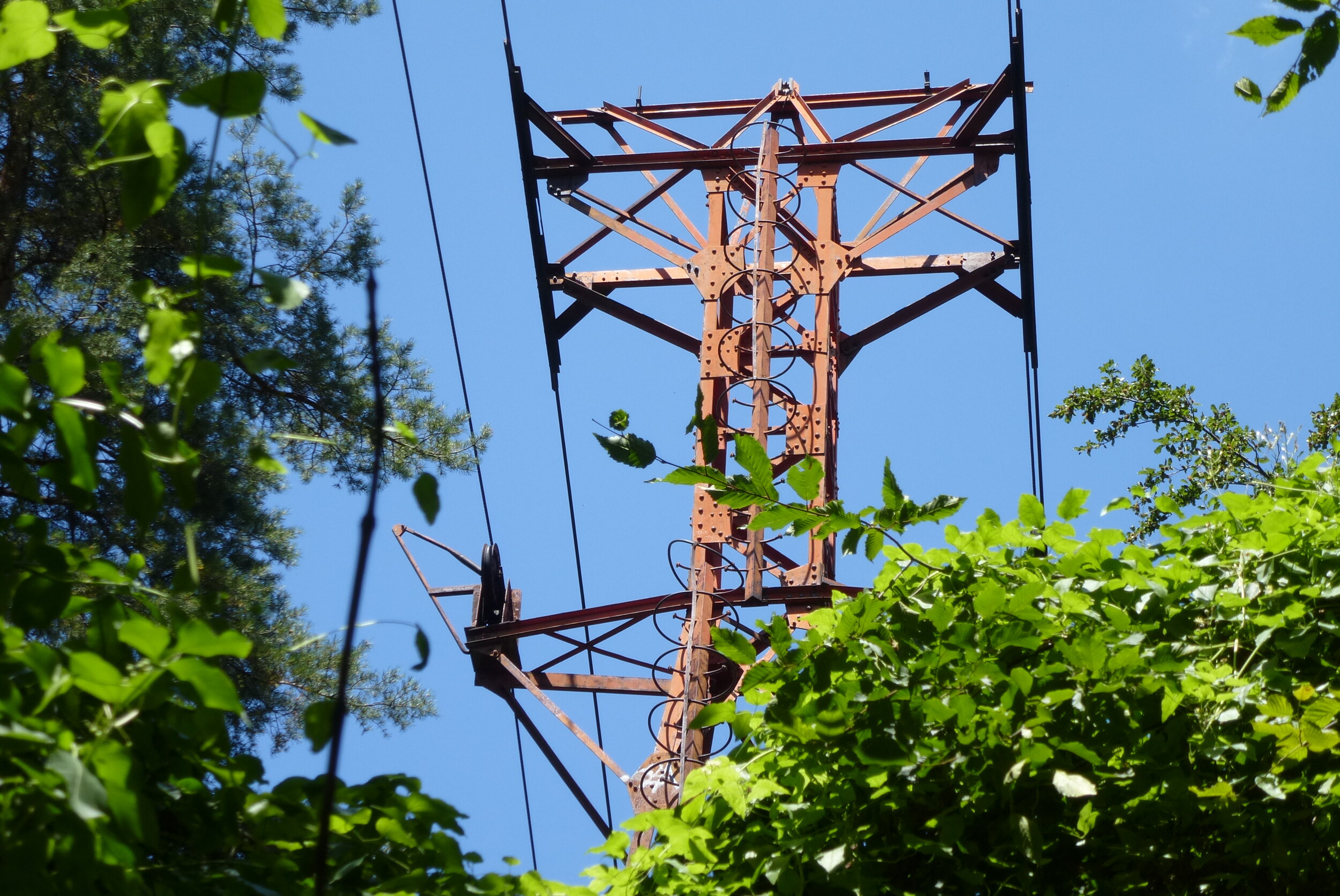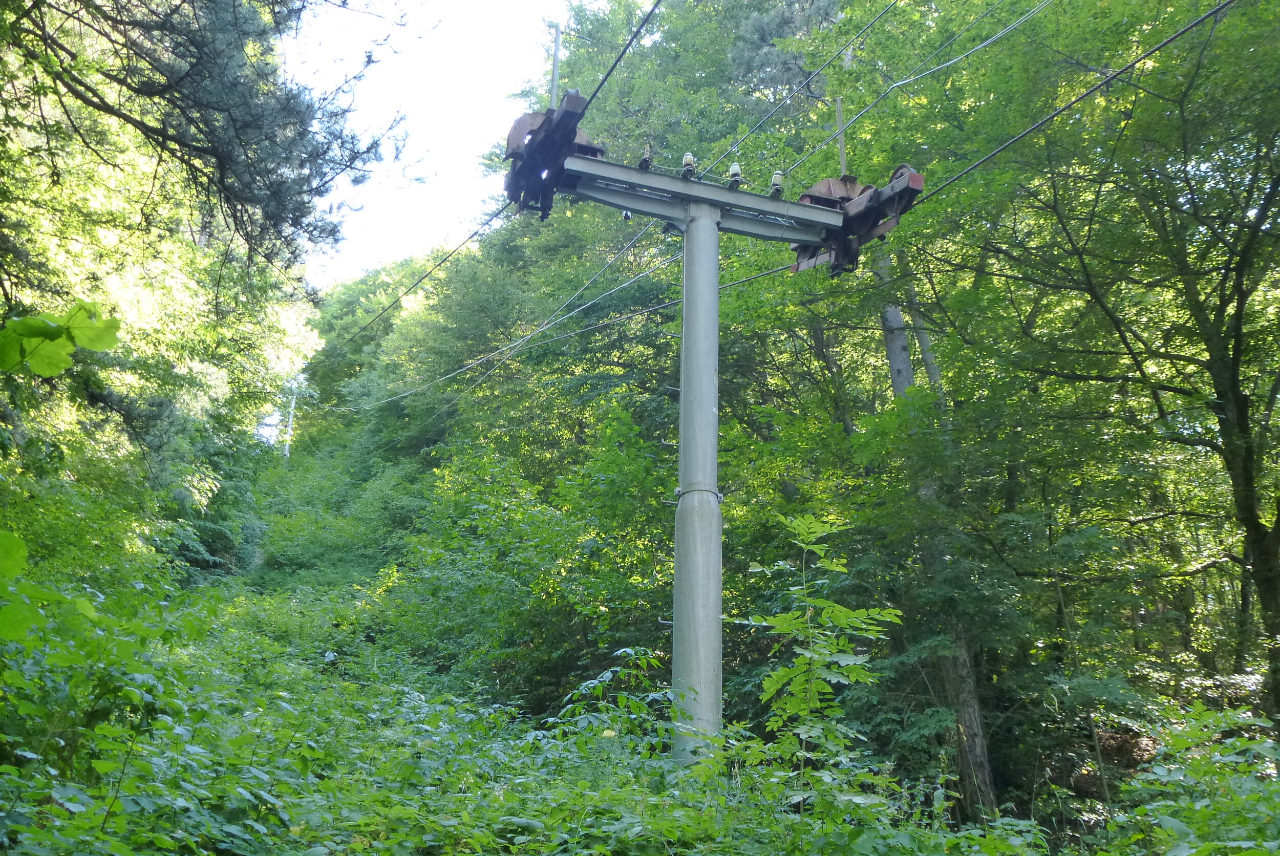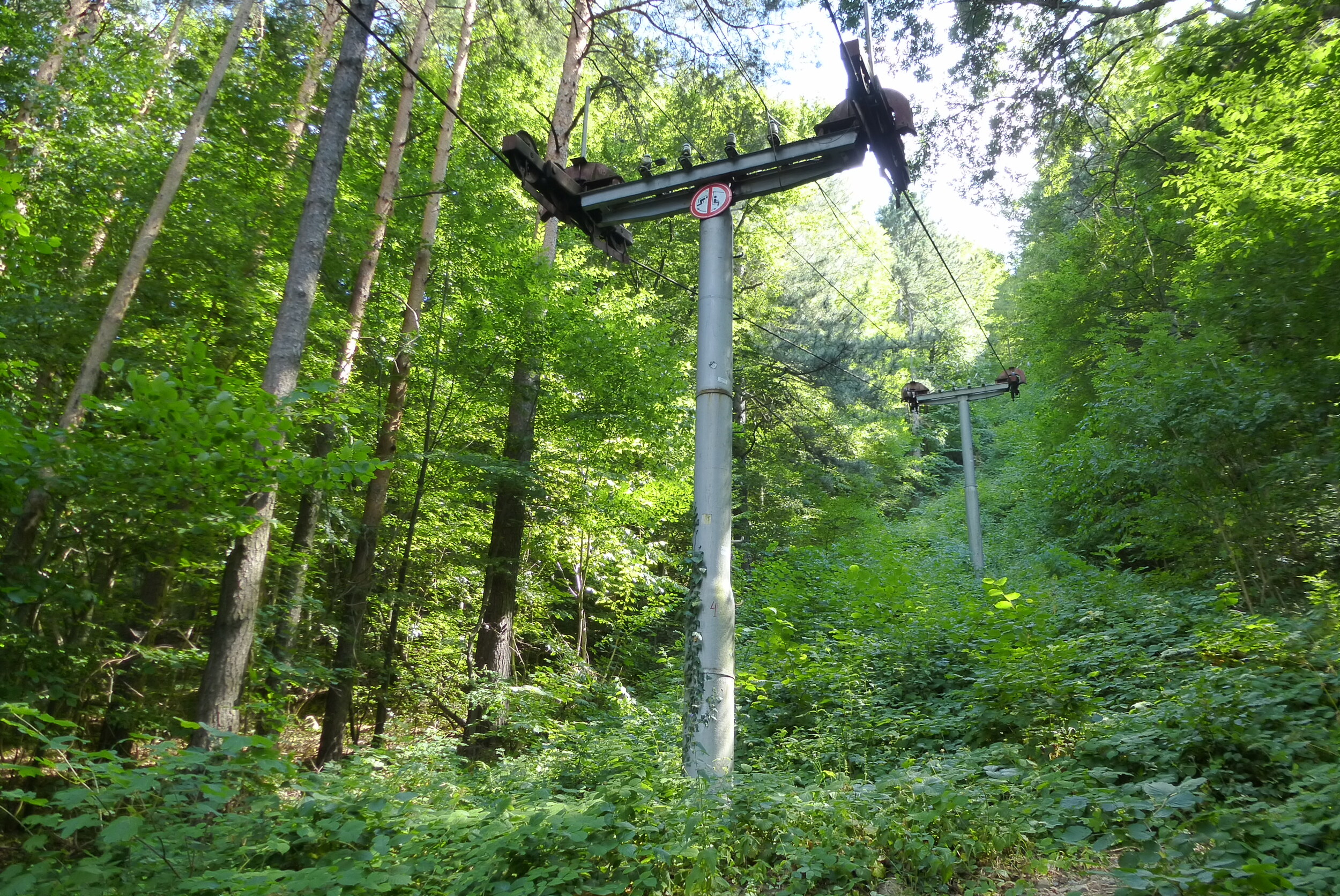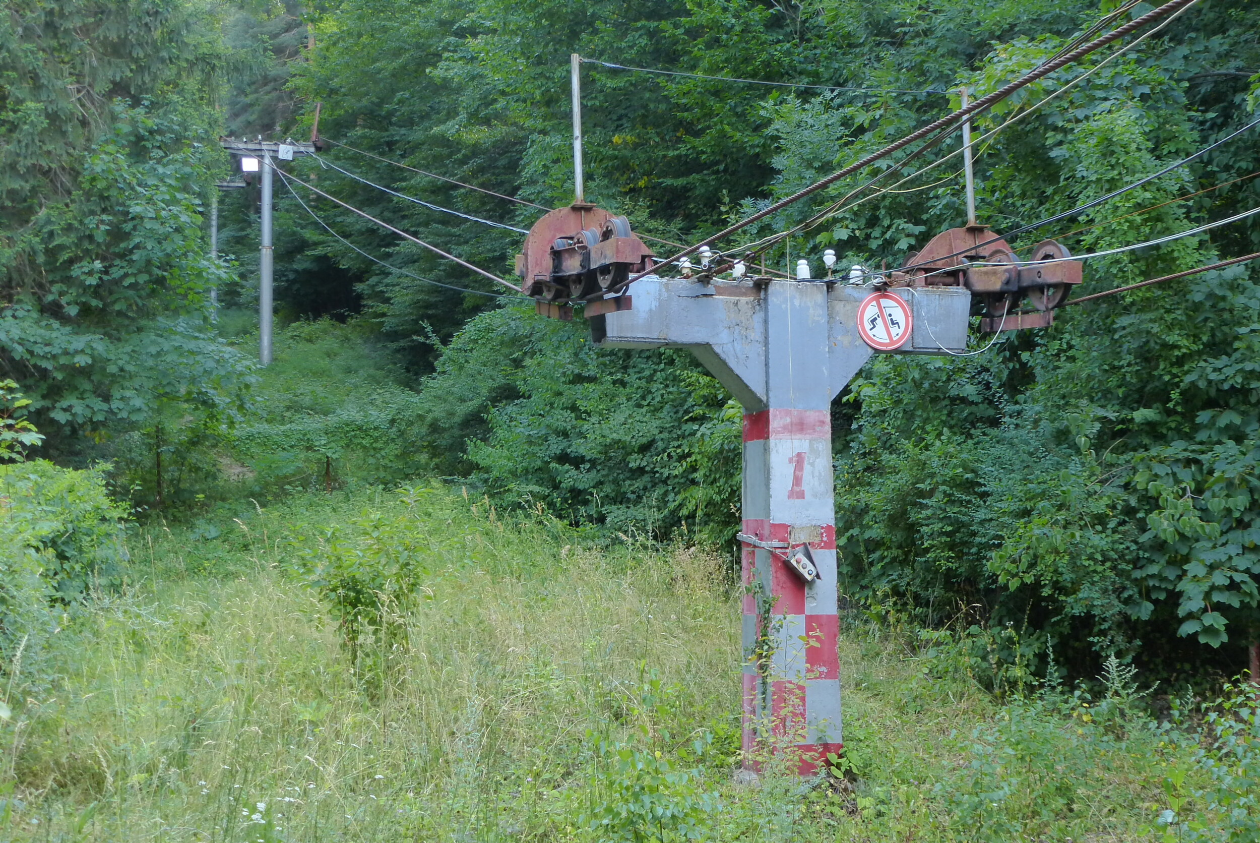 Begonnen habe ich am 21. 7. 2025 mit der seit Jahren stillgelegten ZUB Knyazhevo – Kopitoto, die 1962 von Girak gebaut und 1992 stillgelegt wurde (Bild von der Betriebszeit: https://www.jhpostcards.com/products/na ... ria-unused). Auch nach mehr als 30 Jahren ist bis auf die Kabinen fast alles noch vorhanden. Die 1904 m lange Strecke mit acht Stützen überwindet 593 m HU. Ich habe die Talstation (Interieur kann man nicht betreten) und die ersten vier Stützen gesehen, weiter oben verläuft die Strecke schon steil den Hang hinauf. Nur die Stütze Nr. 1 kann man gut fotografieren, die anderen – besonders die Stütze Nr. 3 – sind dicht von Bäumen umgeben.
