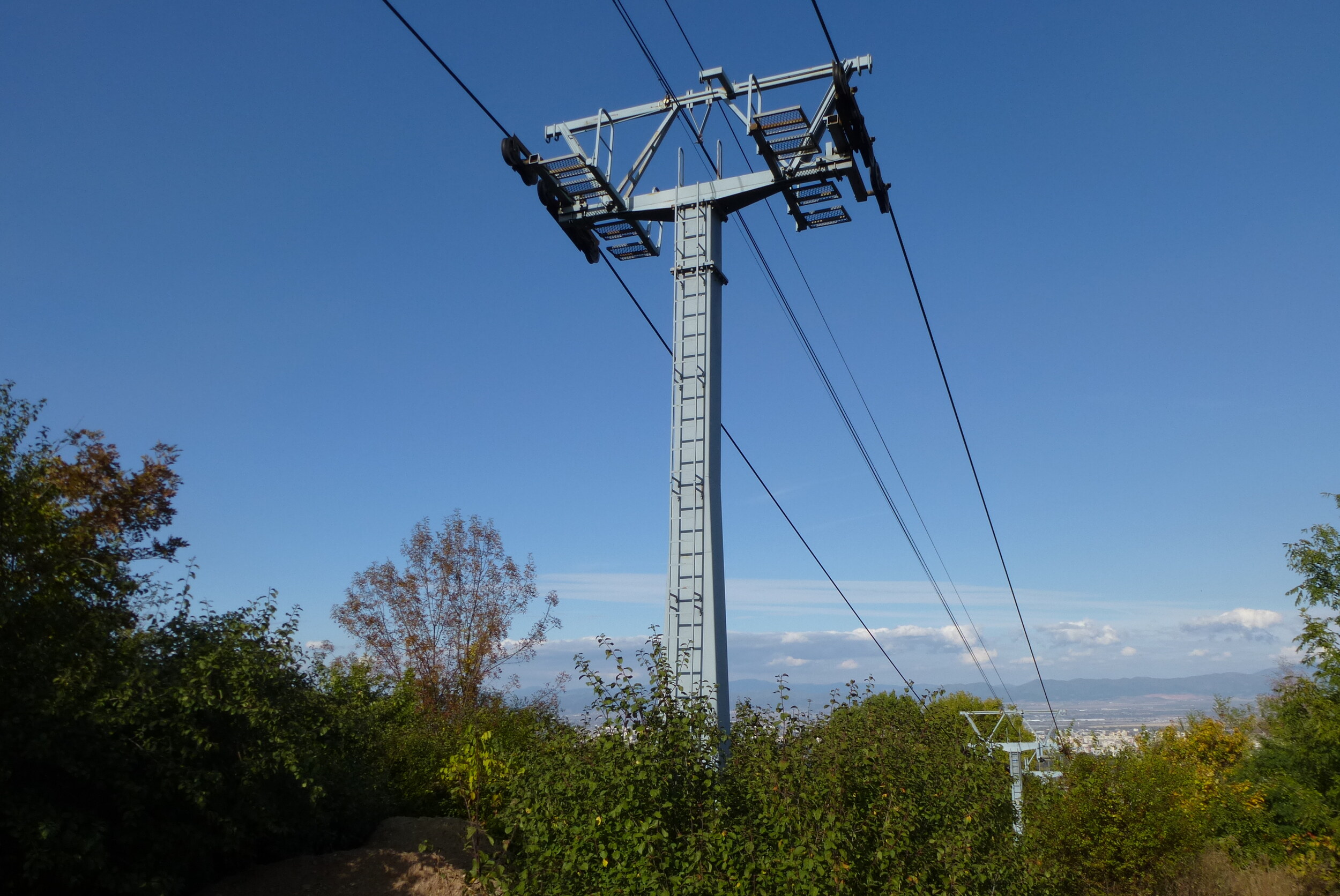 Mein 2. Termin in Sofia war vor drei Wochen und am 15. 10. konnte ich nachmittags – wieder bei schönem, sonnigem Wetter – die 6EUB Simeonovo – Aleko, die Zubringerbahn zum Vitosha, anschauen. Die 6164 m lange Bahn mit 1077 m Höhenunterschied und zwei Teilstrecken (zudem die 2. Teilstrecke zusätzlich eine einseitige Mittelstation hat) ist nach dem Matterhorn Express und der Männlichenbahn die drittlängste Seilbahn Europas und wurde 1983 von Doppelmayr gebaut. Auch das war damals eine topmoderne Bahn; selbst in ganz Österreich gab es erst drei solche 6EUBs (Valiserabahn, Weißsee-Seilbahn und Silvrettabahn). Auch die Anzahl der Stützen (64 Stk) und der Kabinen (250 Stk) sind beachtliche Nummern. Aufgrund des technischen Zustands wurde der Betrieb jedoch vor zwei Jahren leider eingestellt, und es deutet nichts darauf hin, dass die Bahn noch einmal laufen wird. Somit kann man den Vitosha nur noch mit Auto oder Bus erreichen. Ich bin den unteren Teil der Strecke bis zur Stütze Nr. 10 abgegangen, bevor sie steiler in den Wald hinaufführt.