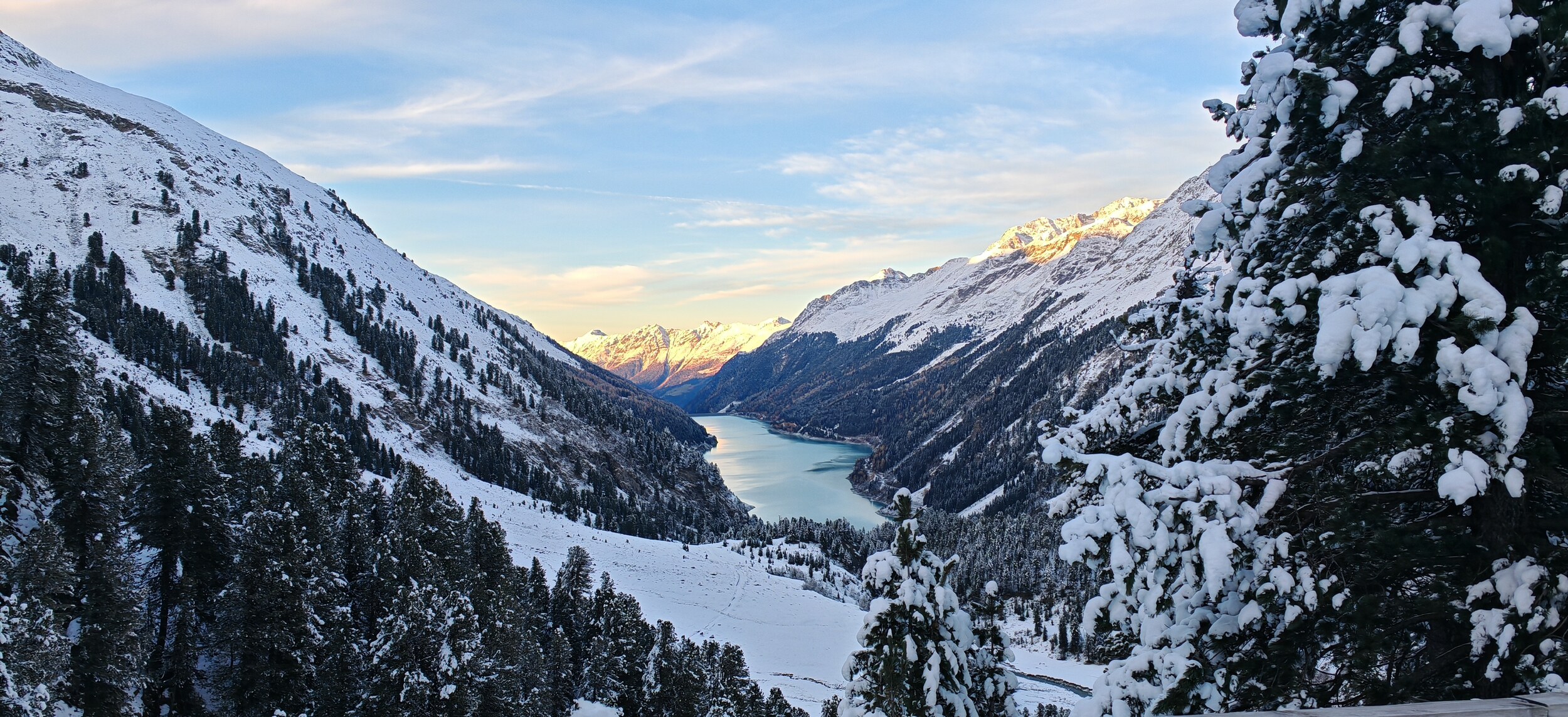 Blick zum Reschensee, in Schöneben sind auch schon weisse Streifen zu sehen.