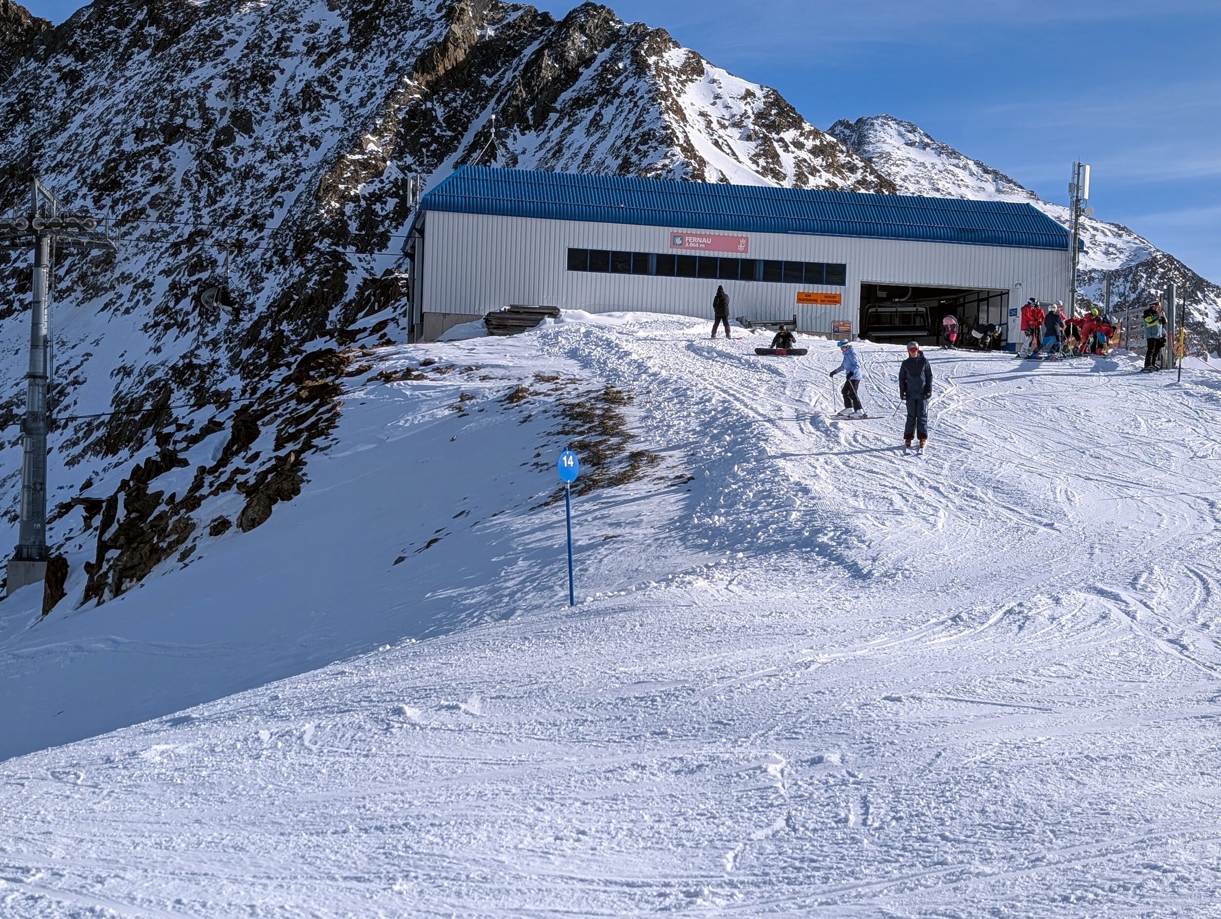 Die Abfahrt zum Wildspitzsessel ist dieses Jahr leider deutlich schlechter geworden, weil man nicht mehr direkt vom Ausstieg des KSB Eisjoch hinkommt, sondern erstmal ein ganzes Stück Richtung Jochdohle schieben muss.