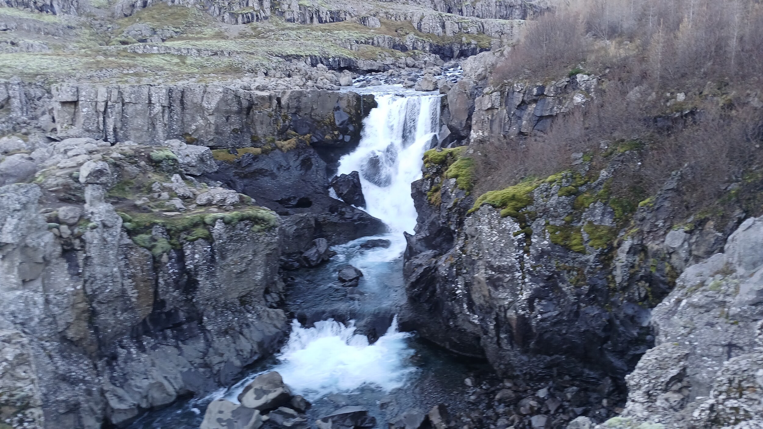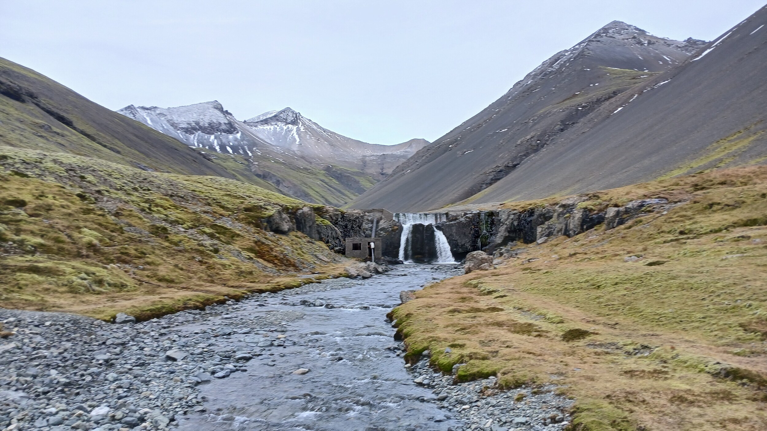 Zunächst ging es an ein paar kleine Wasserfälle. Hier ein Wasserfall mit einem kleinen Wasserkraftwerk, der dem Skútafoss vorgelagert ist.