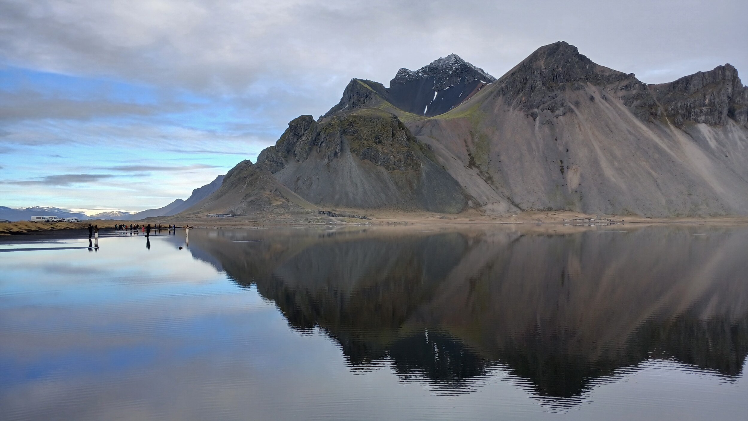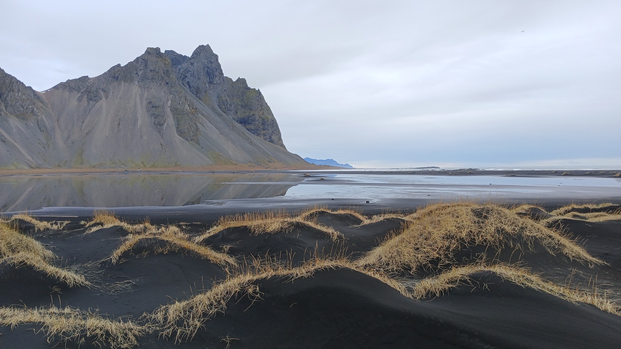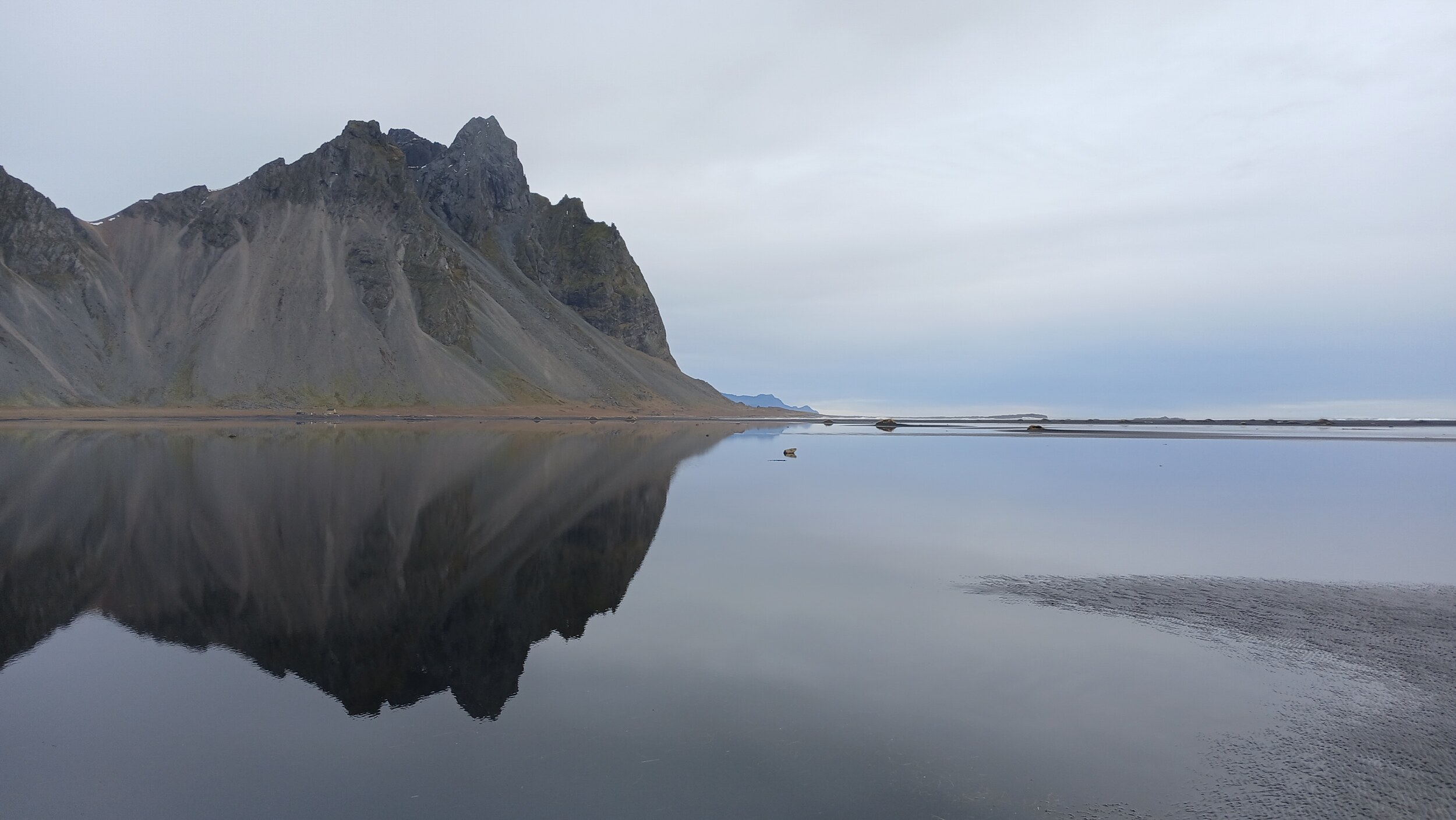 Toll sind in Stokksnes vor allem die Spiegelungen. Hinter dem schwarzen Strand liegt ein ganz flacher See. Dieser ist gerade mal wenige Zentimeter tief, sodass man auch sehr gut persönliche Spiegelbilder erstellen kann