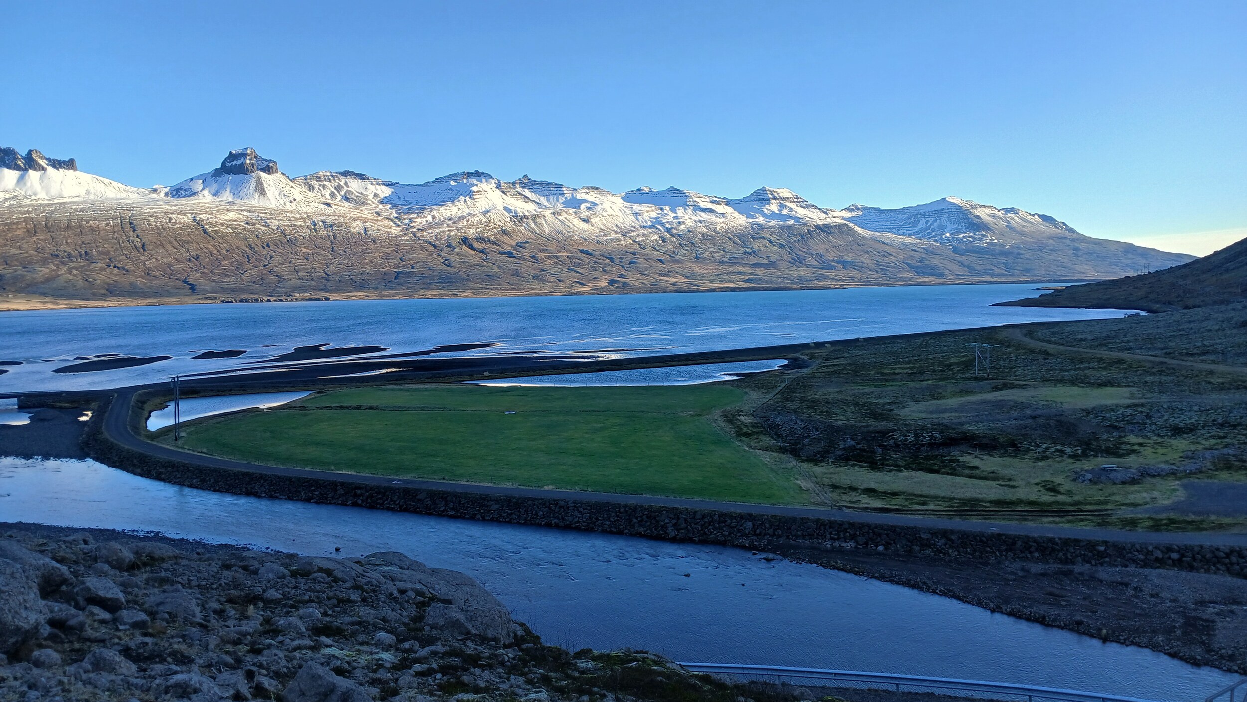 Die Fahrt führte ab Höfn wieder über die Ringstraße gen Norden. Hinter Djúpivogur folgten wir aber dann nicht mehr der Ringstraße, die noch um einige Fjorde herum weiter laufen würde, sondern nahmen mit dem Öxi-Pass eine Abkürzung in Richtung Norden, die gut 70km ggü. der Ringstraße spart. Die gewonnene Zeit nutzen wir dann am Nachmittag gerne noch in den herrlichen Vök-Baths kurz nördlich von Egilsstadir.