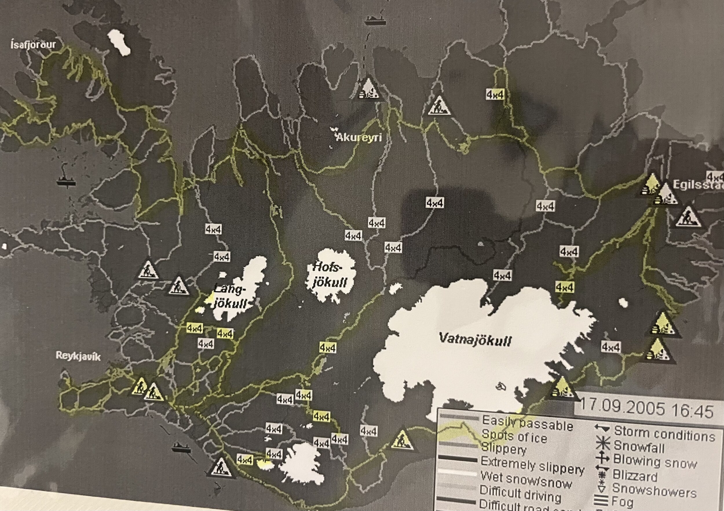 Wir hatten damals einen Toyota Landcruiser (oder so ähnlich) gemietet, bei Hertz oder Avis mit einem Standardmietvertrag der das Befahren unbefestigter Straßen ausschließt. Passt wohl nicht auf Island.