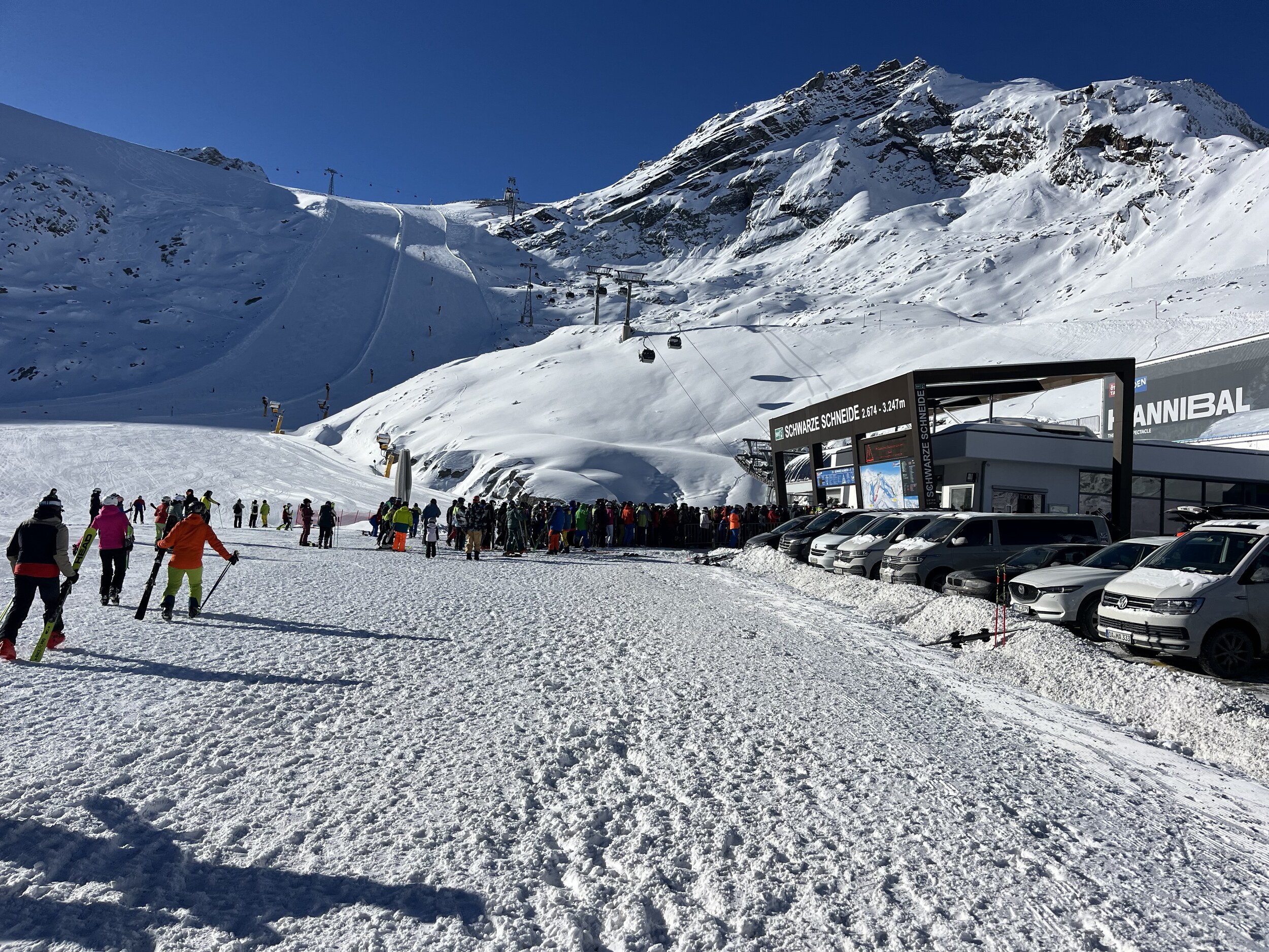 - Nerviger Stau vor dem Giggijoch Parkhaus, wir haben problemlos um 8:50 direkt an der Gaislachkogelbahn parken können. Der Stau endet unmittelbar hinter der Abzweigung.