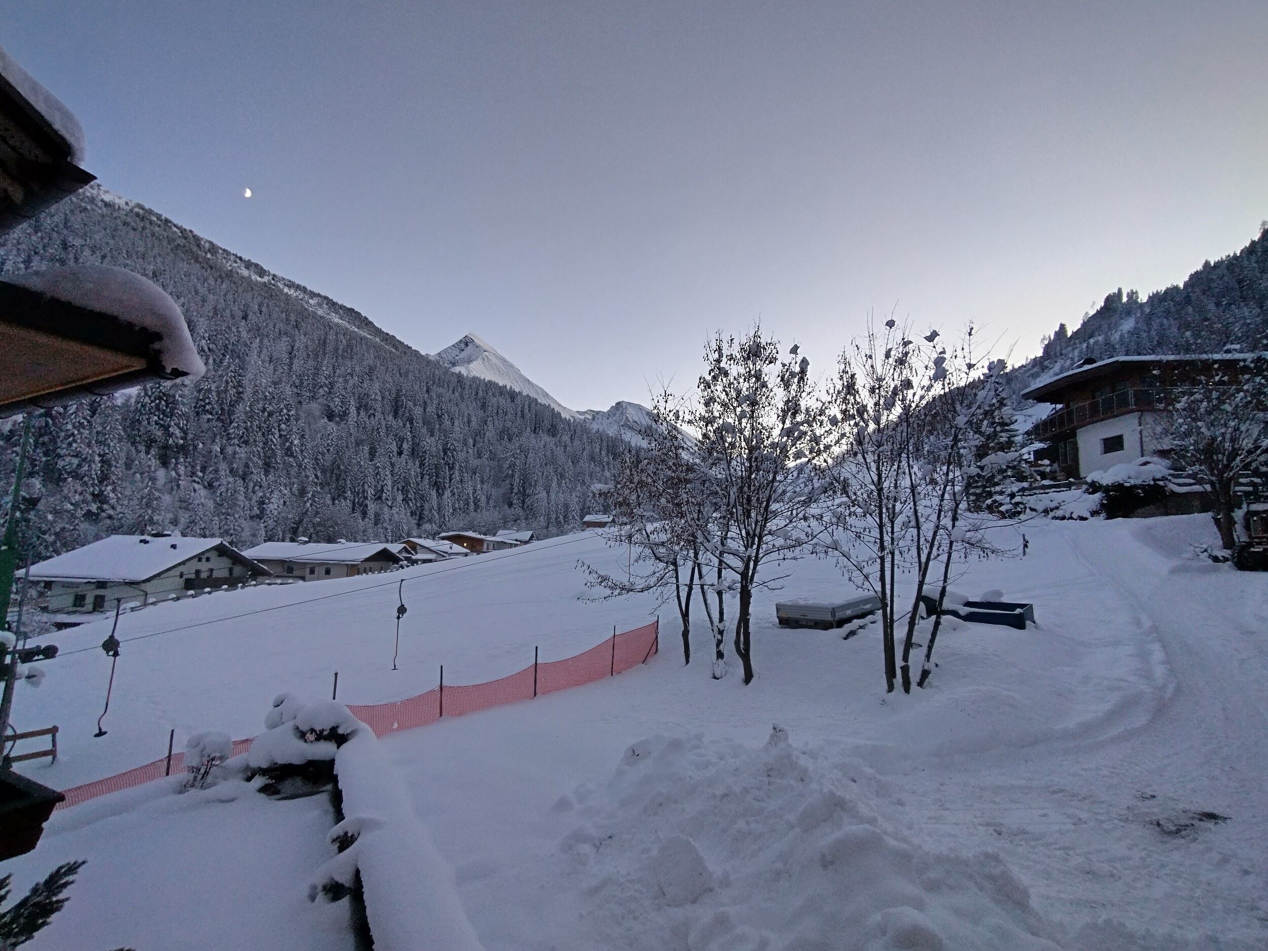 Aber irgendwann ist Schluss. Vom Zimmer habe ich den direkten Blick auf den Dorflift in Lanersbach. Würde mir gerade auch taugen, aber während solche Lifte auf Wiesenhängen anderswo schon lange in Betrieb sind summt hier eine einsame Schneekanone vor sich hin.
