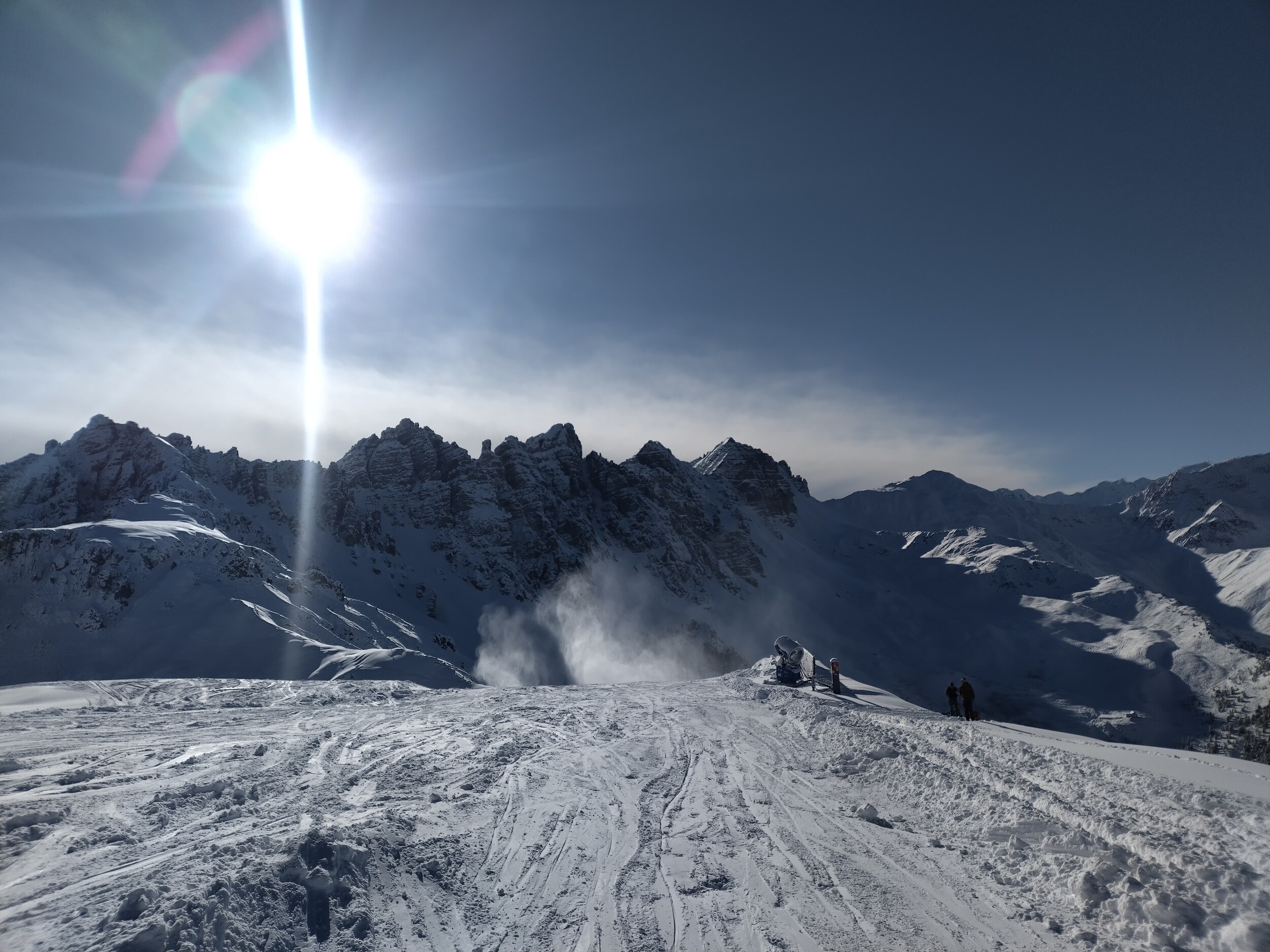 Der oberer Teil der noch geschlossenen Damenabfahrt leider auch viel schlechter als am Vortag, der neue Kunstschnee ist irgendwie harschig, und es hat viele Raupenspuren.