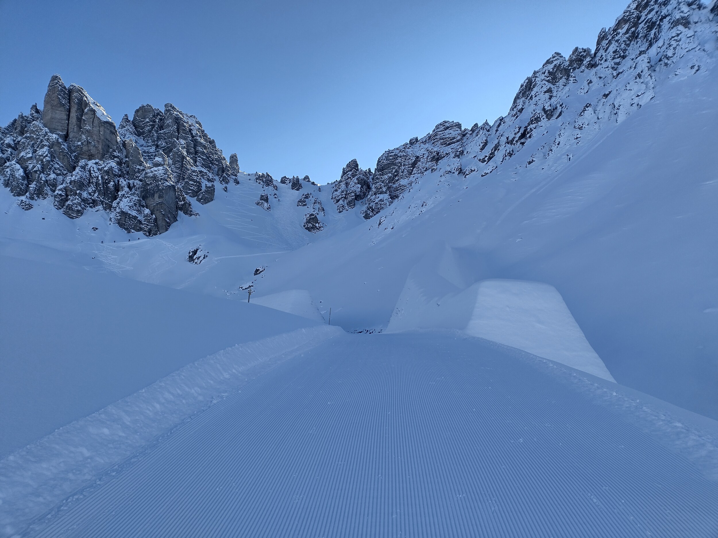 Die Raupenspuren auf der Damenabfahrt ziehen sich bis unten durch, und graben dabei schon steine aus. Dafür ist unten der Maschienenschnee nicht gepresst sondern pulvrig und fährt sicht ganz gut.