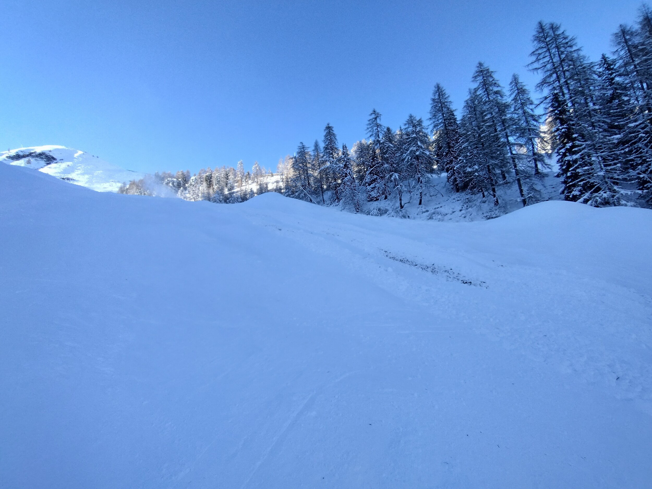 Die Pisten sind deutlich härter als ich bei Neuschnee erwartet hättet, aber sehr griffig. Neben der Piste geht auch einiges, auch wenn sich Bodenkontakt nicht ganz vermeiden lässt.
